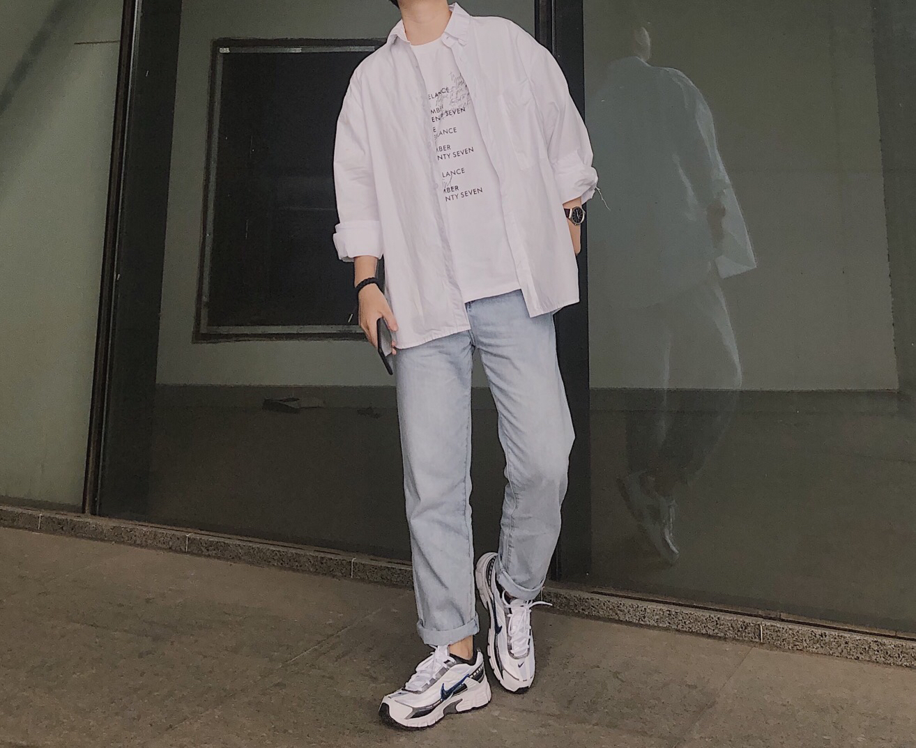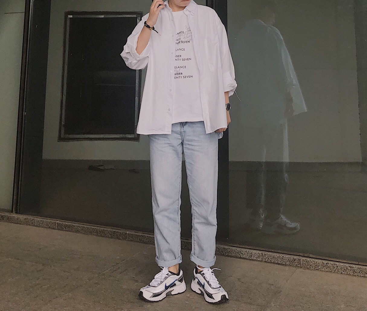 ✨今日穿搭 浅色水洗牛仔裤 白色衬衫 白色字母T nike老爹鞋 —————————————— ✨不得不说 水洗的浅色牛仔裤搭配白色衬衫真的很夏天 而且永不过时 选择了黑色字母的白色T打底 视觉上也更为干净利落 夏季的水洗牛仔裤薄薄的面料我真的是爱了 好看又百搭的首选