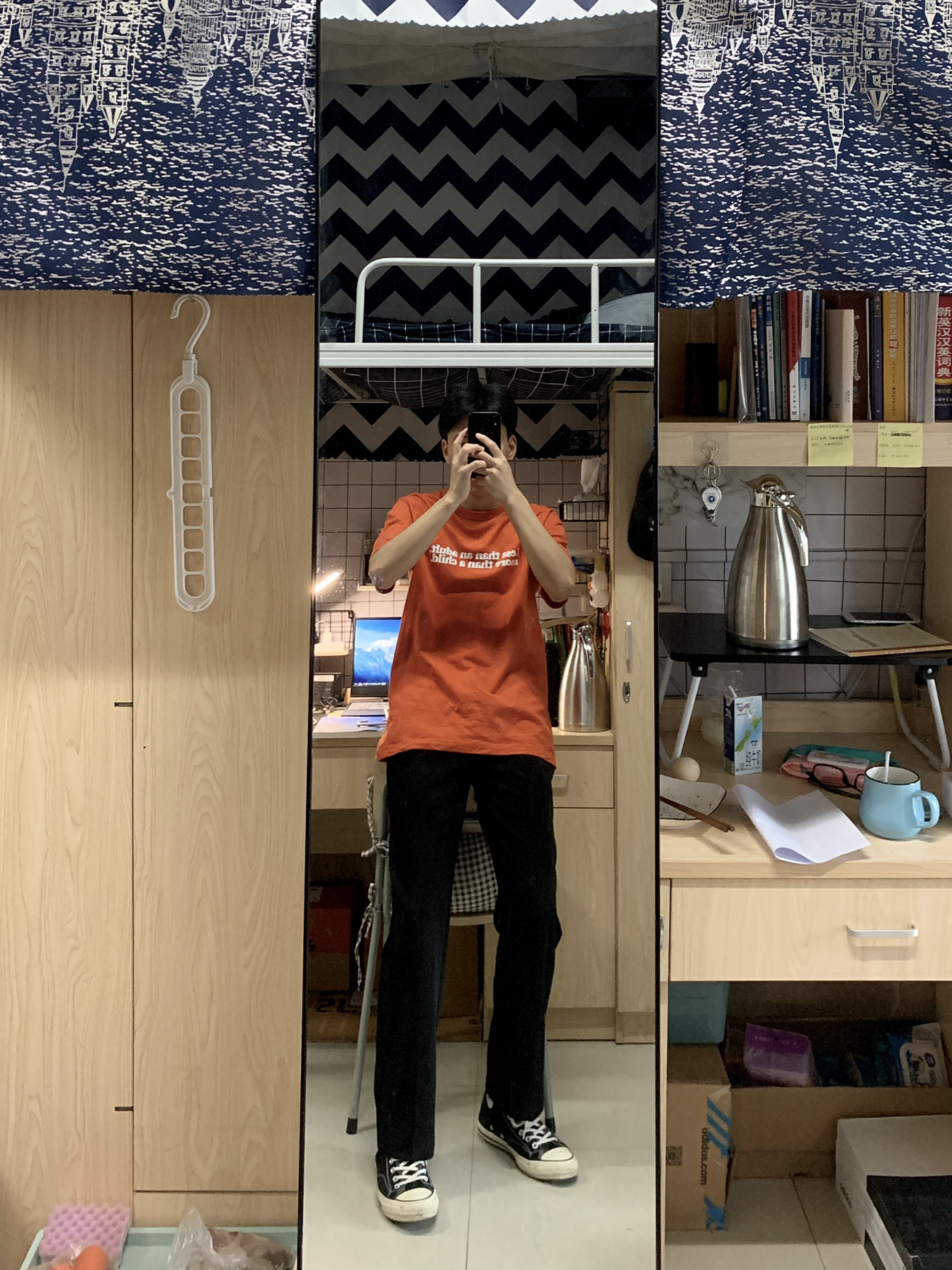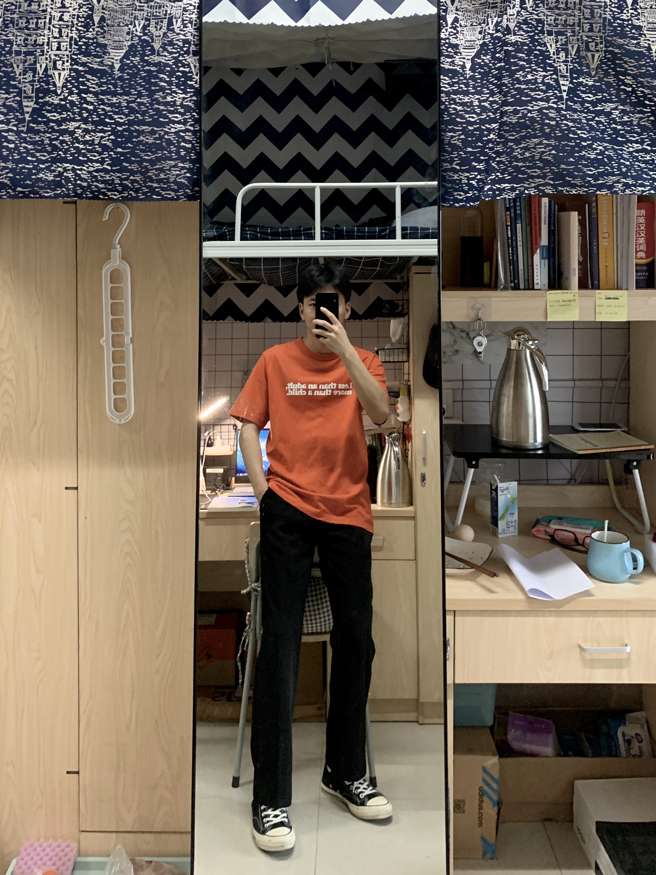 最近忙于考试 已经开始乱搭了😵手上还抱着室友刚拿到手的奖品🐶 👕:SUPERTOFU (SPTF) 19SS主题街头橘色短袖 豆腐家的衣服一直是值得回购 面料很舒适 橘色在夏天真的非常亮 夏天就该穿得鲜艳🏄 👖:某宝黑色西装裤 除了百搭还是百搭 👟:converse 1970s 黑高 鞋子中的百搭王