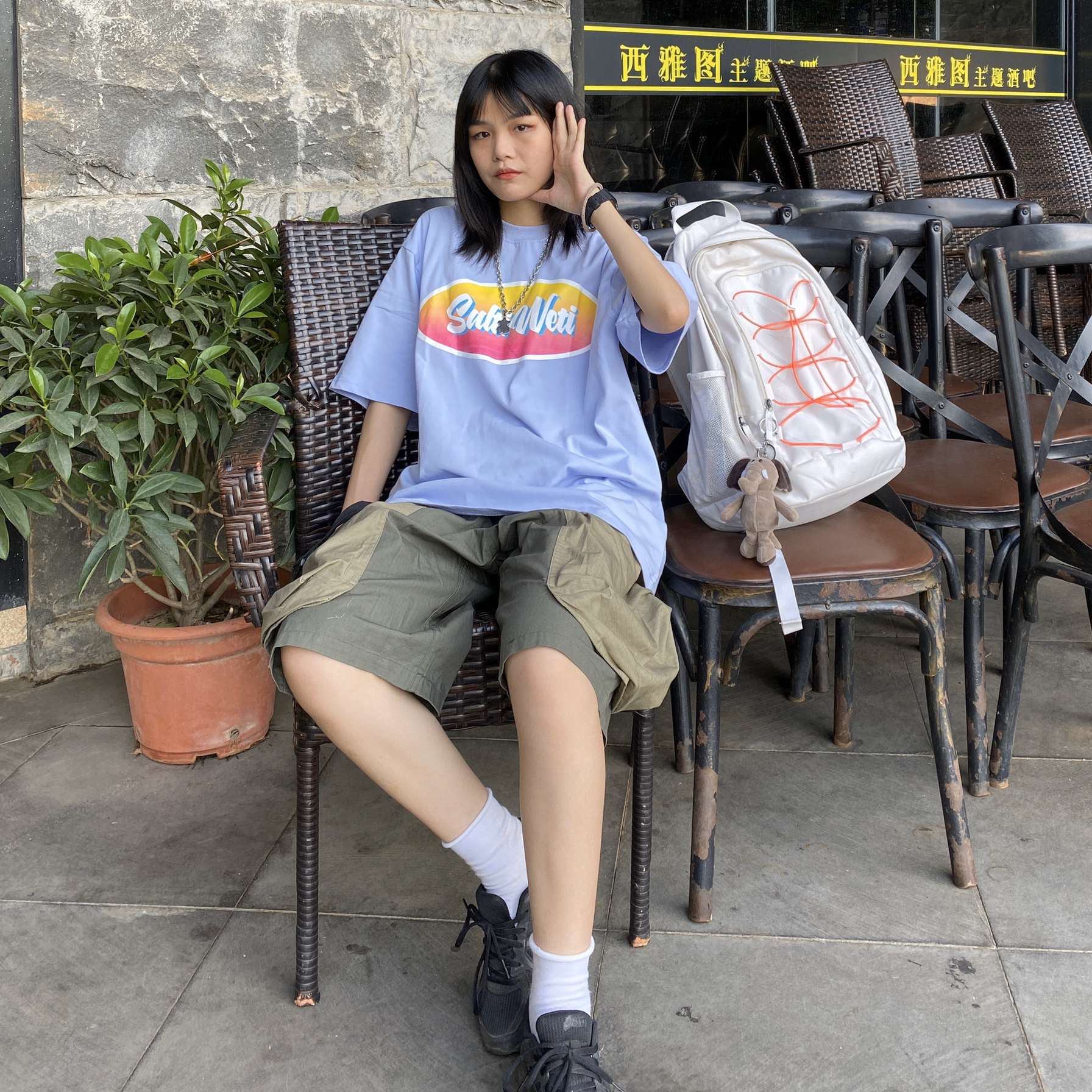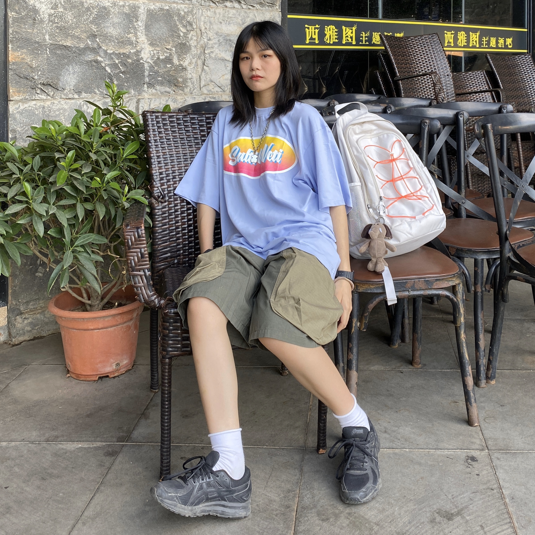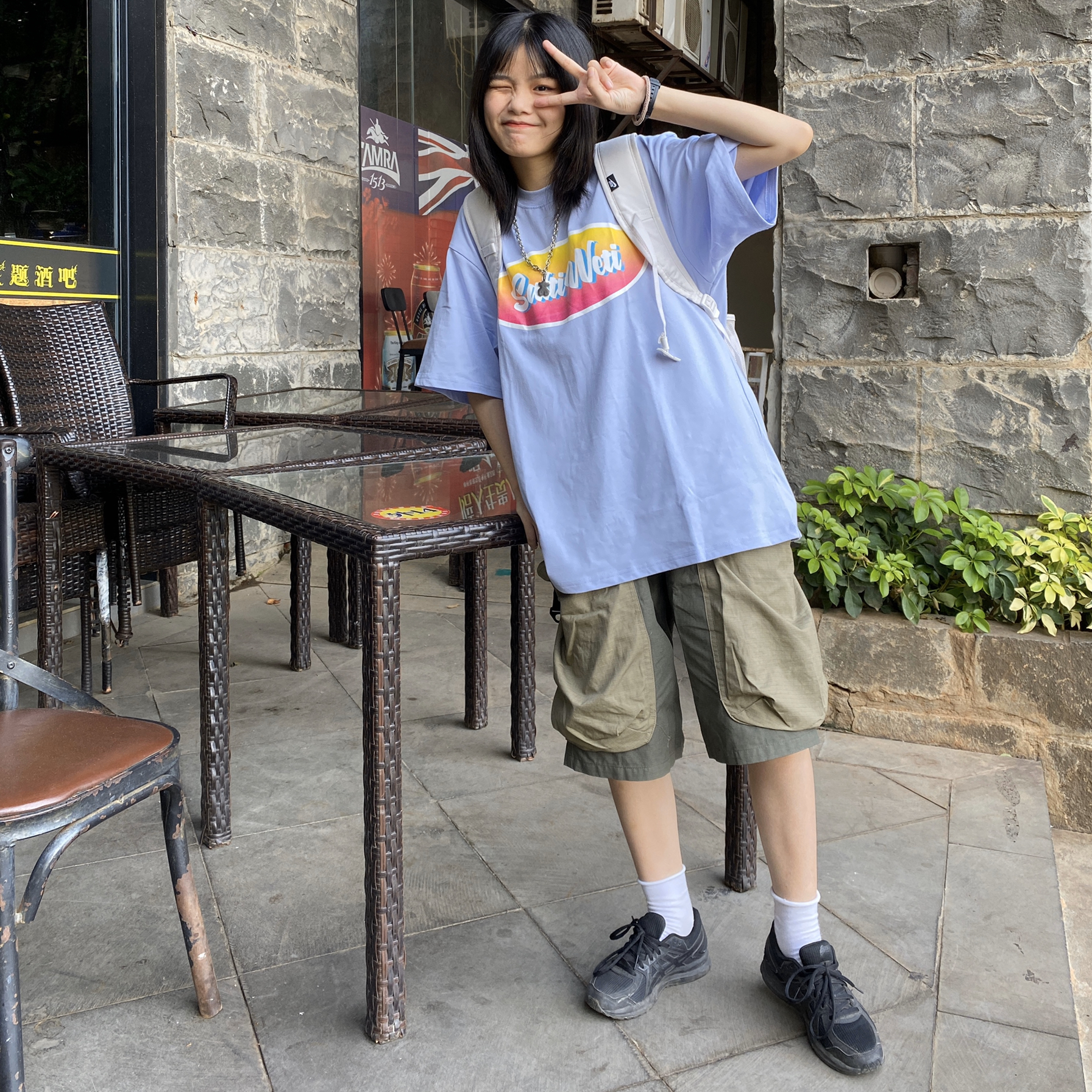 高考的兄弟姐妹们冲呀!! 👔 SaltiWeti store 今年夏天第一件紫色t恤 有点温柔的颜色~ 👖:SaltiWeti store 这件工装裤有两个超级大的口袋 显得很特别 超多人要链接 👟:亚瑟士 鞋子很舒适 全黑的很百搭 🎒:NIKE 白色的书包背着整体看起来更加有层次