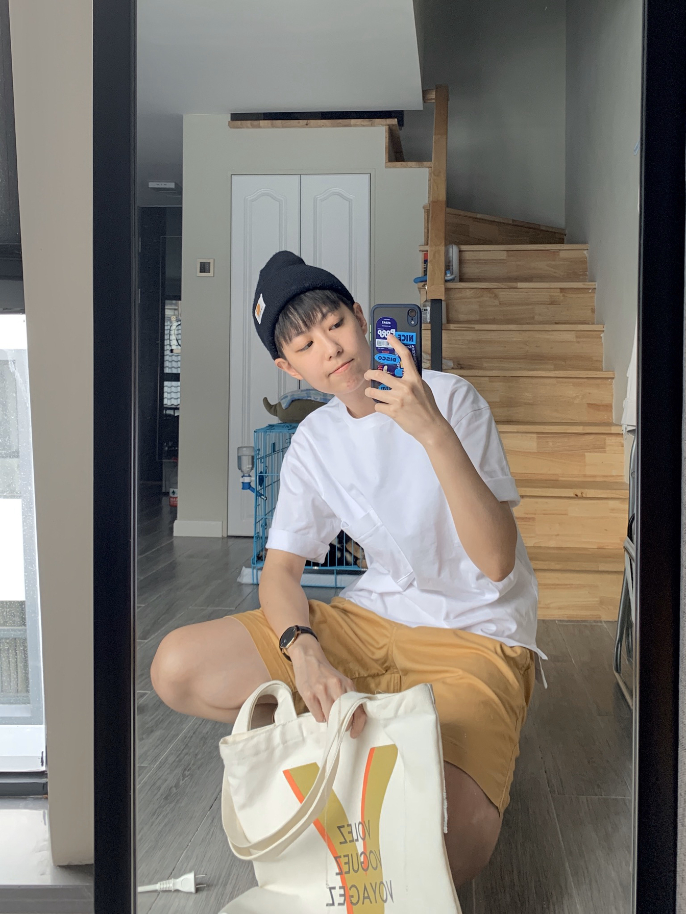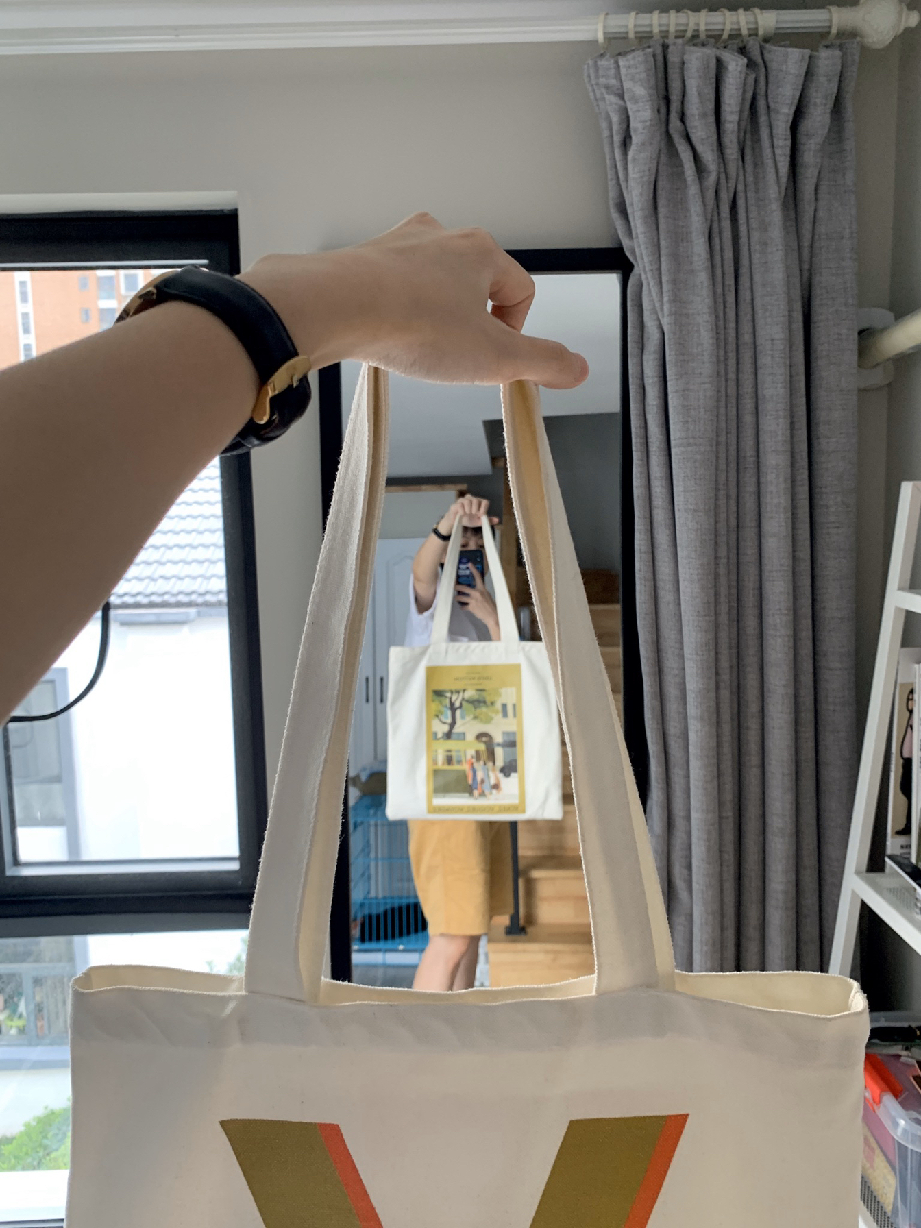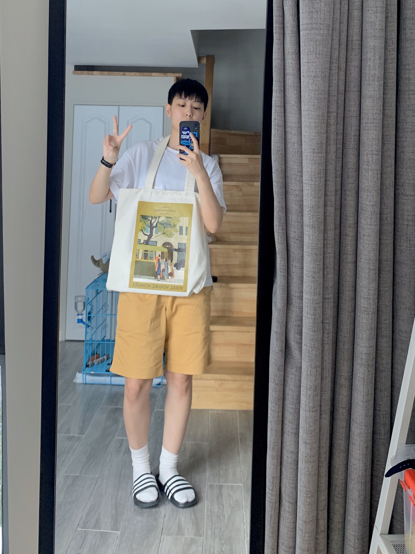 开始养狗之后,最费的就是衣服了。早上起床习惯穿着睡衣先遛一次狗,轻微洁癖不允许沾了狗毛的睡衣再次上床,所以每天都需要换两套衣服。 - 好多时候都处于啊~想穿的衣服还没洗呢,或是今天要穿什么啊好烦,盯着墙壁上挂着的帆布袋,想着帮它搭一套吧。 - 遛狗时不允许穿的白T恤,遛狗后再换上;曾经被我挂上闲🐟,被问询之后哭喊着不卖了的绝版短裤。 - 一个看展买书送的帆布袋;一双长袜一双拖鞋,空调房不冷,取快递...