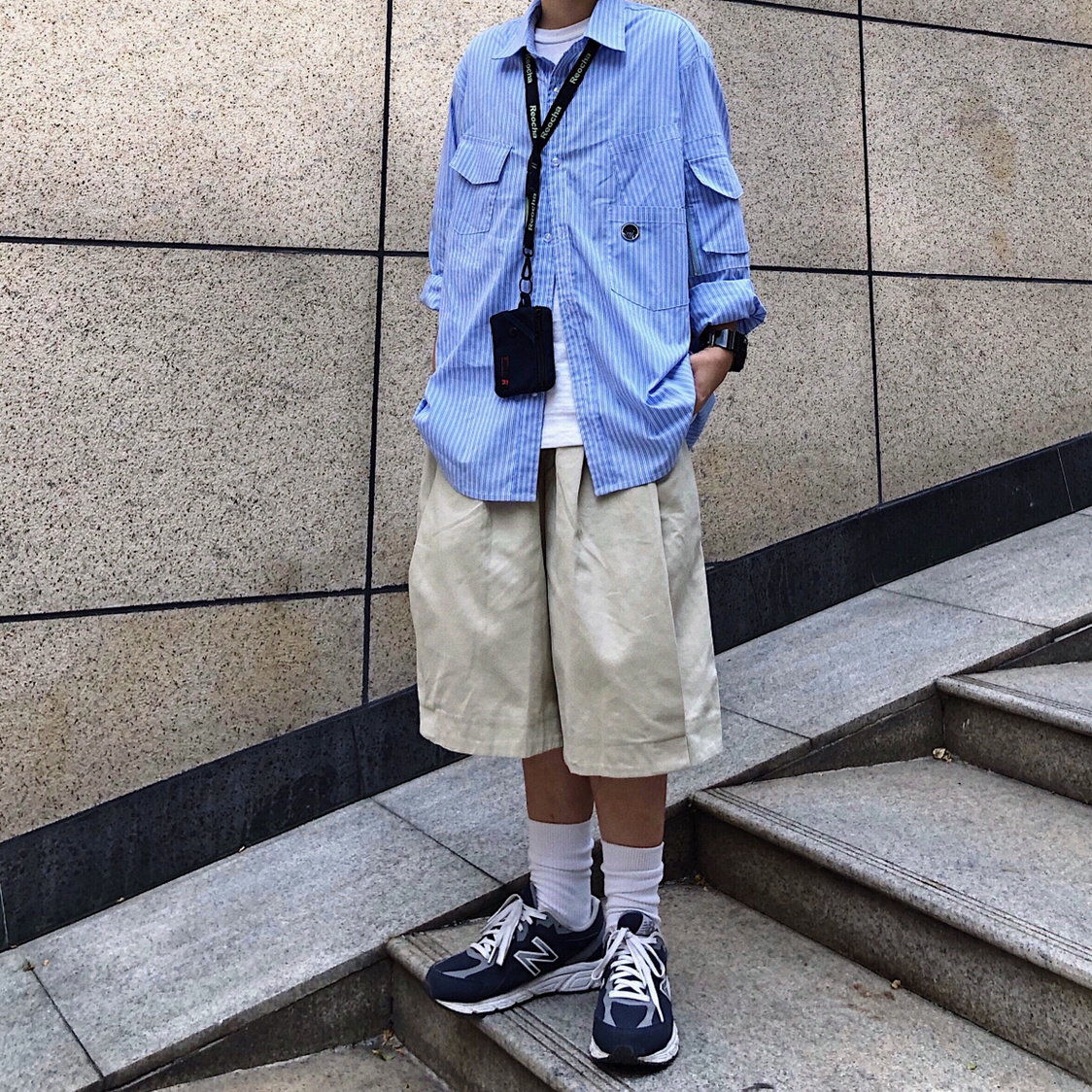 city boy日常穿搭,我们都在城市间来回穿梭,要保持良好的精神状态就要从自身表面入手,简约舒适为主却又不能略显单调。工作间里的冷气时常可以使我们带多一件衬衫作为保暖也可穿搭点缀。 👔:zakasnio(宽松的蓝色衬衫会显得人更加大气) 👖:Outofoffice在野(这条短裤夏天百搭,浅色系是夏天的首选) 👟:New Balance(与衬衫颜色呼应)