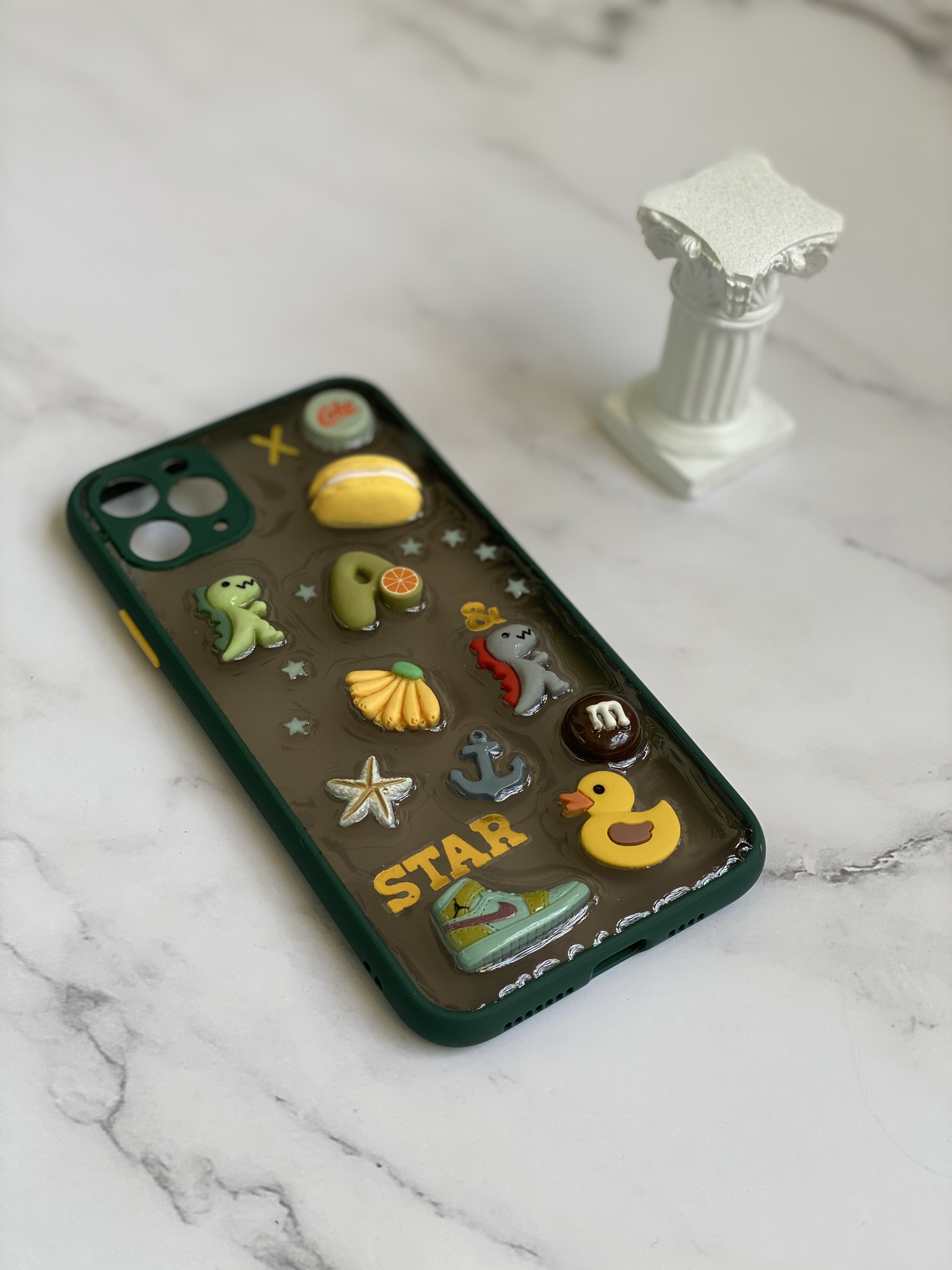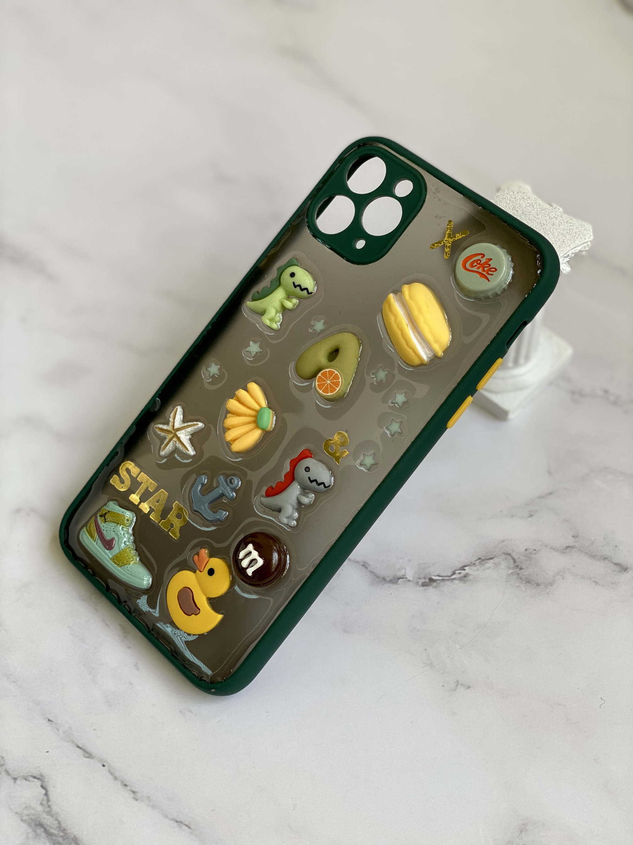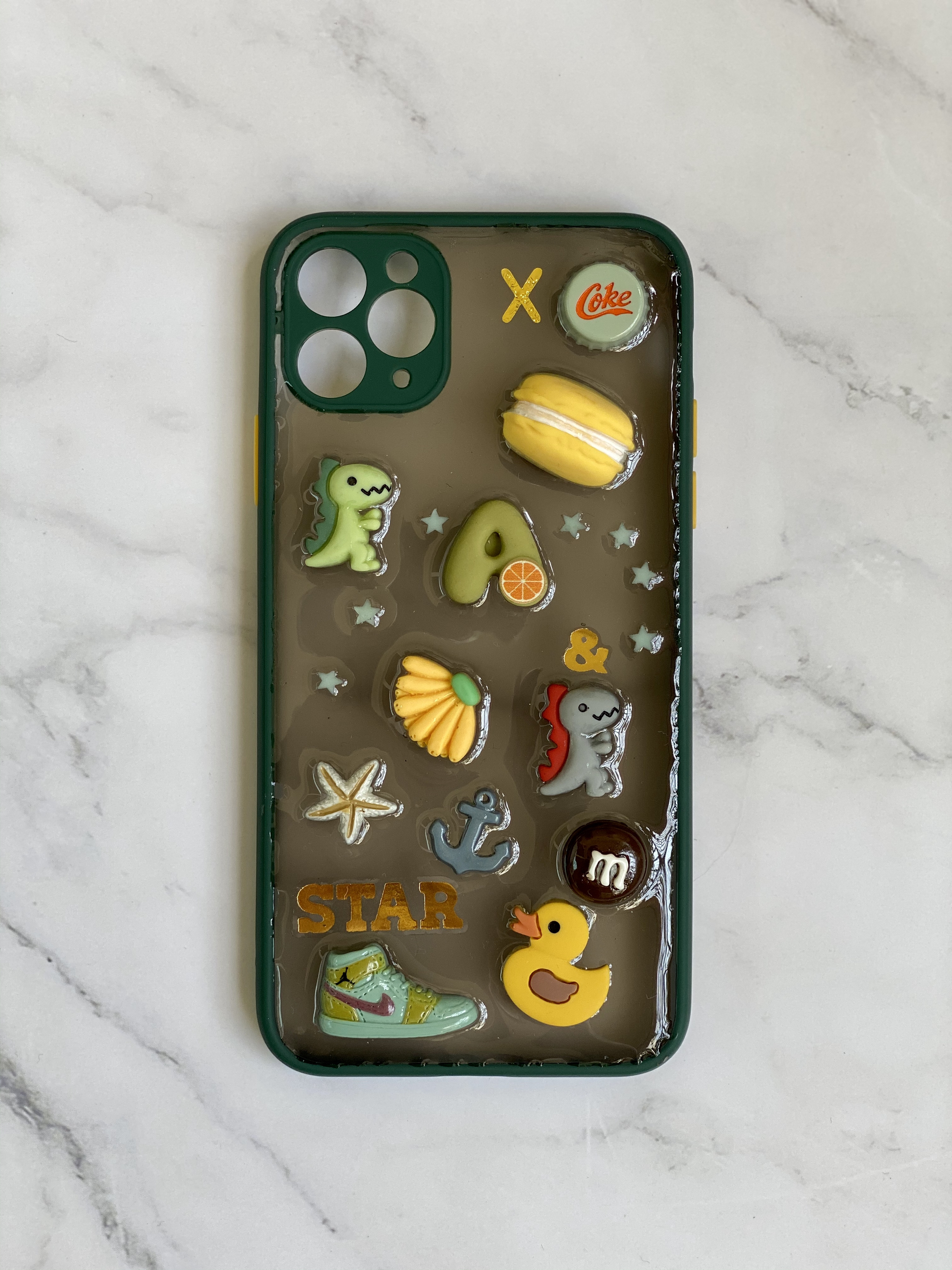 这两天收到朋友送的礼物 这手机壳也太好看了🤩 刚好适合自己的Iphone 11 pro max ✨ 由于我的手机也是暗夜绿 配上超级搭有没有? 重要的是❗️ 还是暗暗的透明壳子 丝毫不影响手机本身的颜色🤩 背面的小装饰也是我喜欢的类型🥳 尤其是恐龙和coke 简直不要太萌 而且这款手机壳 颜色还非常适合男生✨ 特别喜欢!!喜欢的小伙伴举个手吧💙 搭配你的手机 简直完美哟