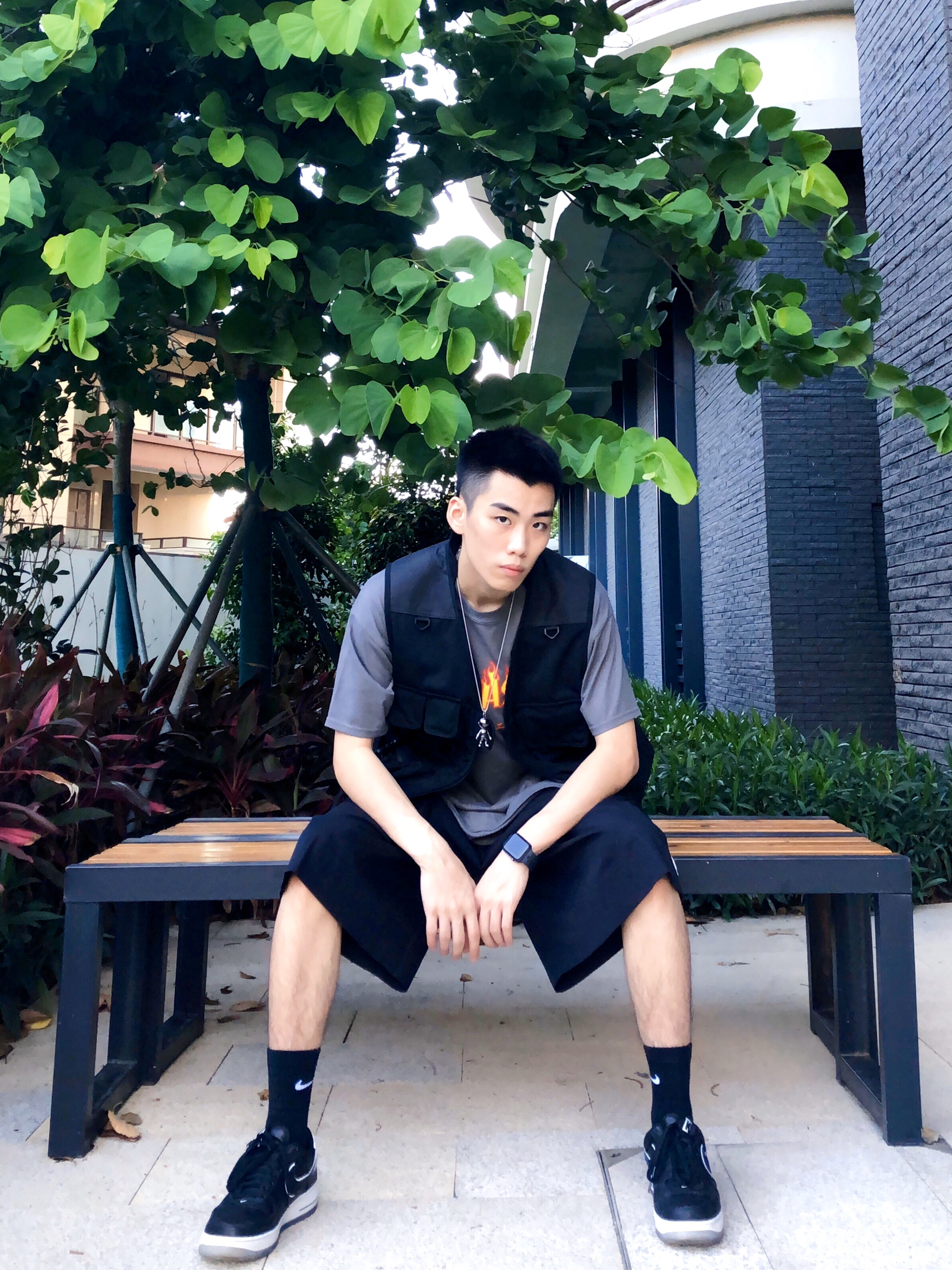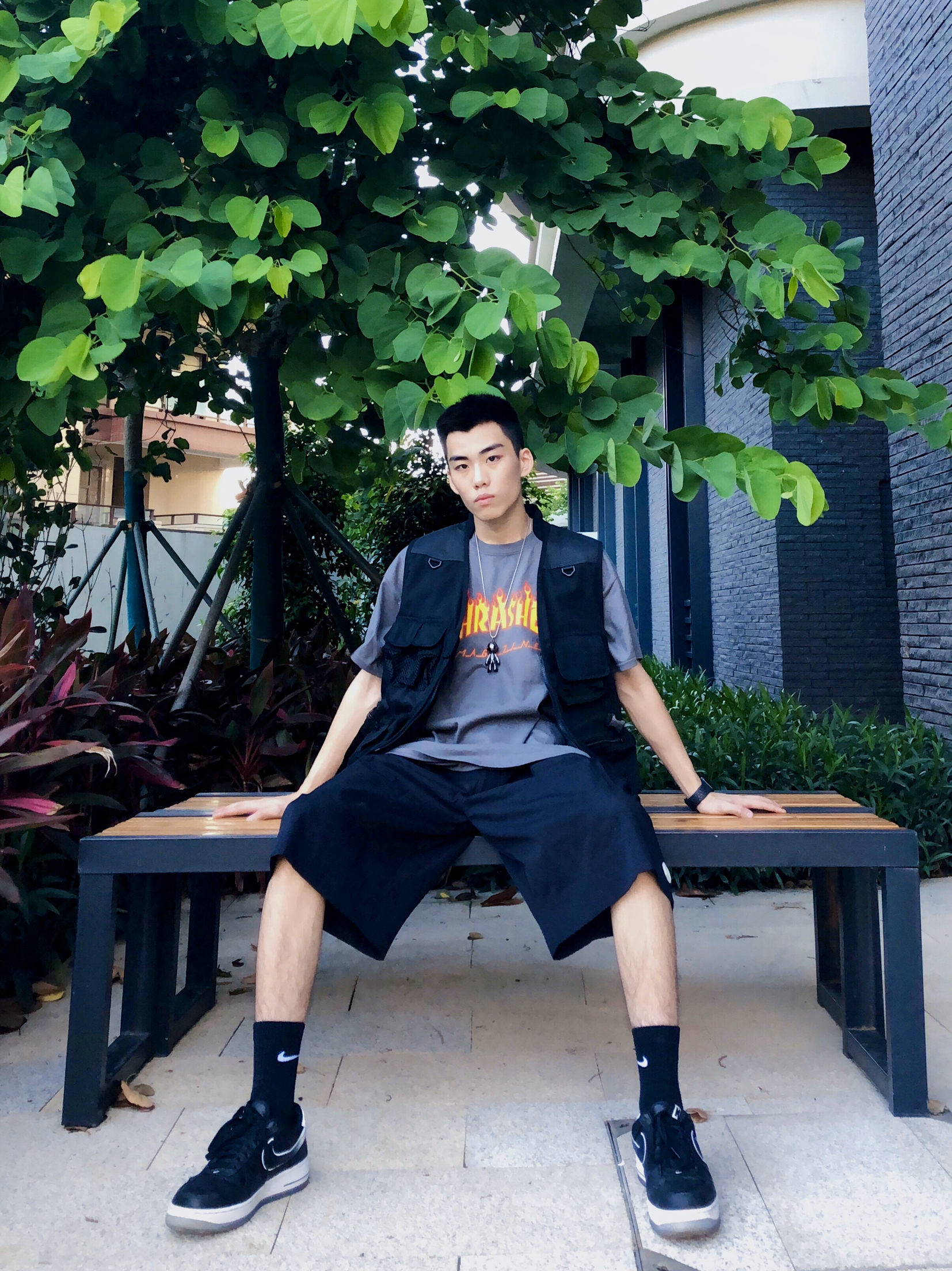 上衣:thrasher flame火焰 马甲:alien bang 短裤:no-bundle 鞋子:colin联名nike 夏日穿搭小搭配,短袖配马甲,叠穿效果不可缺少,暗色系搭配,灰色与黑色相呼应效果不显的很单调,学起来你就是街上最靓的仔☑️