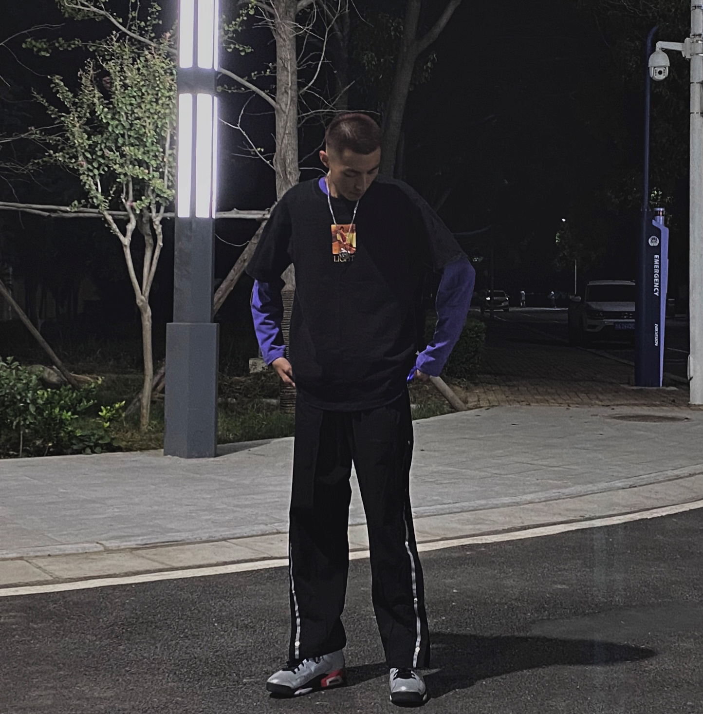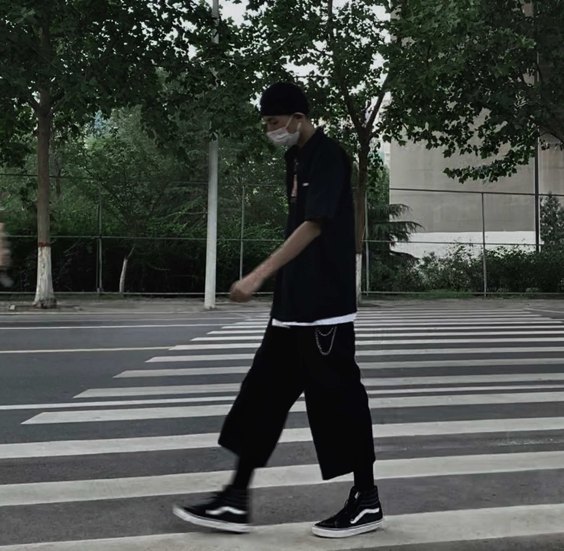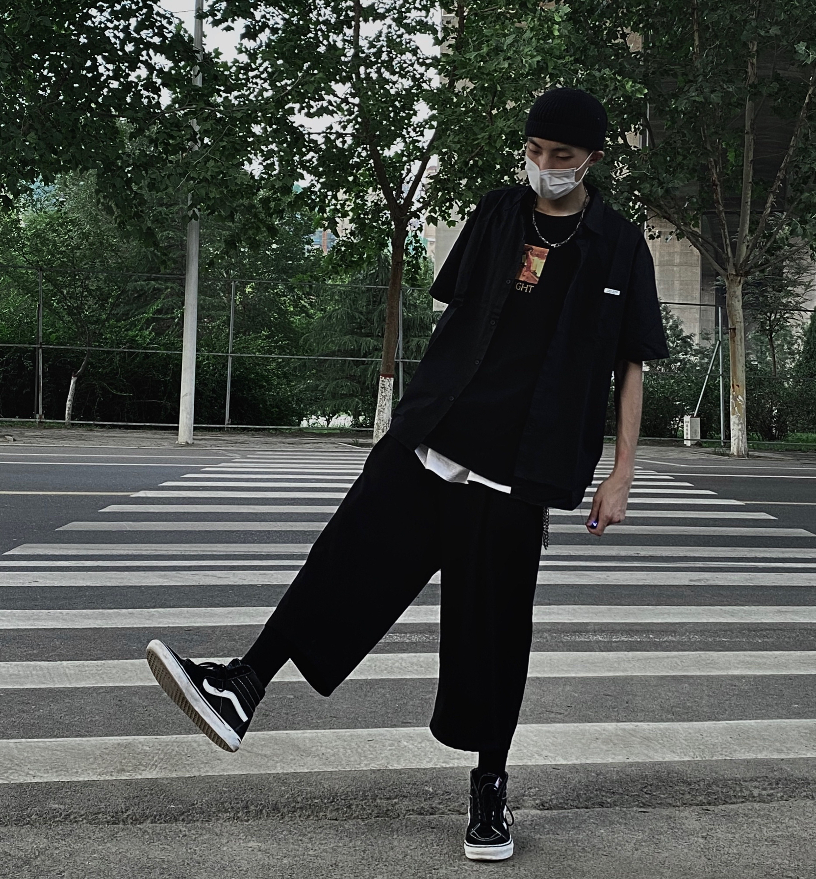 黑色衬衣搭配黑色西裤 整体一身黑色搭配 鞋子穿一双黑色VANS 黑色袜子 整体一身高级感 十足