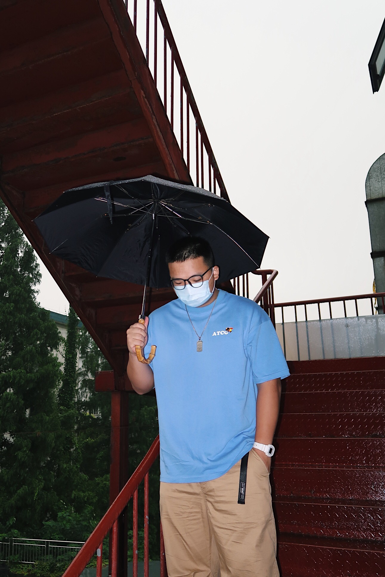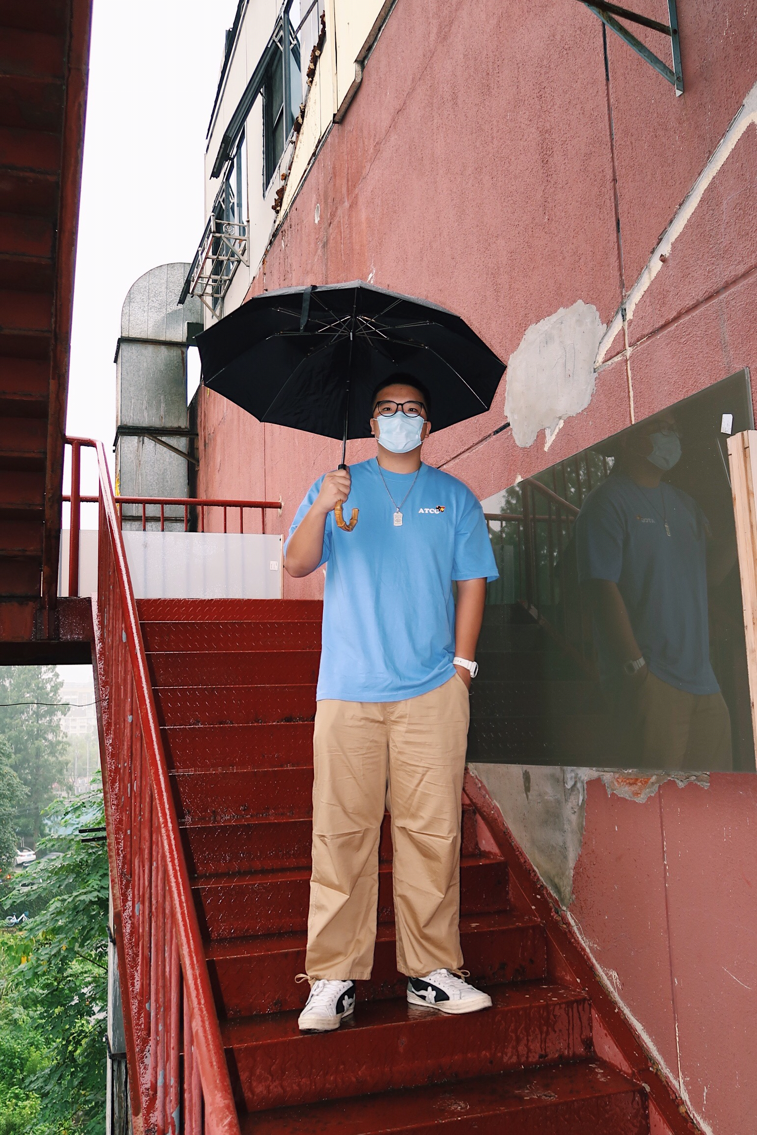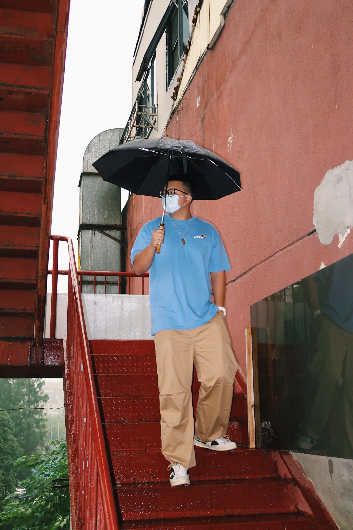 下雨天要怎么拍呀 一部微单加上闪光灯📸️ 在楼梯上面也能随便拍拍拍 👔:ATCG 👖:ipenny 👟:匡威golf 📷:佳能g7x2