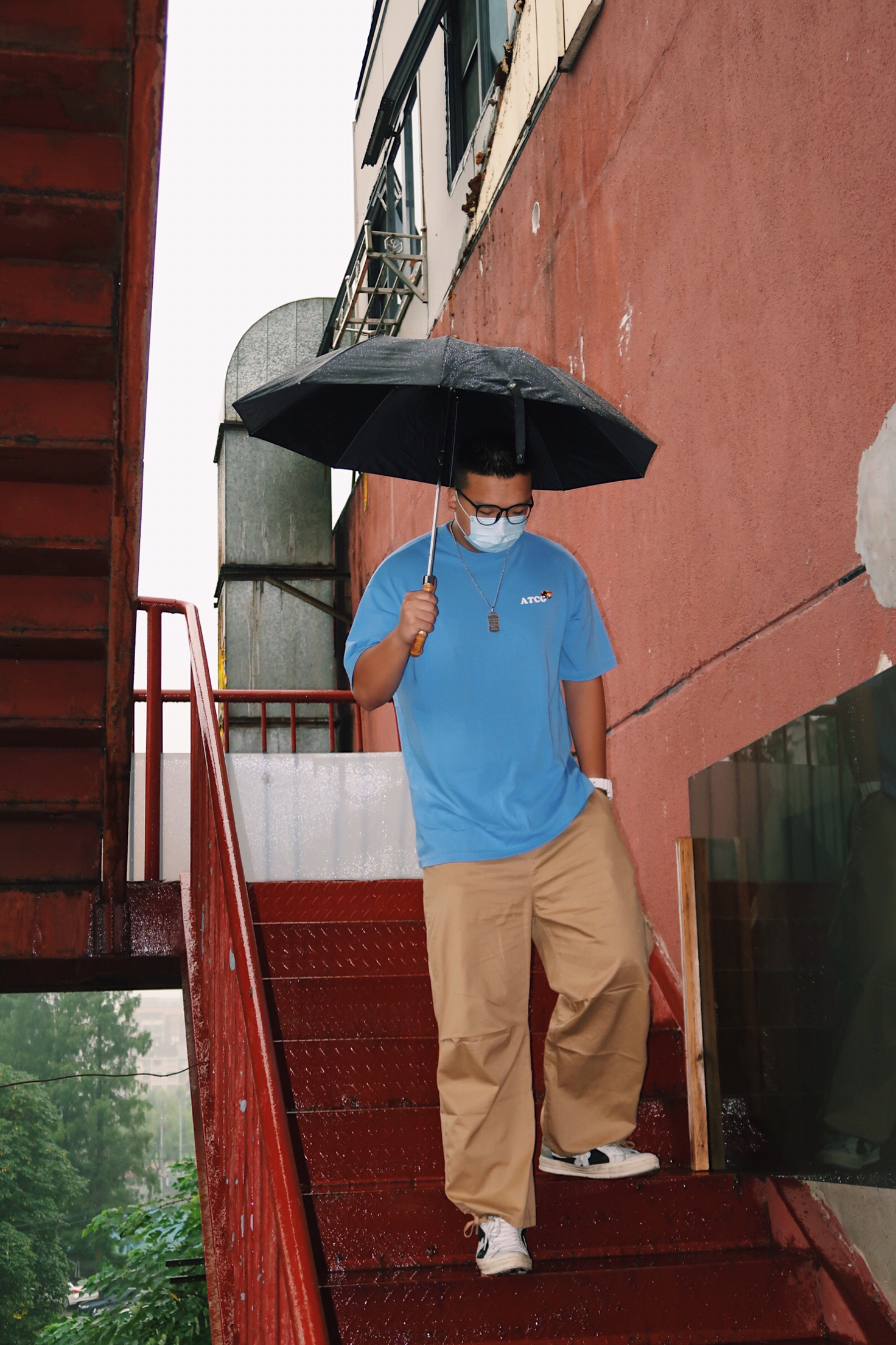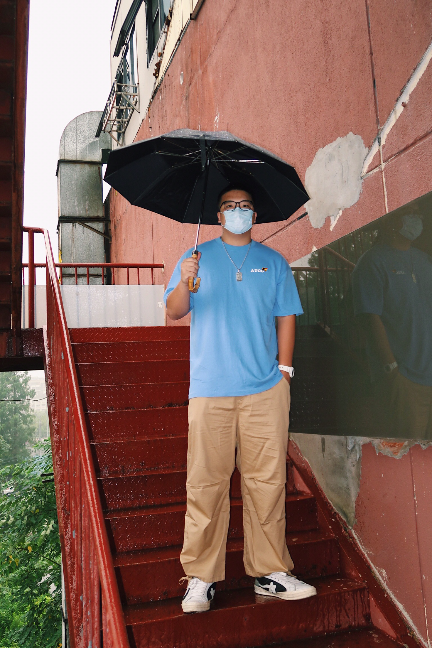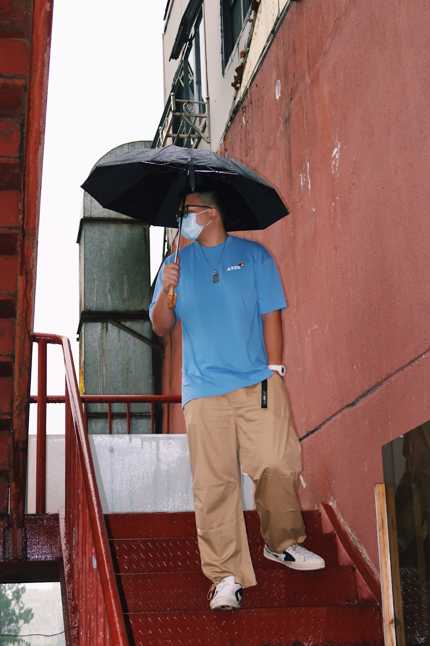 下雨天要怎么拍呀 一部微单加上闪光灯📸️ 在楼梯上面也能随便拍拍拍 👔:ATCG 👖:ipenny 👟:匡威golf 📷:佳能g7x2