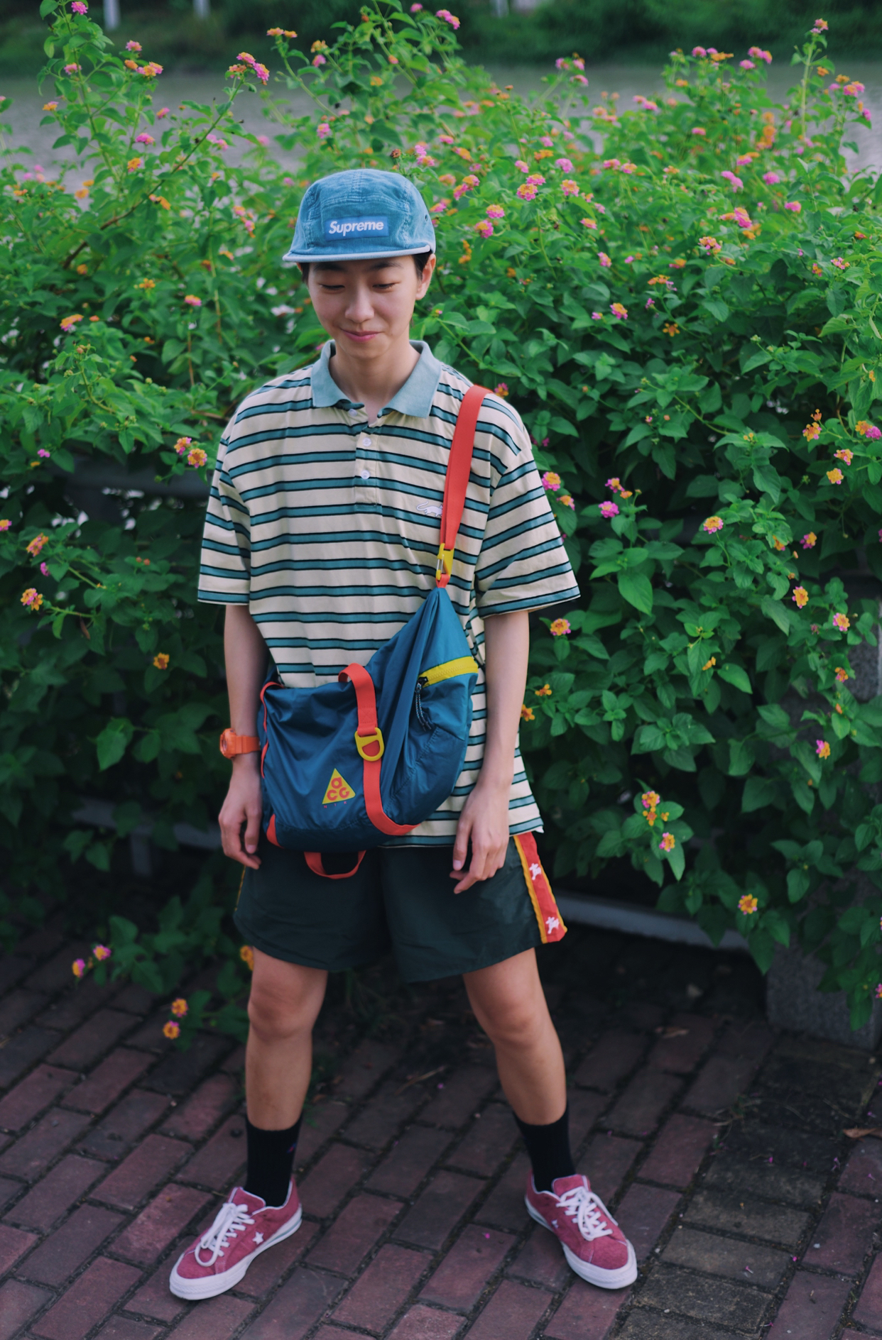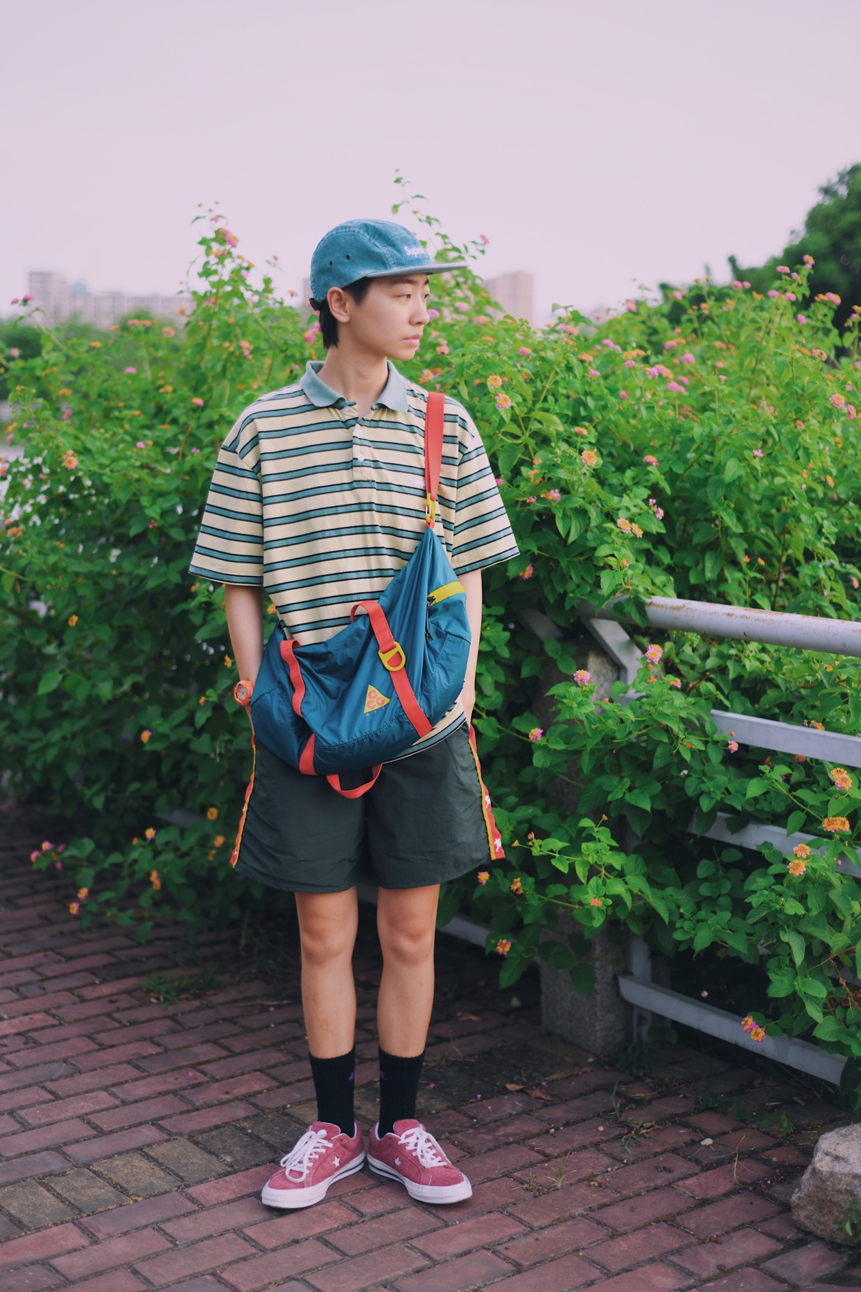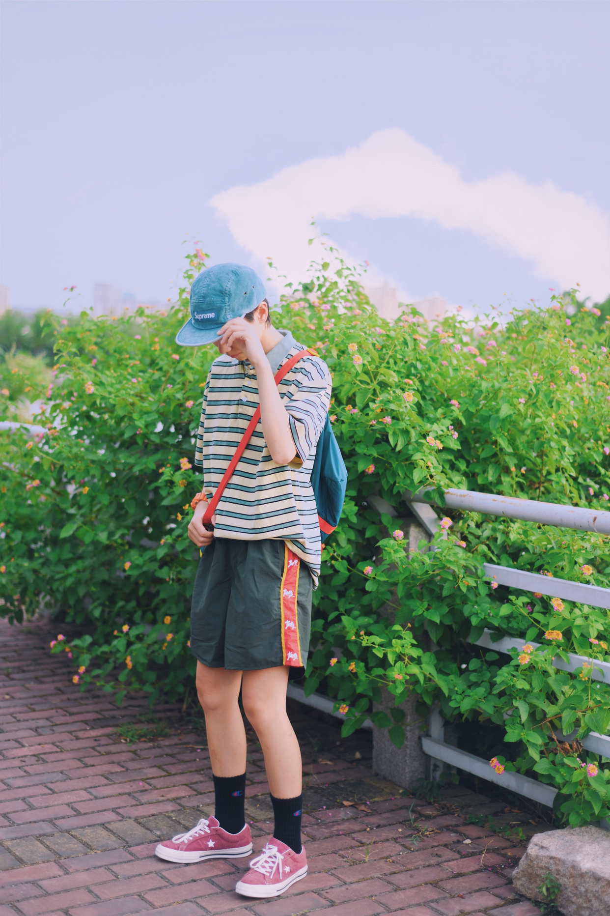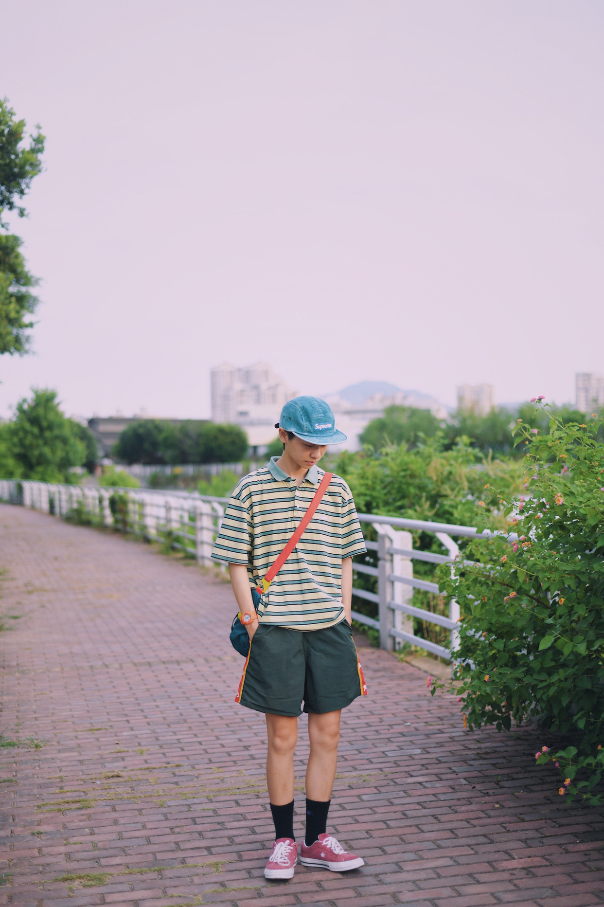 红配绿一直是很抵触的颜色 新尝试 还搭配出不一样的感觉 简单的条纹t➕不过膝的短裤 t夹在👖里,显腿长 百搭的匡威板鞋 夏天必不可少 一整身满满的复古感