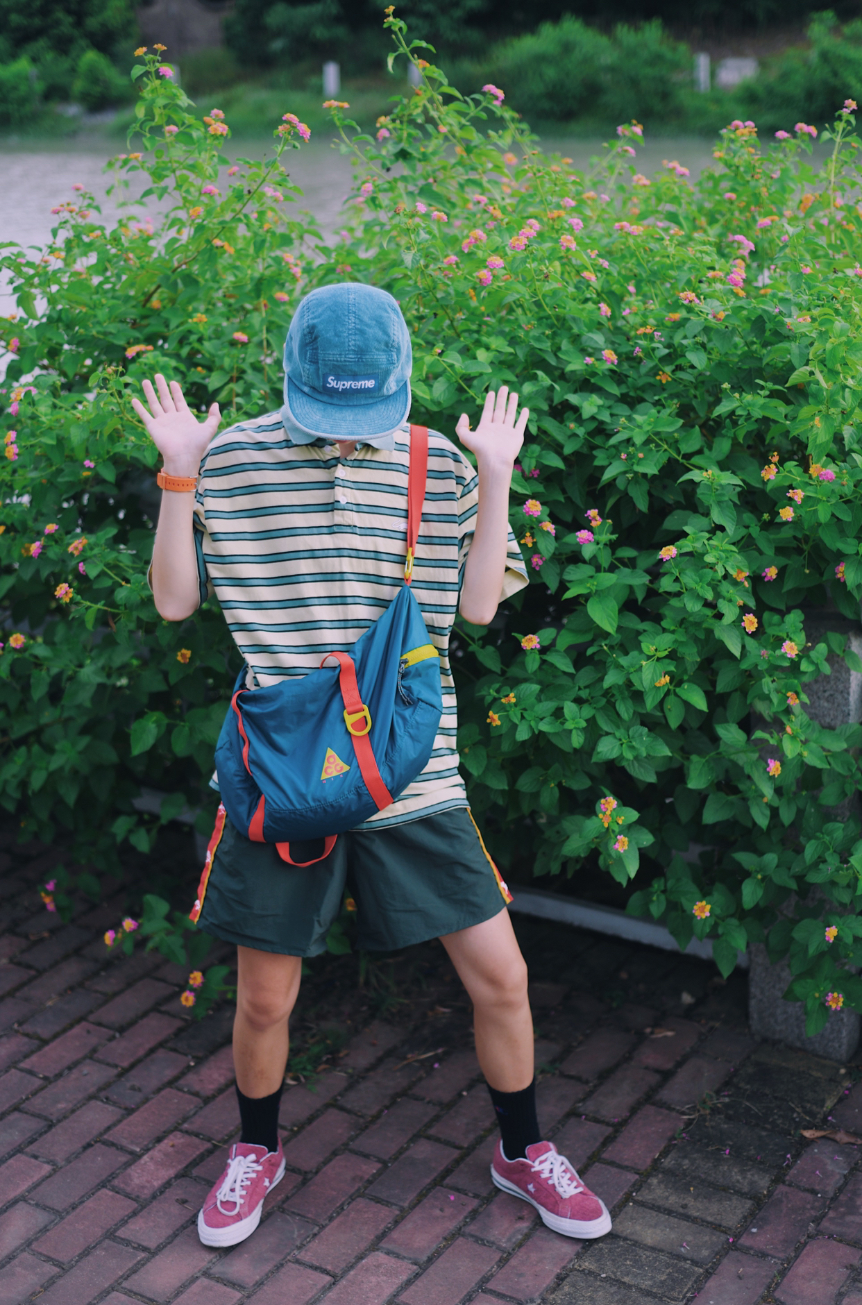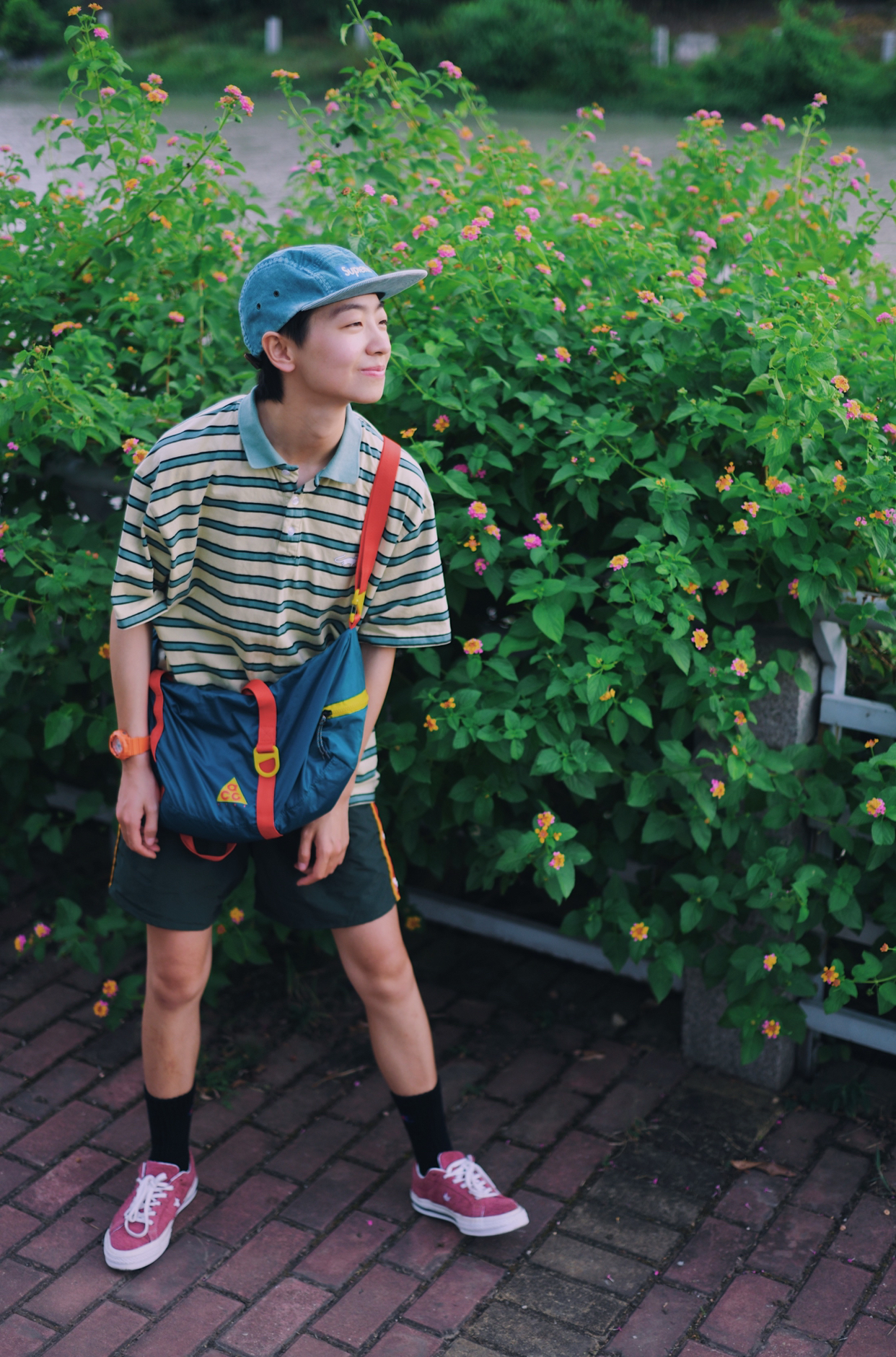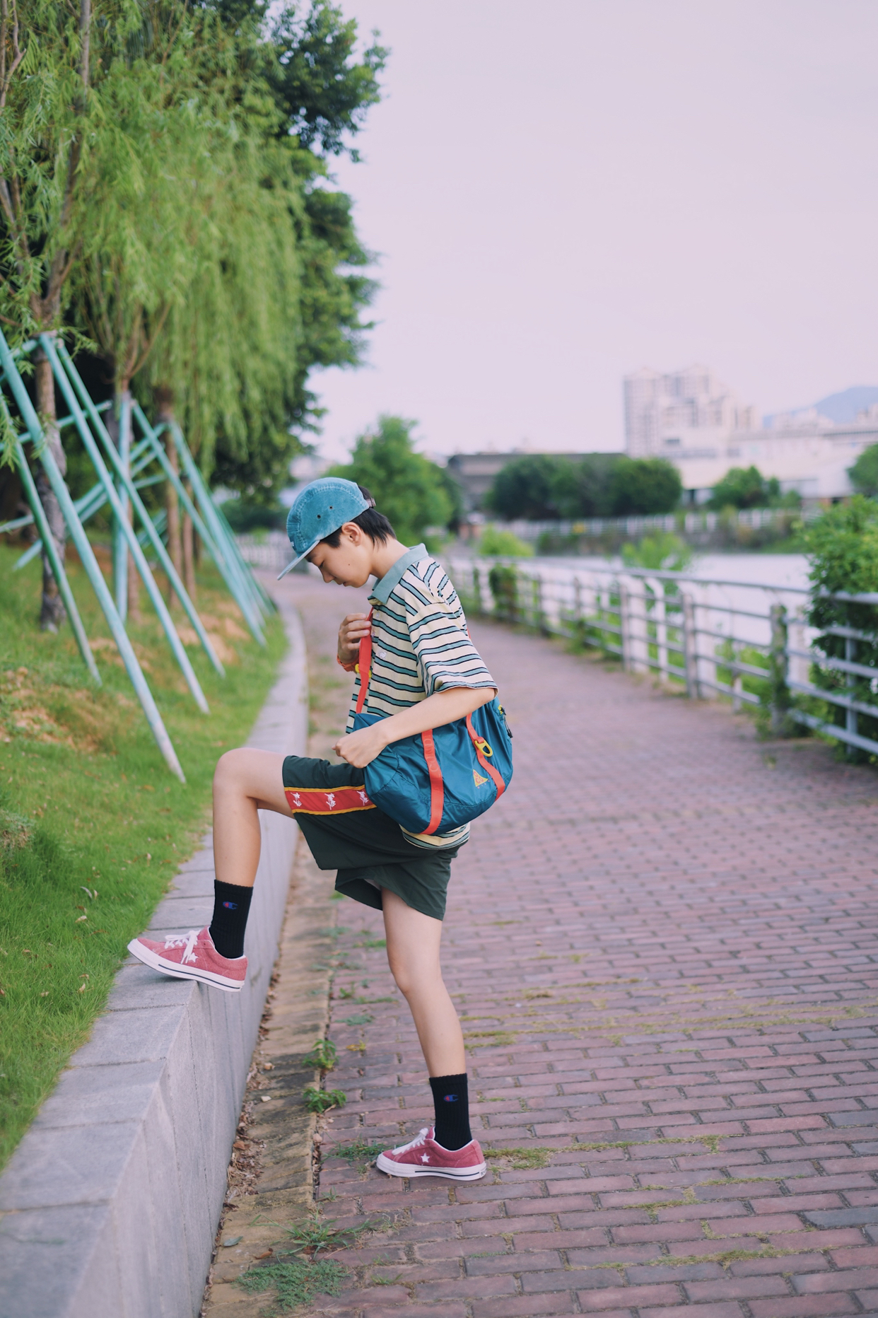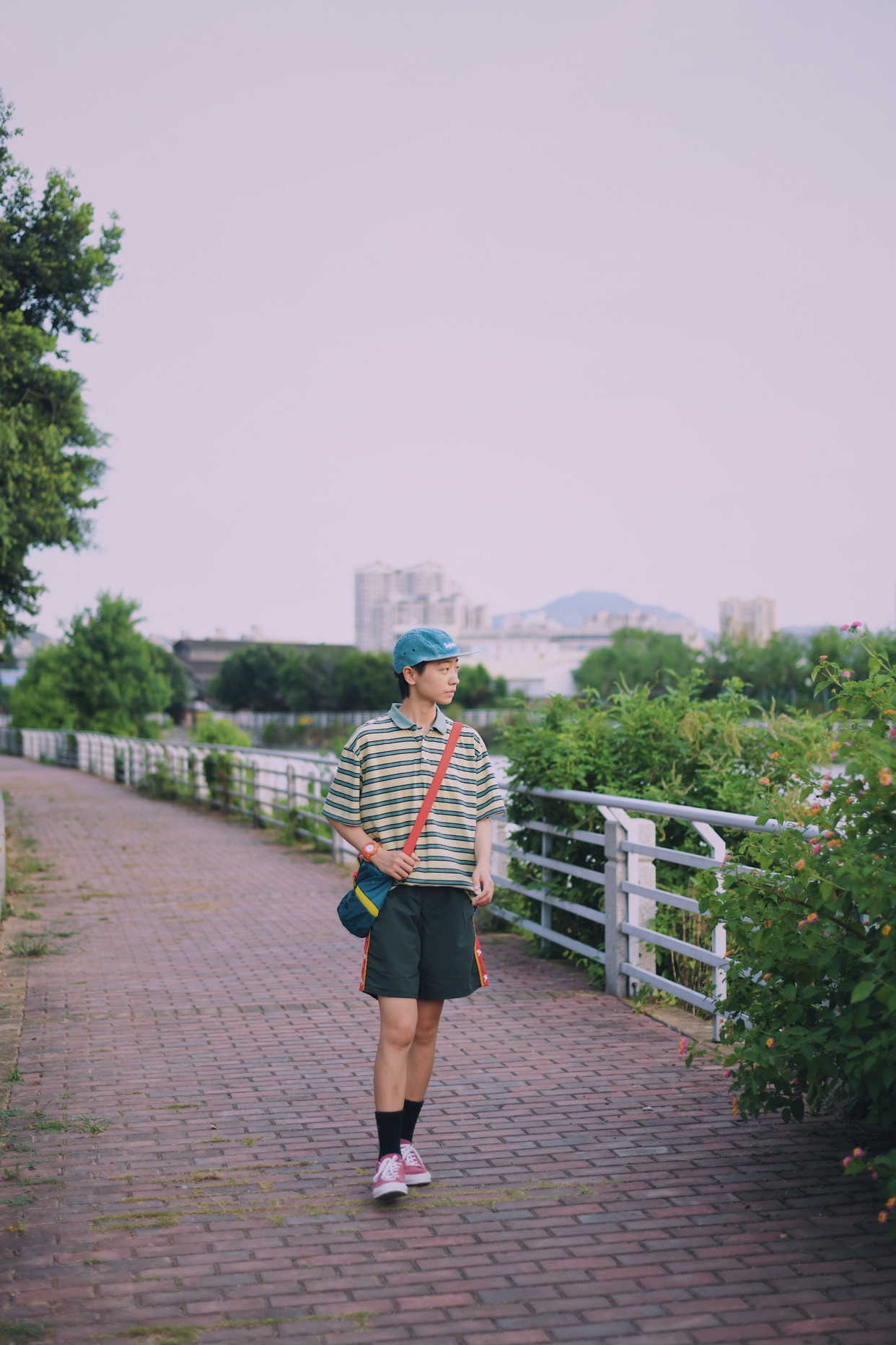 红配绿一直是很抵触的颜色 新尝试 还搭配出不一样的感觉 简单的条纹t➕不过膝的短裤 t夹在👖里,显腿长 百搭的匡威板鞋 夏天必不可少 一整身满满的复古感