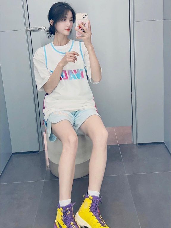 篮球少女日常穿搭之——大长腿风(自封的😁) 👚:UR的纱网式衬衫外套深蓝色 👑:运动Bra,nike的中强度,平时健身房和打篮球我都穿这个系列,一下子买了好多个颜色~ 🩳:常见的黑色不规则三分牛仔裤 👟:Yeezy350冰蓝满天星 🧦:nike经典侧勾长袜,训练打球和出街两不误。 我的穿搭没什么法则,打球训练和刷街基本上都可以混穿^_^穿出舒适和适合自己的风格