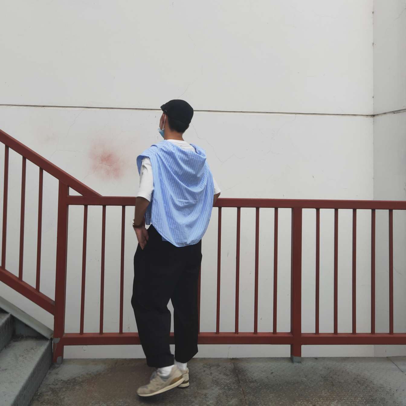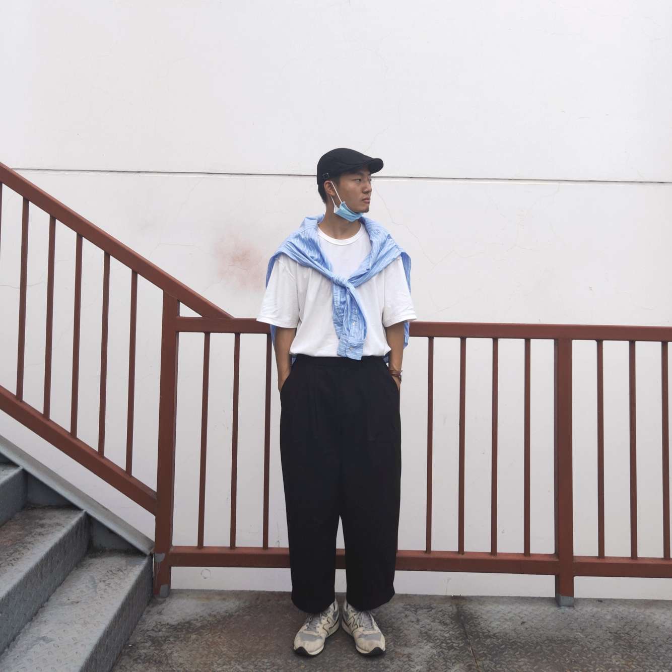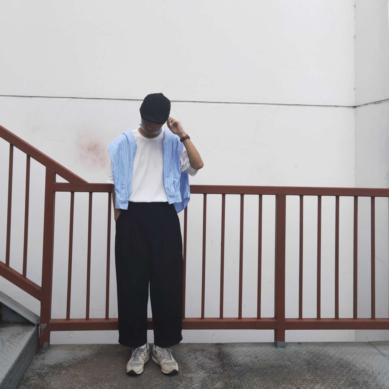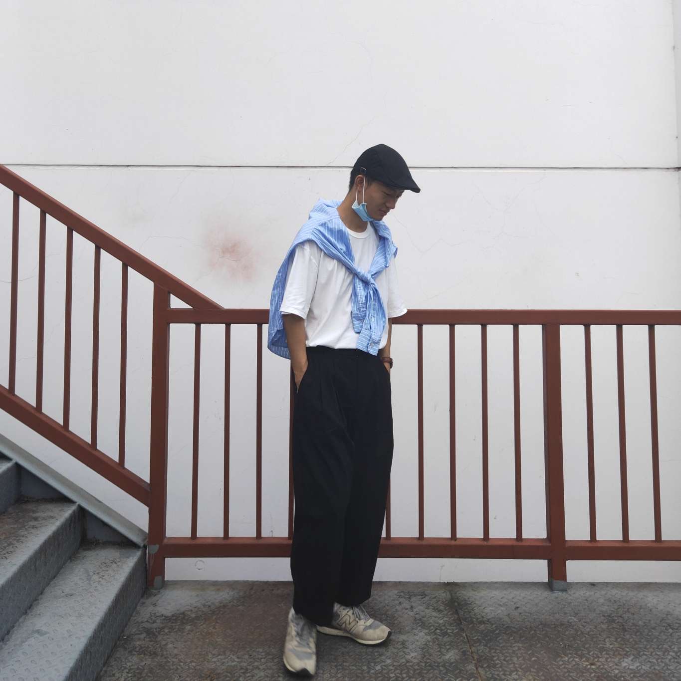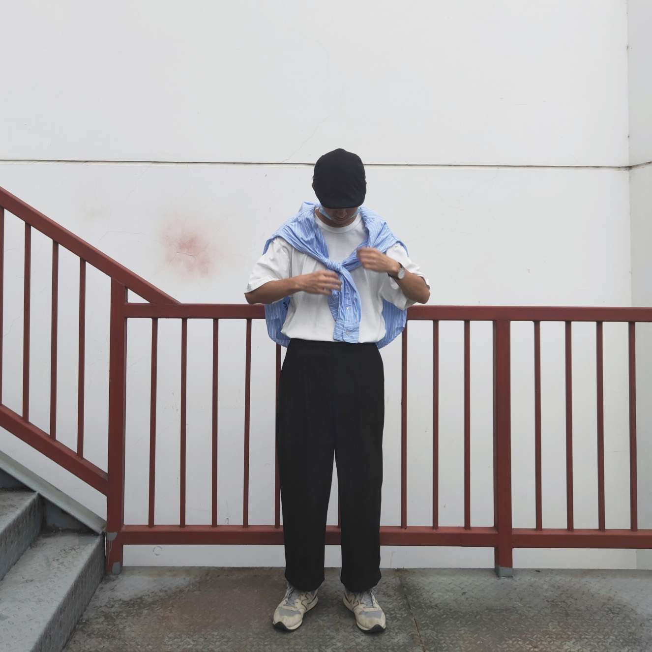 短袖:reocha 衬衫:supertofu 裤子:neverseez 鞋子:newbalance 996 白 t 加上黑裤子,再来一双 996,是一身特别适合通勤的着装,肩披一件长袖衬衫营造层次感,在地铁里冷气太足还可以穿上防止着凉。