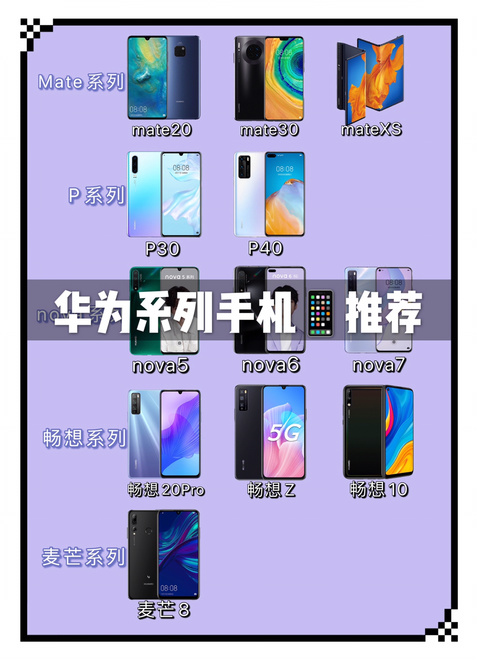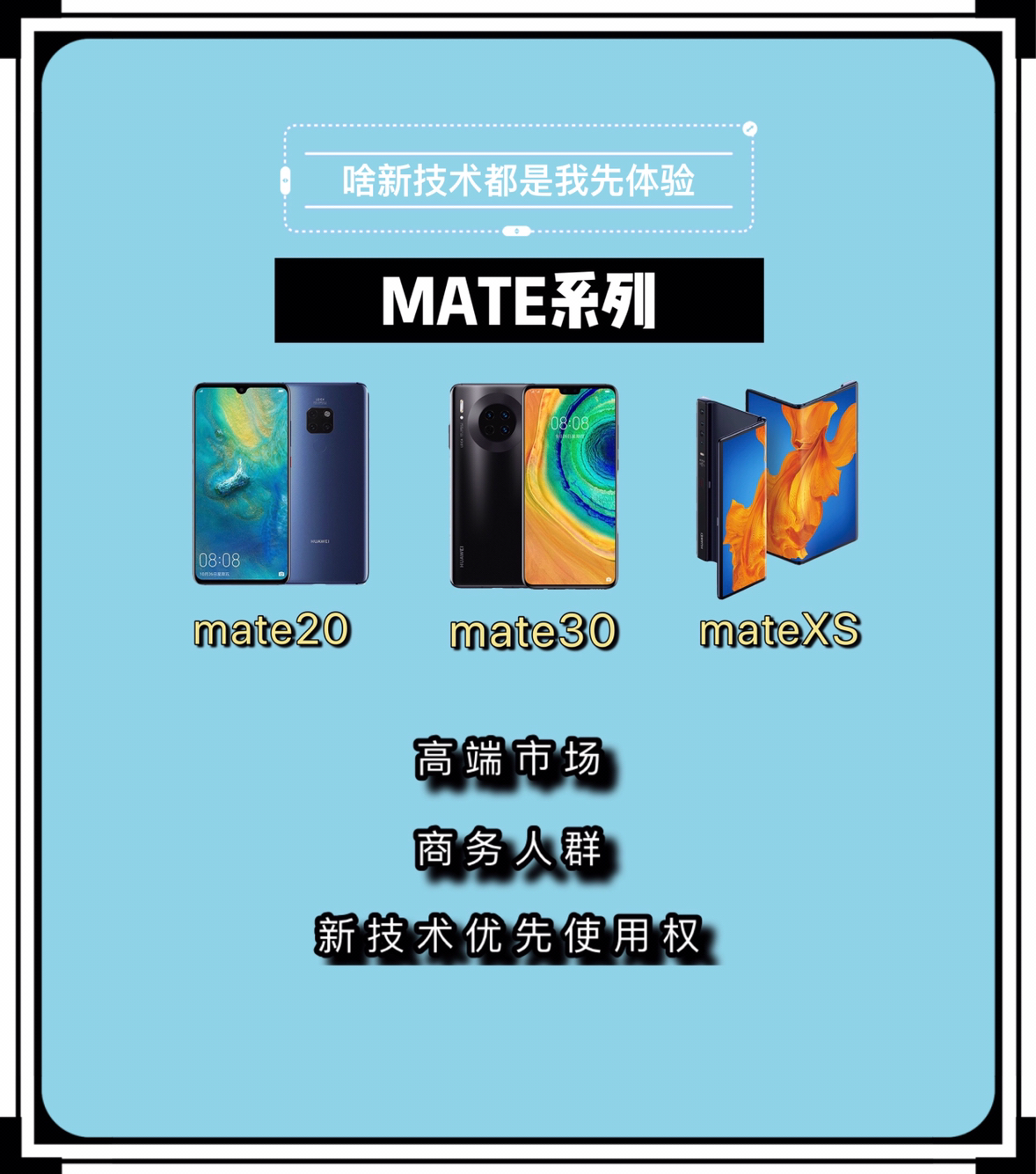 最近不少朋友问华为手机那么多系列怎么选?简单分为高端市场,中端市场和低端市场。下面盘点一下华为手机的各个系列。 🎈MATE系列 mate系列手机主要面向高端市场,主要面向人群为商务人群。 华为麒麟芯片最新版本的首发机型,华为EMUI最新版本系统的首发机型,5G技术的首发机型。总之华为的新技术mate系列都拥有着优先使用权。 🌻目前mate系列在售机型:mate20系列,mate30系列,mateX...
