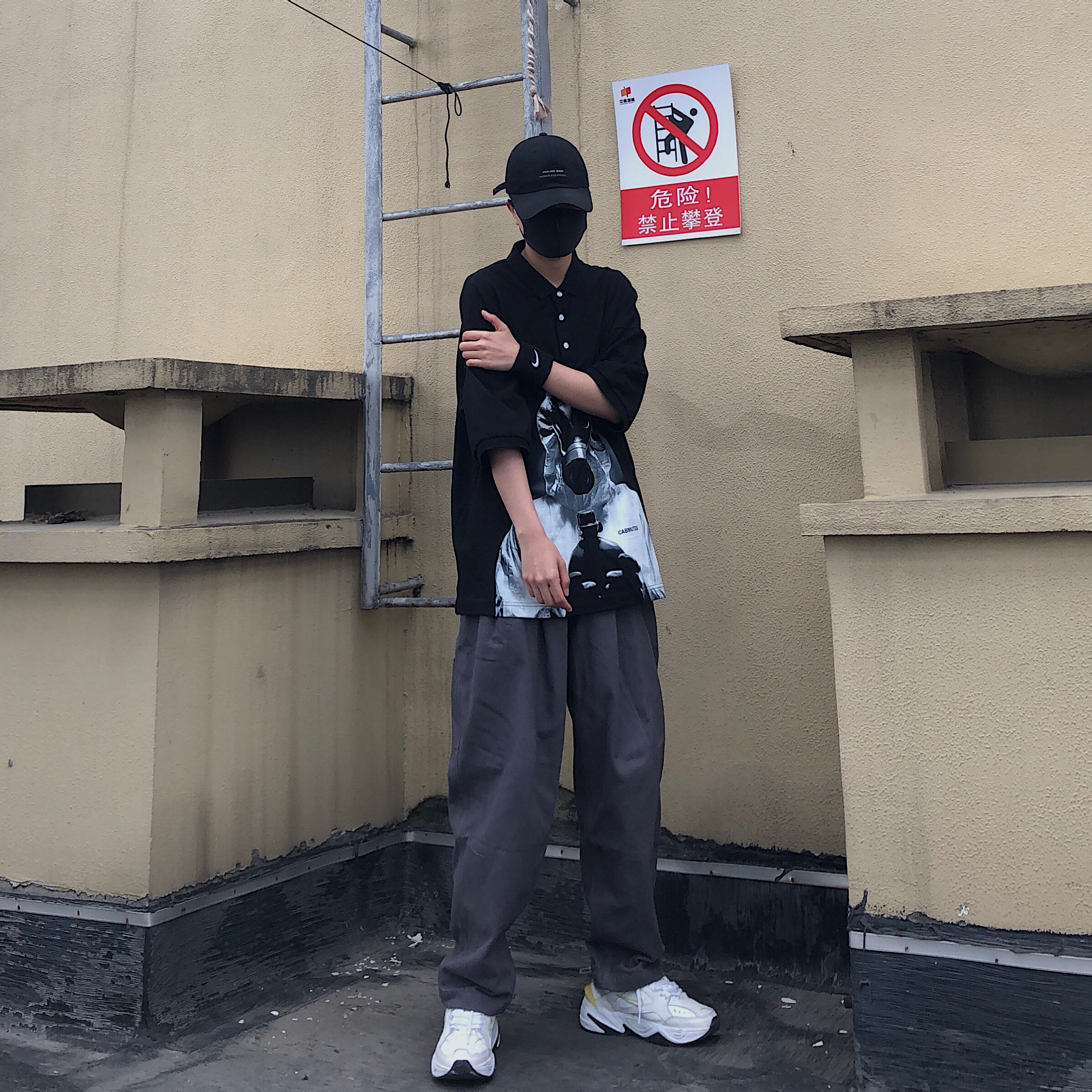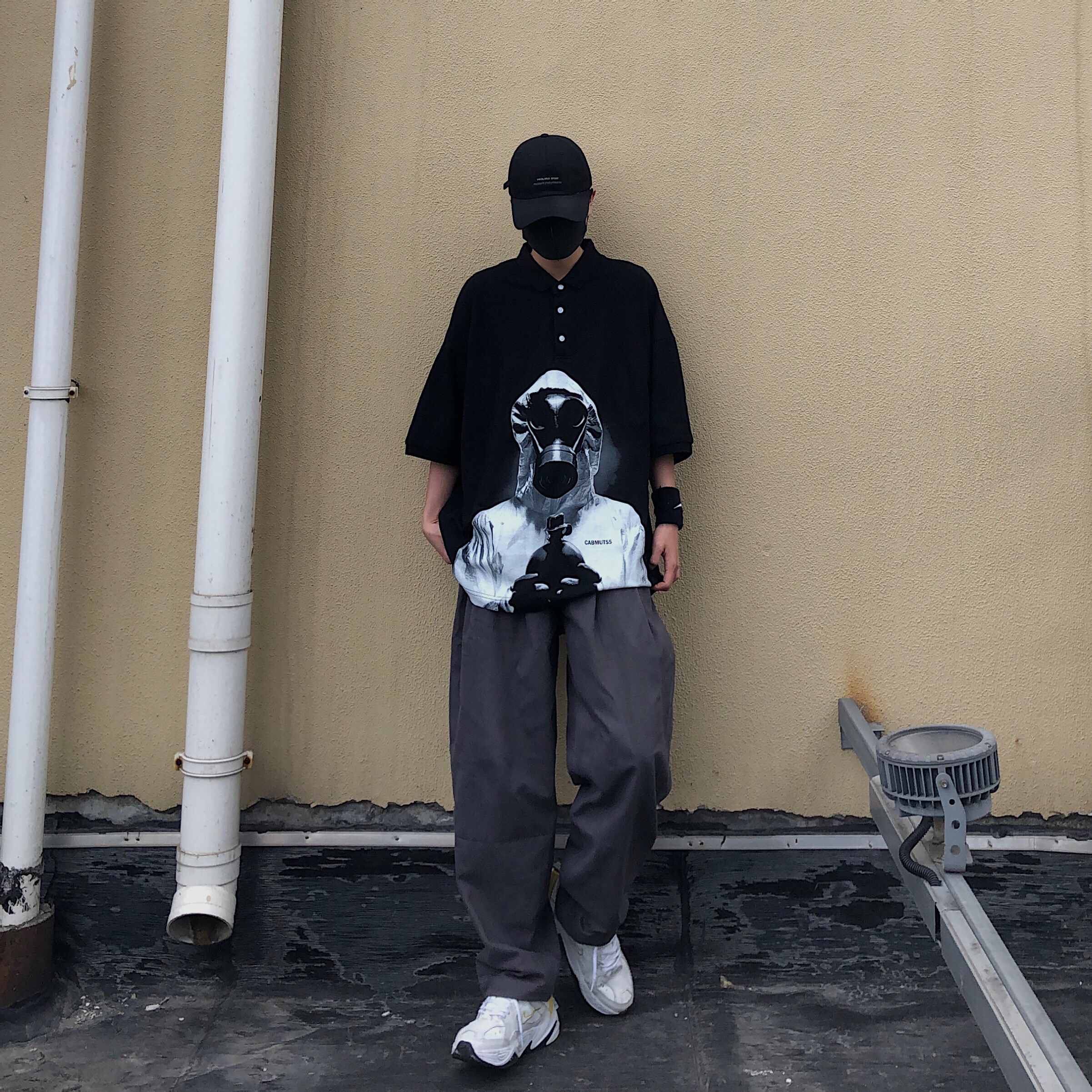 上衣:驰目Cabmutss 是一件非常酷的POLO,版型宽松无束缚,面料上身也很舒适柔软,整个印花图案给人的视觉效果特别的强烈,白色的纽扣的存在也是相得益彰 裤子:驰目Cabmutss 一直都很喜欢垂感好的裤子,黑灰的颜色有一点复古的感觉,整体版型宽松休闲 鞋子:M2K 白色的鞋子小呼应一下POLO的印花颜色