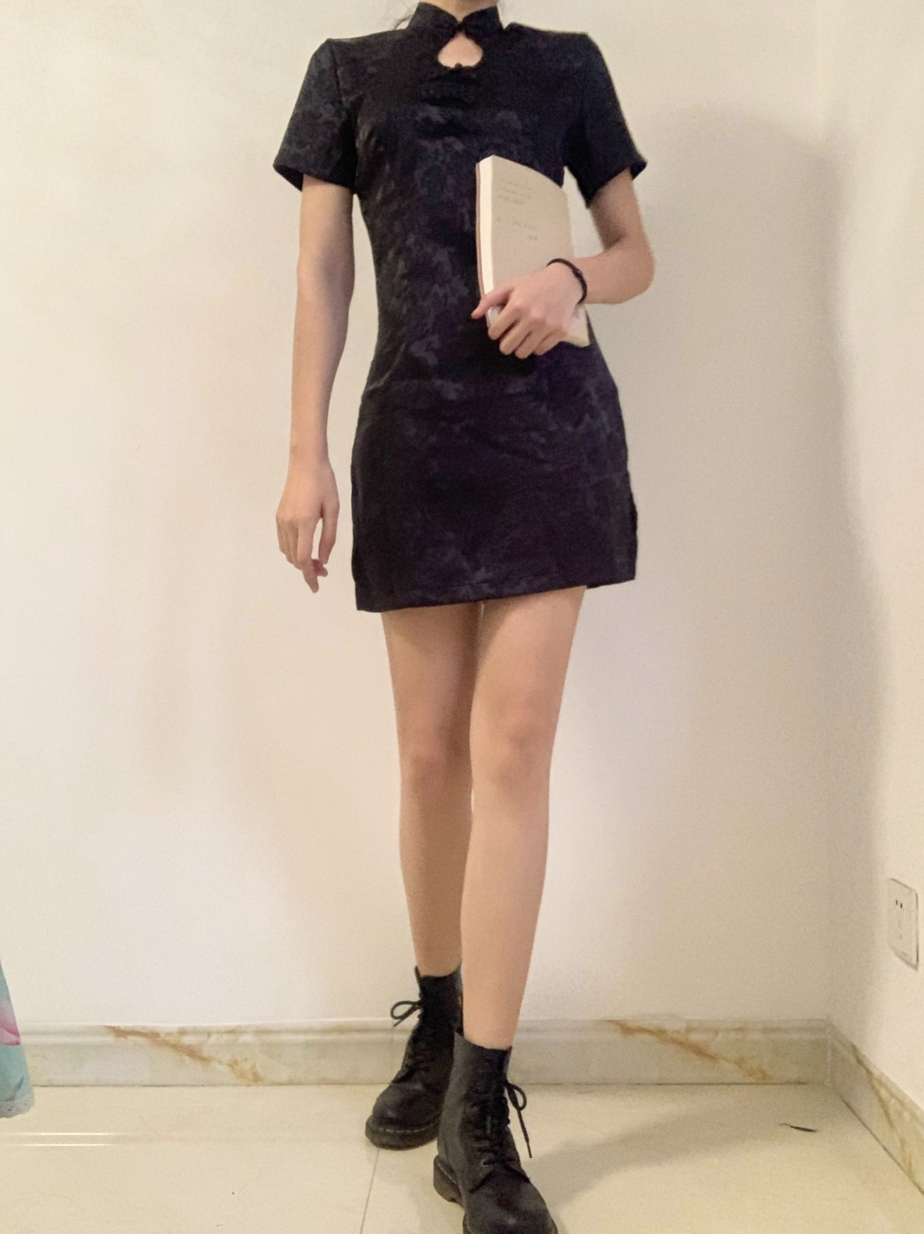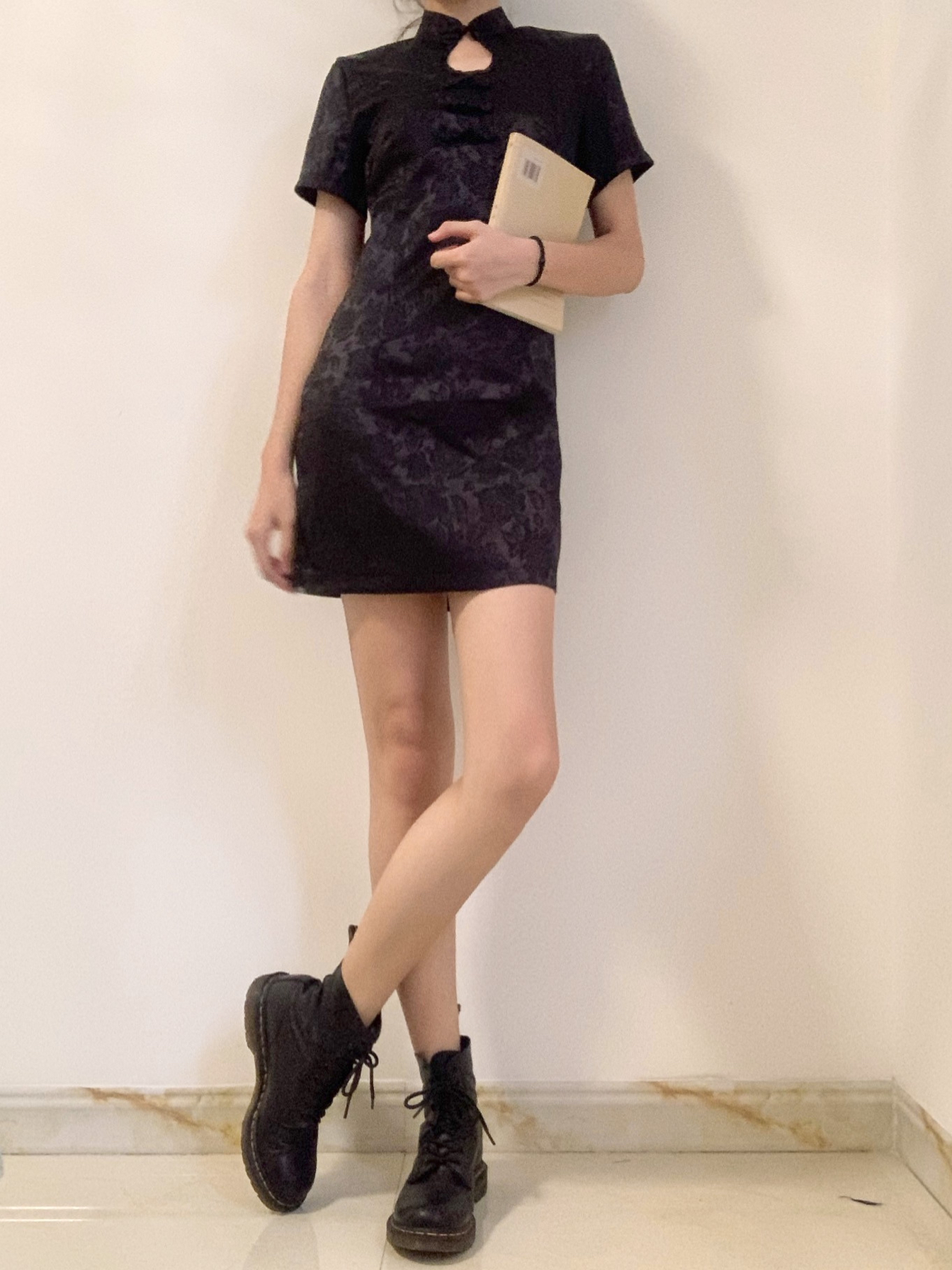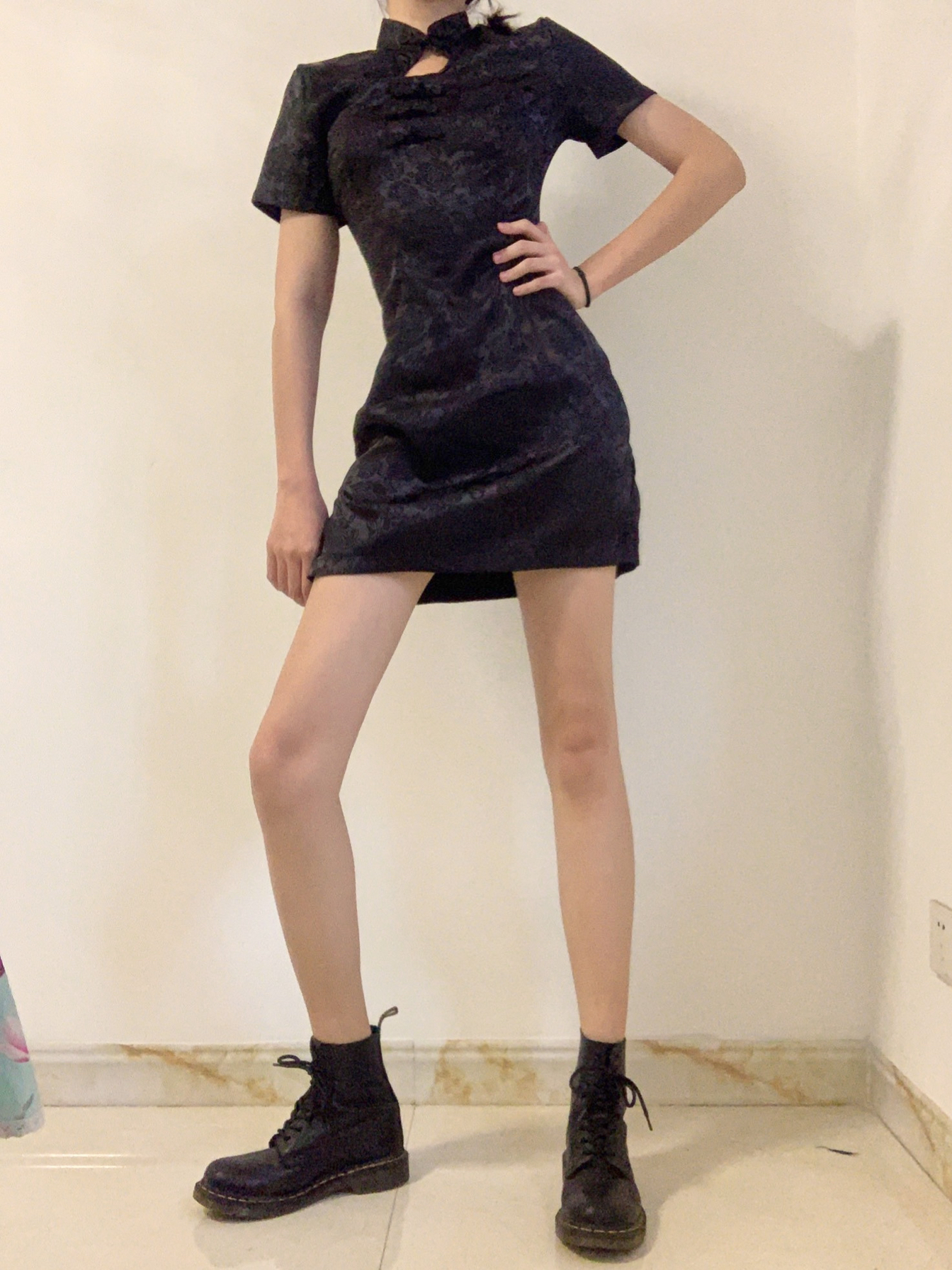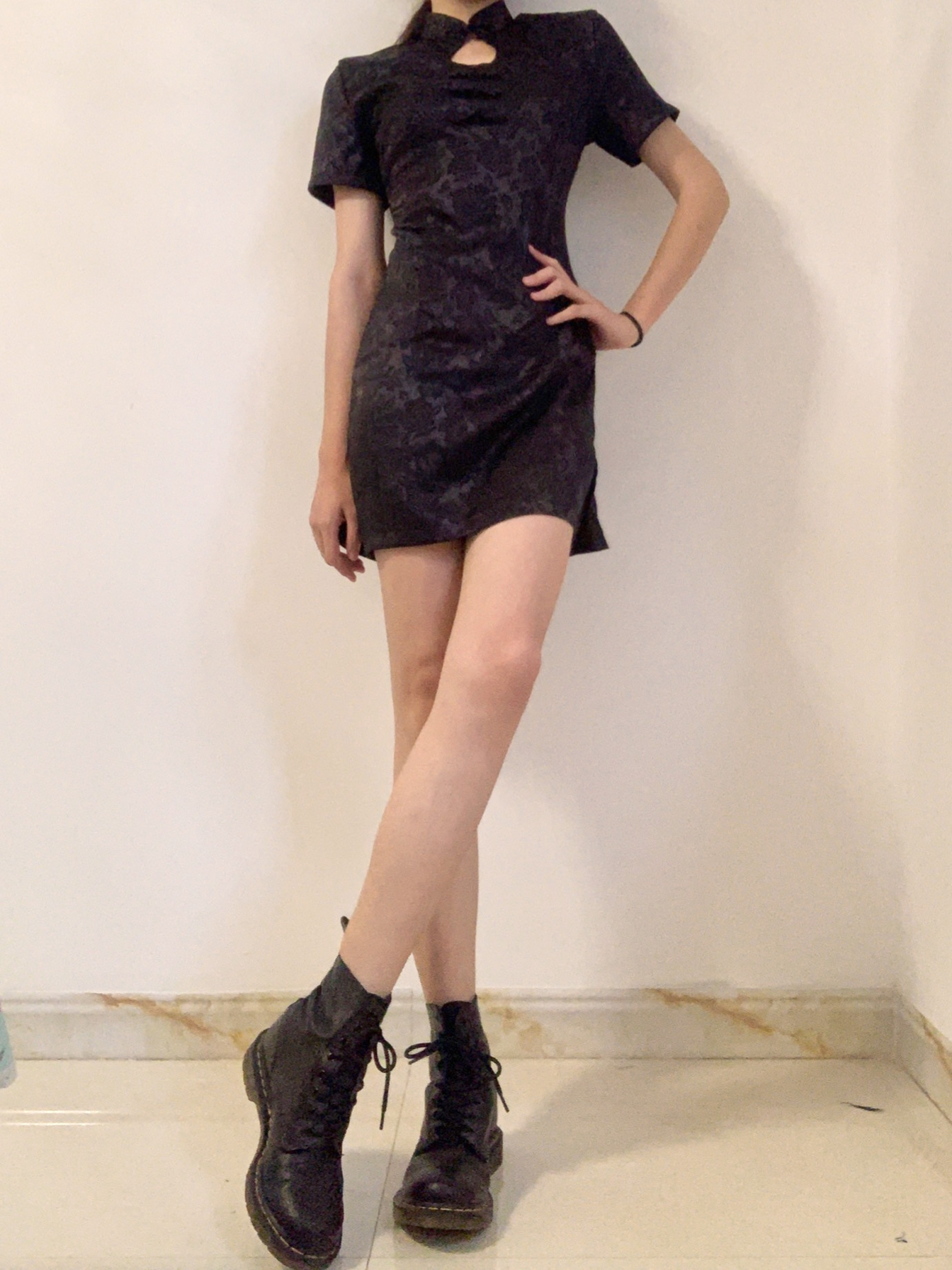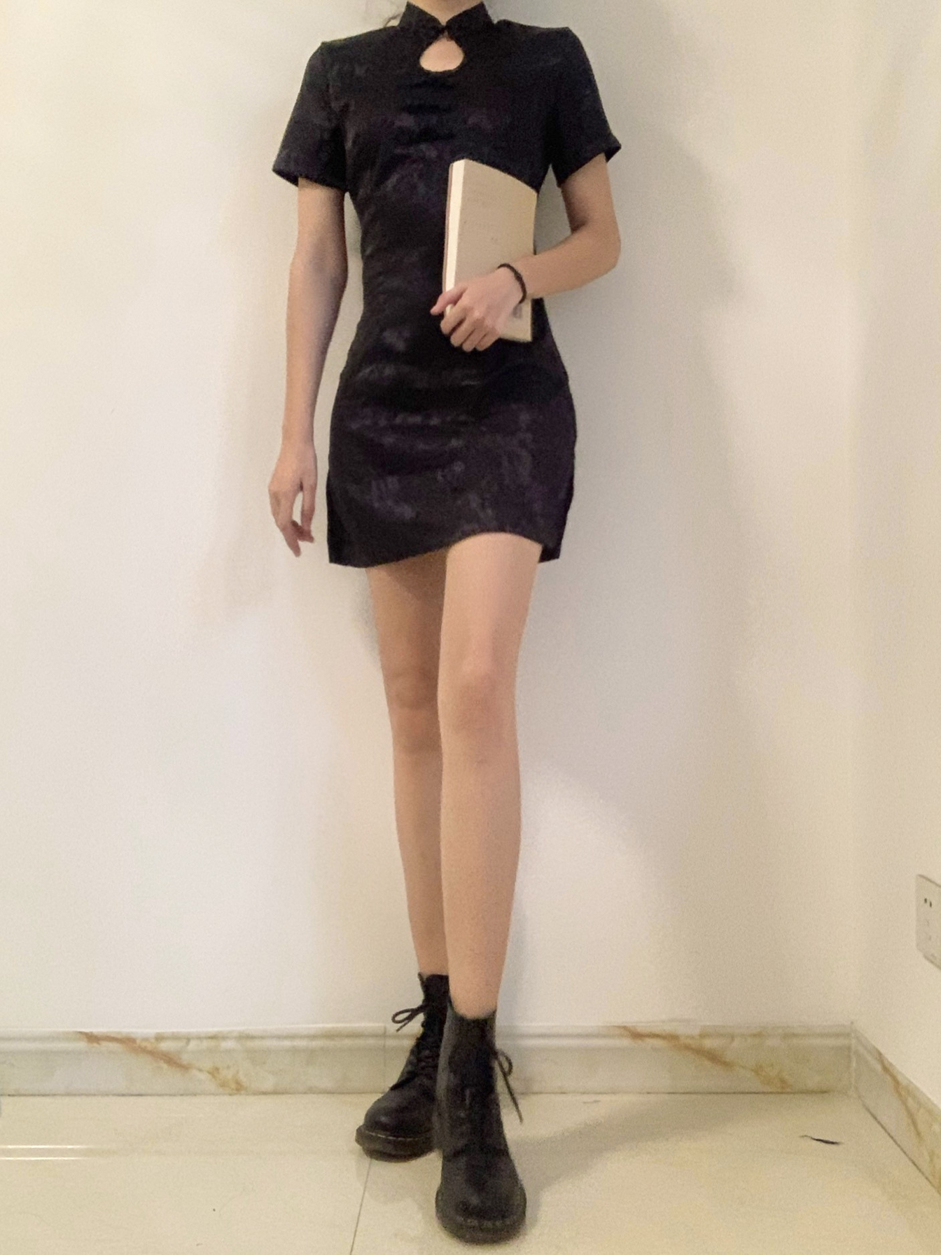 嘻嘻难得有这么合身的旗袍 没化妆就不露脸了! 家里没有高跟鞋,就穿马丁靴啦
