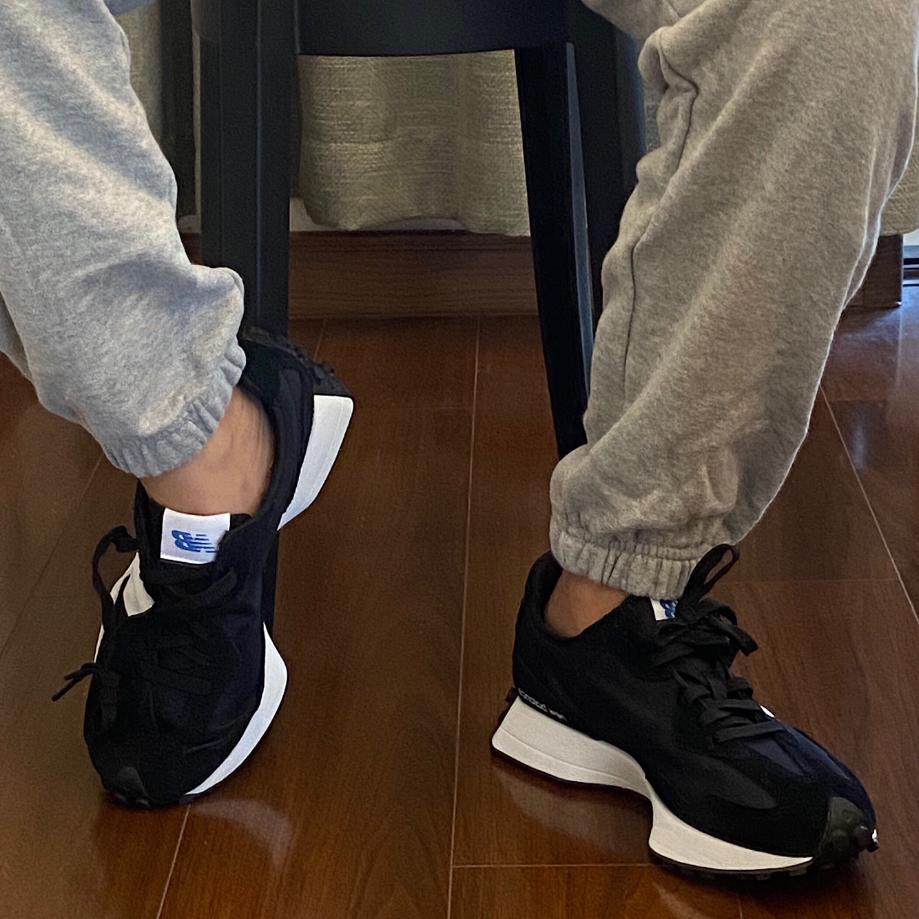 裤子就是灰色卫裤 灯光原因 裤子颜色一边暗 忽略 掉进NB327的坑里 从第一次入手327灰色开始 就被这个宝藏鞋的颜值吸引 果然有的鞋不上脚不知道会有什么惊喜 相比于灰色的价格 这个黑色的价格真的很香! 黑色部分采用了327短绒麂皮 侧身采用了全布面的设计 黑白配色的经典 脚感方面偏软舒适 327灰色之后的调色板模式中 看惯了花花绿绿的配色 这双黑色显得简约百搭 🗣货号:MS327CPG...