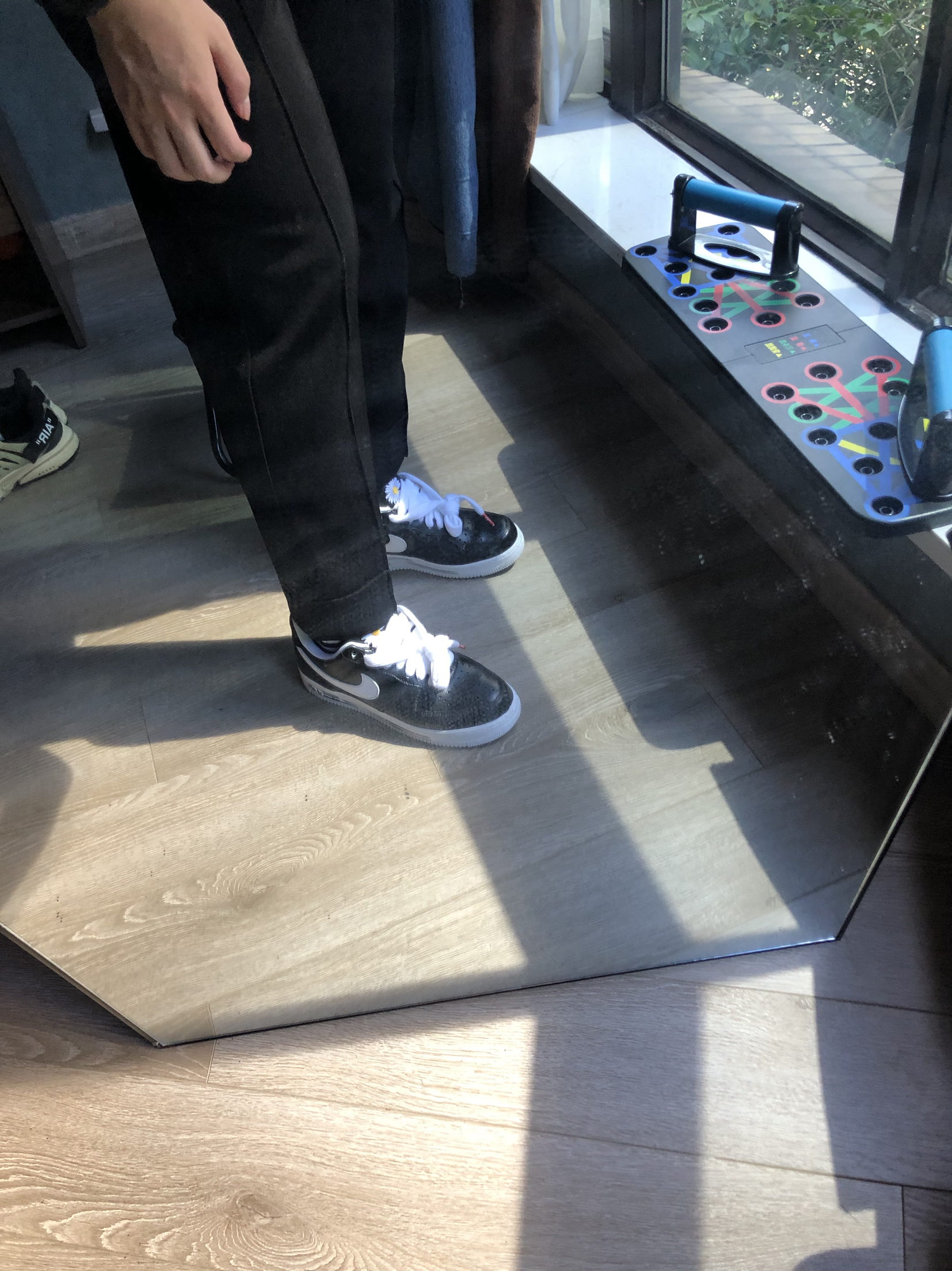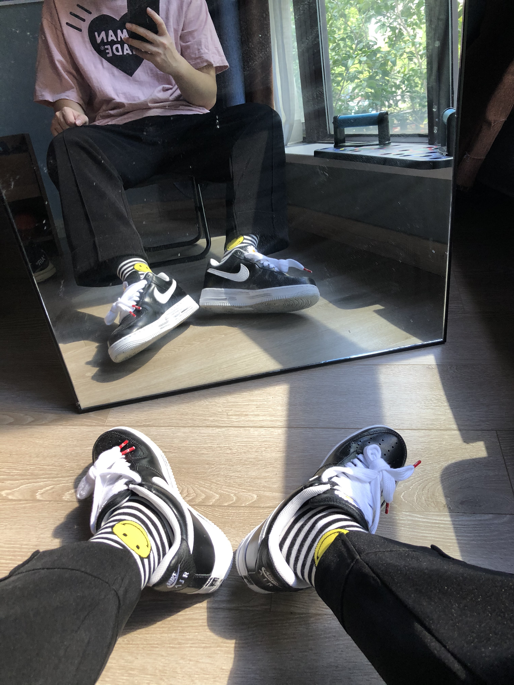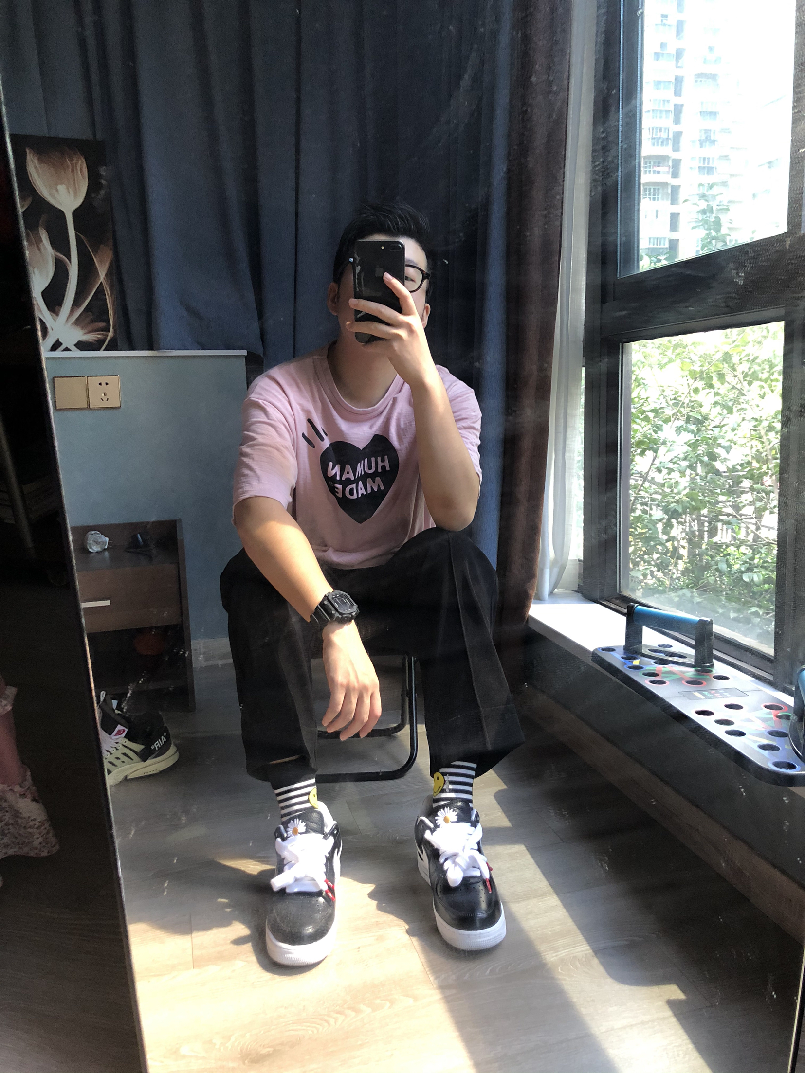 force更像是一款皮鞋。运动鞋的底子,皮鞋的外观。让搭配更显百搭。 这款force 说实话真的好看。外皮还是比较硬,等待掉皮的新鞋。 👕:human made 👖:自制西裤 👟:force x peaceminusone