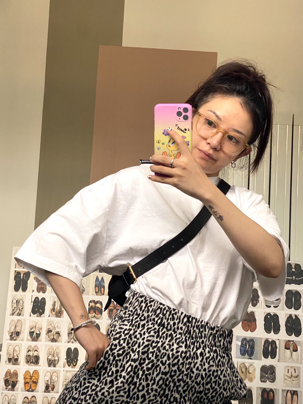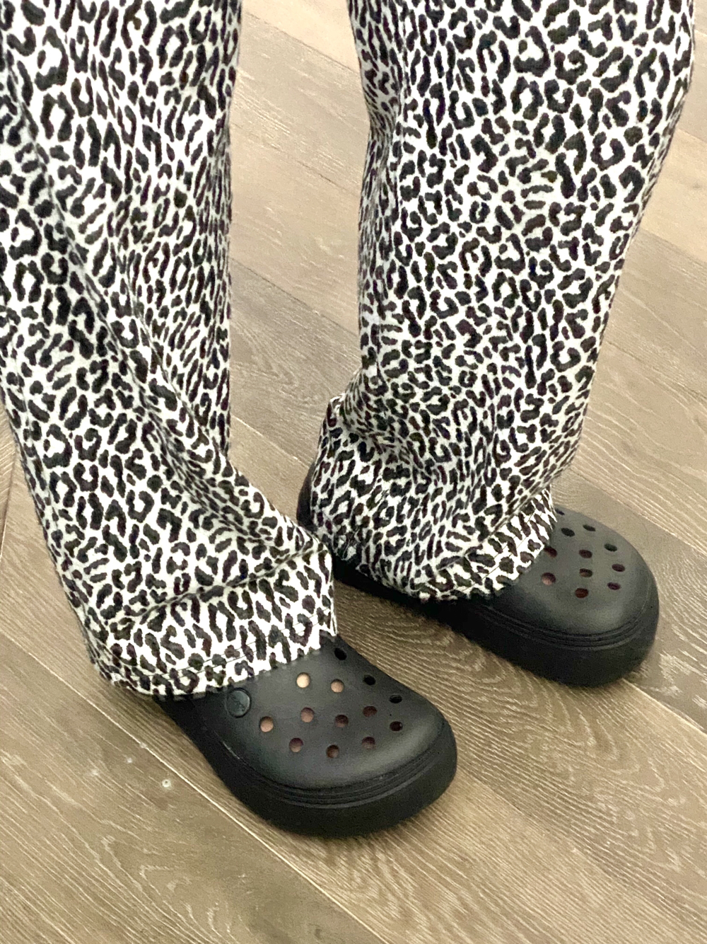 上衣👕:巴黎世家 裤子👖: a GRAPE KISS小葡萄 8.10上架 鞋子👟:crocs 包包👜:gucci 豹豹裤冲冲冲🐆配洞洞鞋也好可爱!上面随便搞了个有点小小设计的白tee💫包包短短斜挎拉个比例 这两天都就不能化妆我苦了 虽然不变的是那份美丽✨🌹