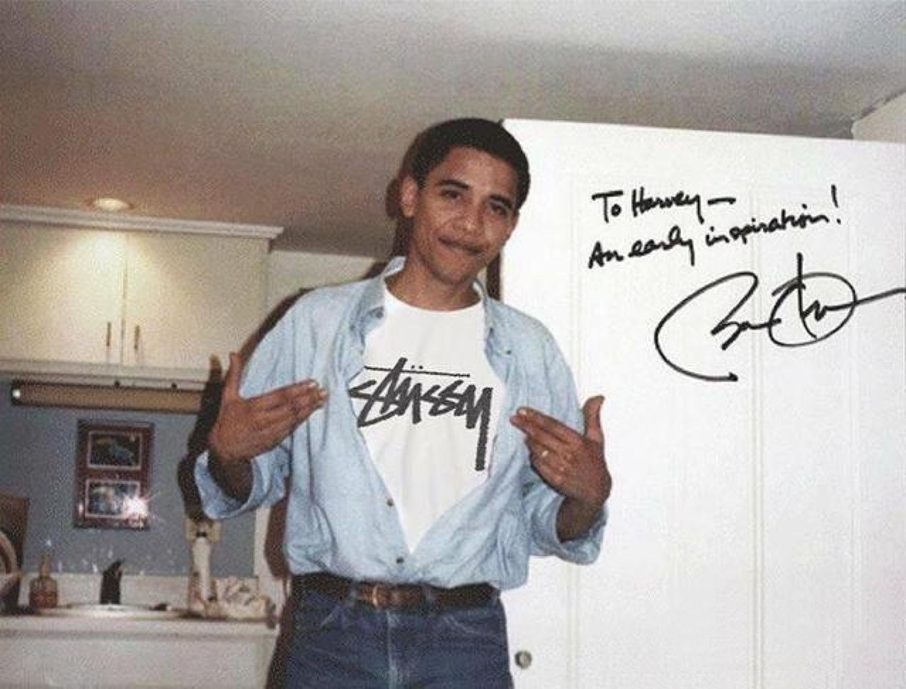 奥巴马内搭穿的这件字母T恤是美国潮牌鼻祖Stussy的火爆款式,标志logo涂鸦T恤,这个logo一直用到现在,近两年愈加火🔥,该品牌复古有个性,崇尚自由和和平,难怪美国前总统奥巴马也粉它! 商品名称:【奥巴马同款】Stussy 基础经典logo短袖T恤 1904221 石头灰绿字