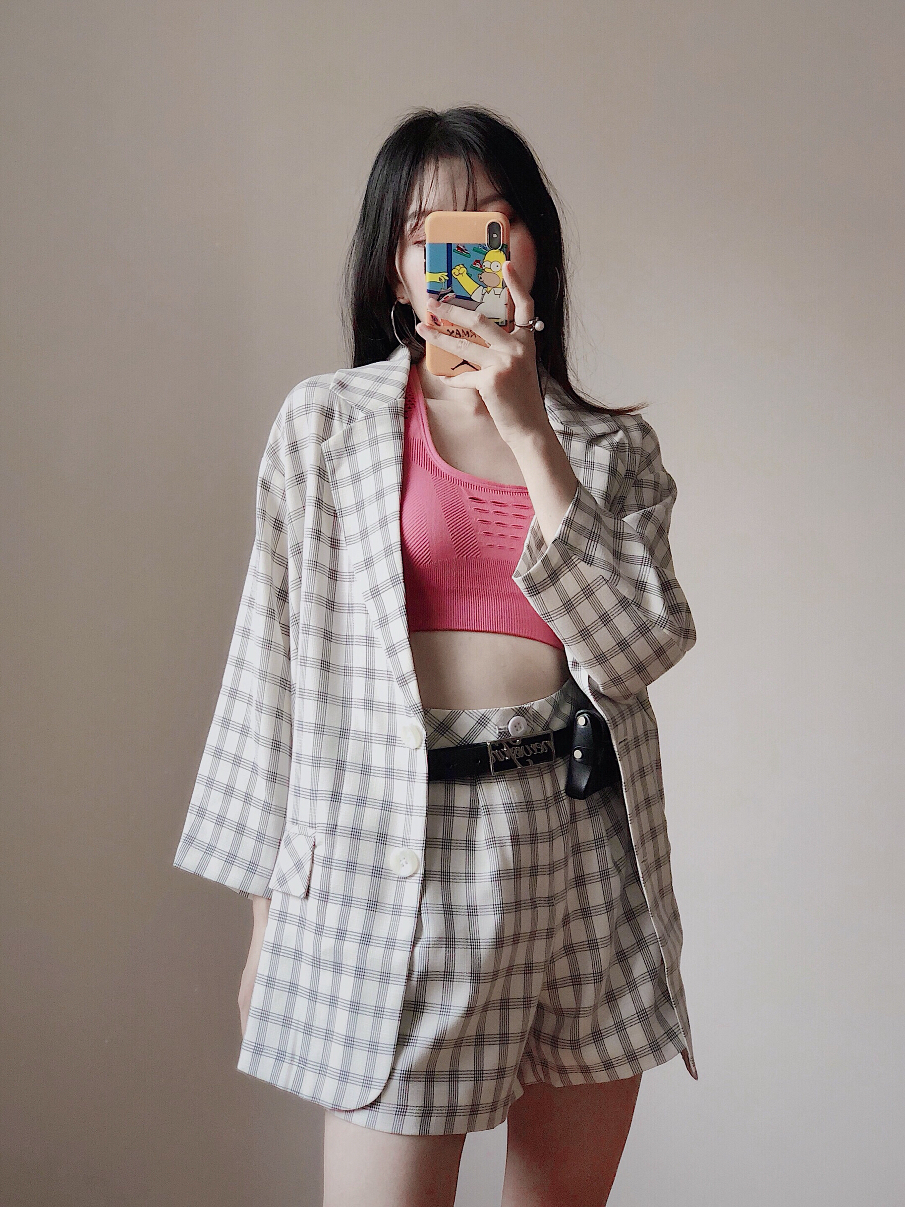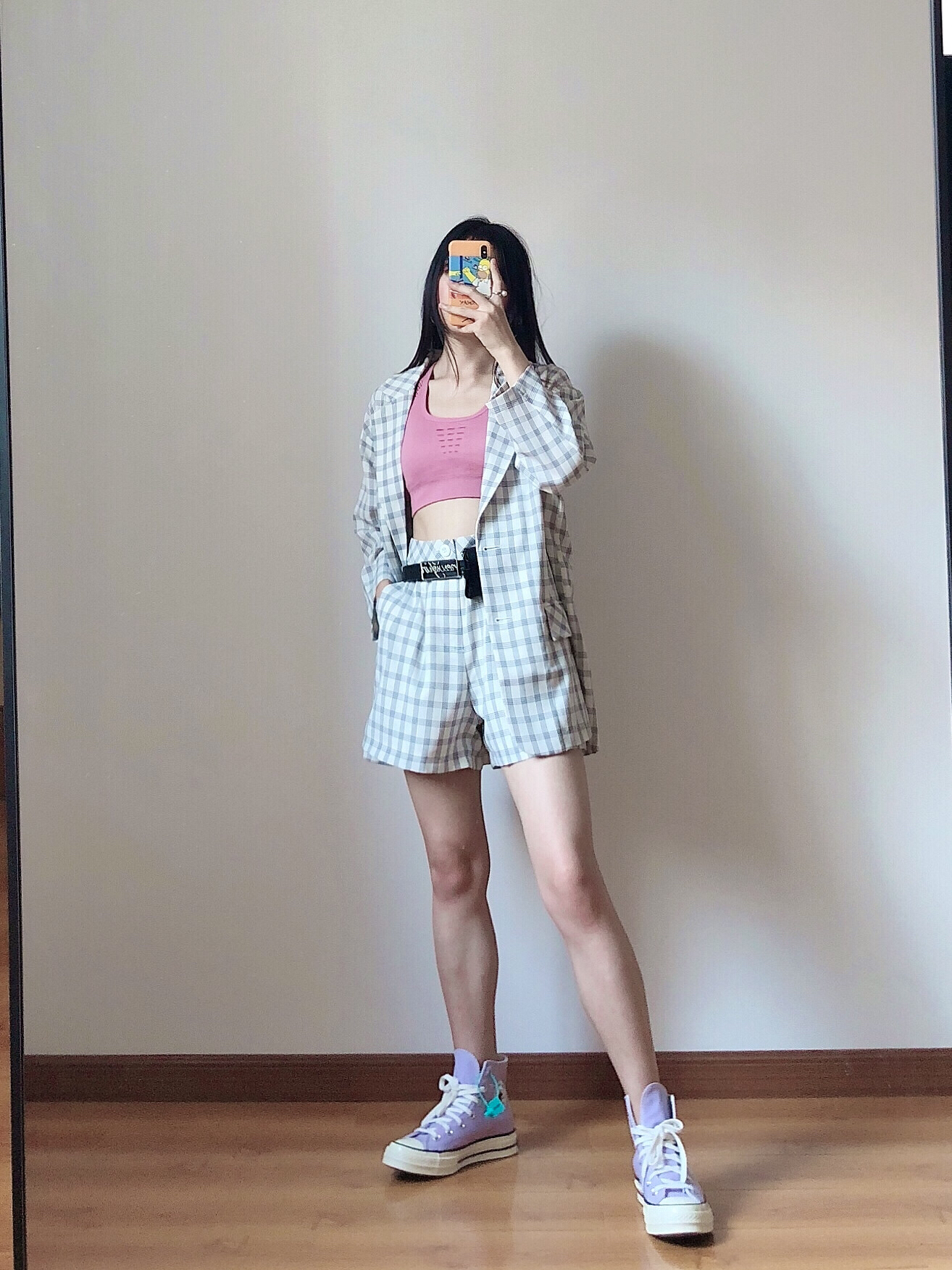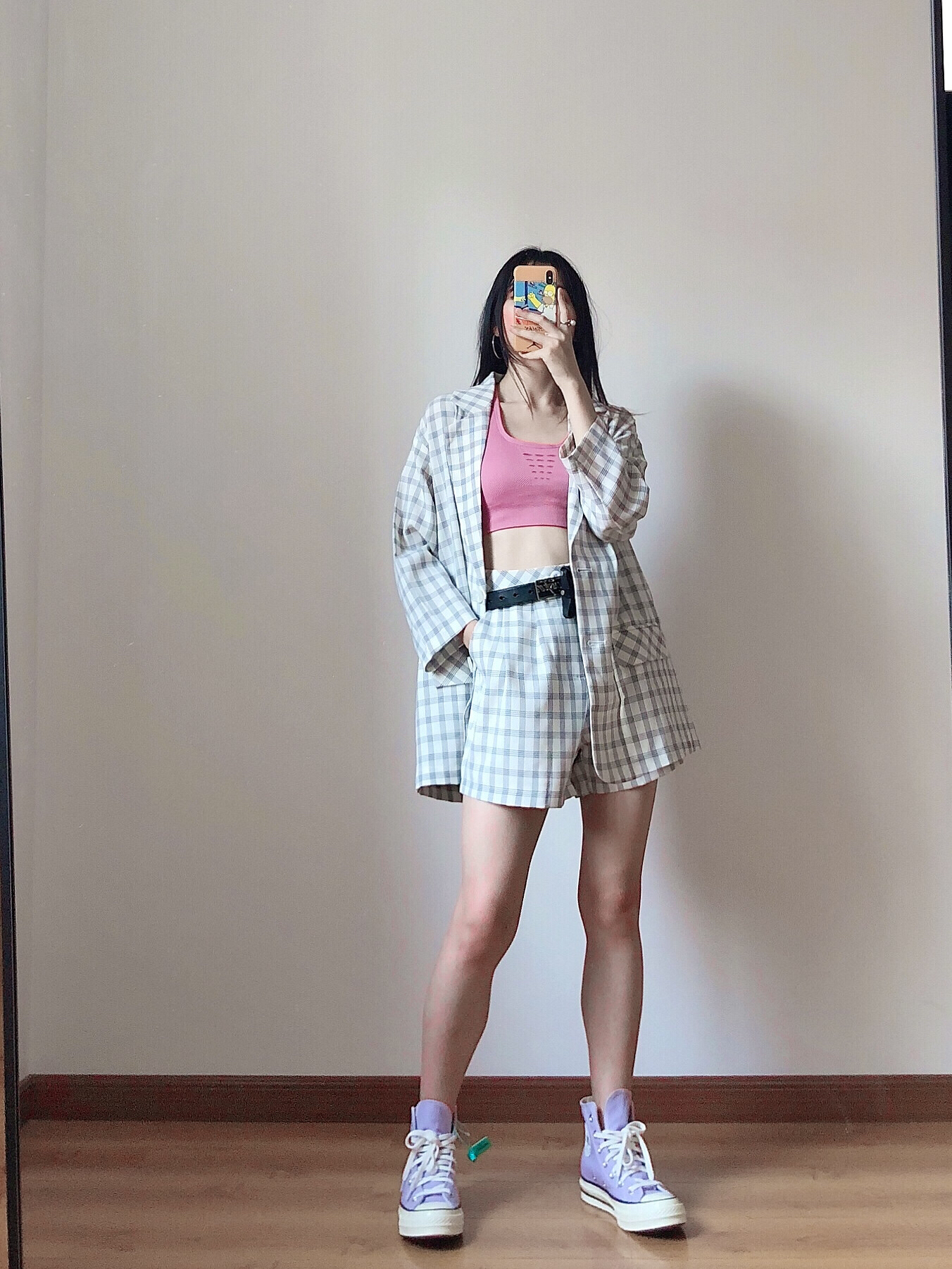👧🏻:熙熙 小个子姐妹,梨形身材,小腿略粗 身高:155cm 体重:82斤 鞋码:36码 胸围:74cm 腰围:60cm 臀围:84cm 肩宽40cm 大腿围:42cm 小腿围:30cm ⚠️:熙熙拍照绝不拉腿不瘦腿,150-160身高的老铁都可以借鉴 —————————— 🧥:格子西装外套短裤﹣﹣韩都衣舍 格子西装很有质感,棉麻质地,上身很舒服。 · 🎽:粉色运动内衣﹣﹣MKMJ 这款运...
