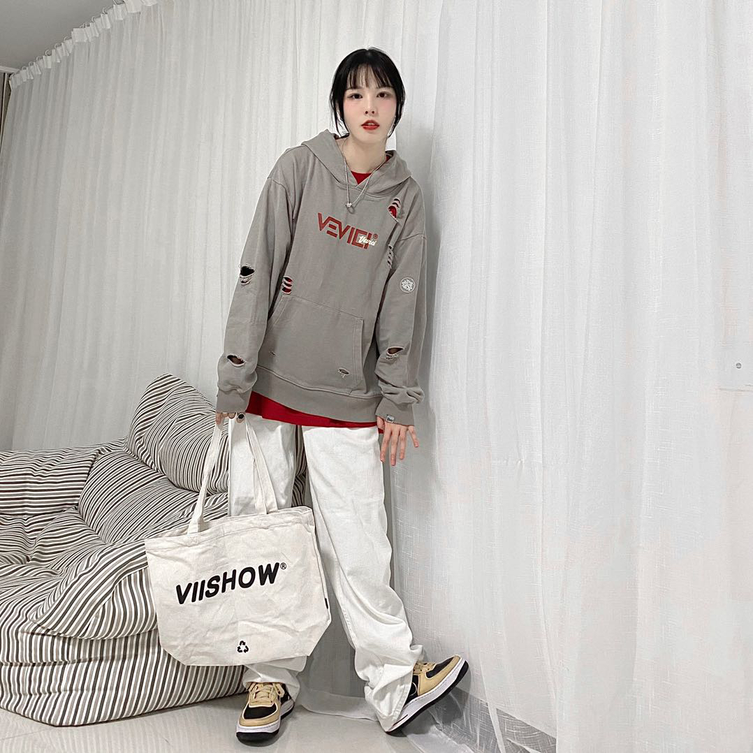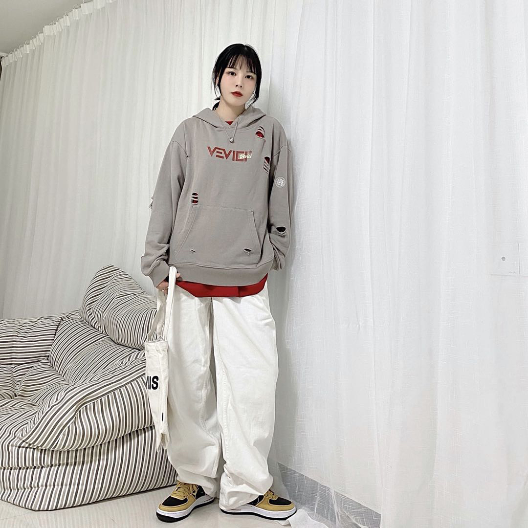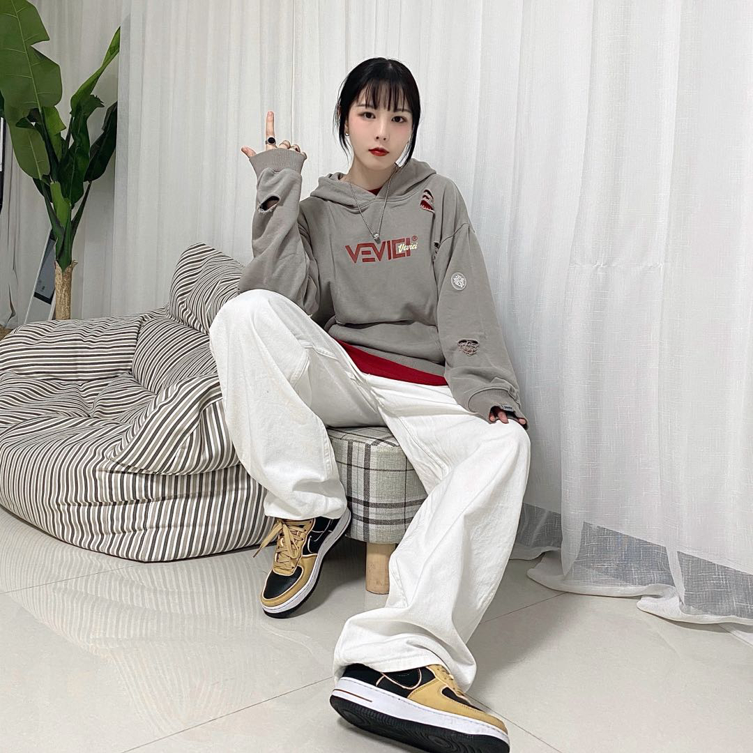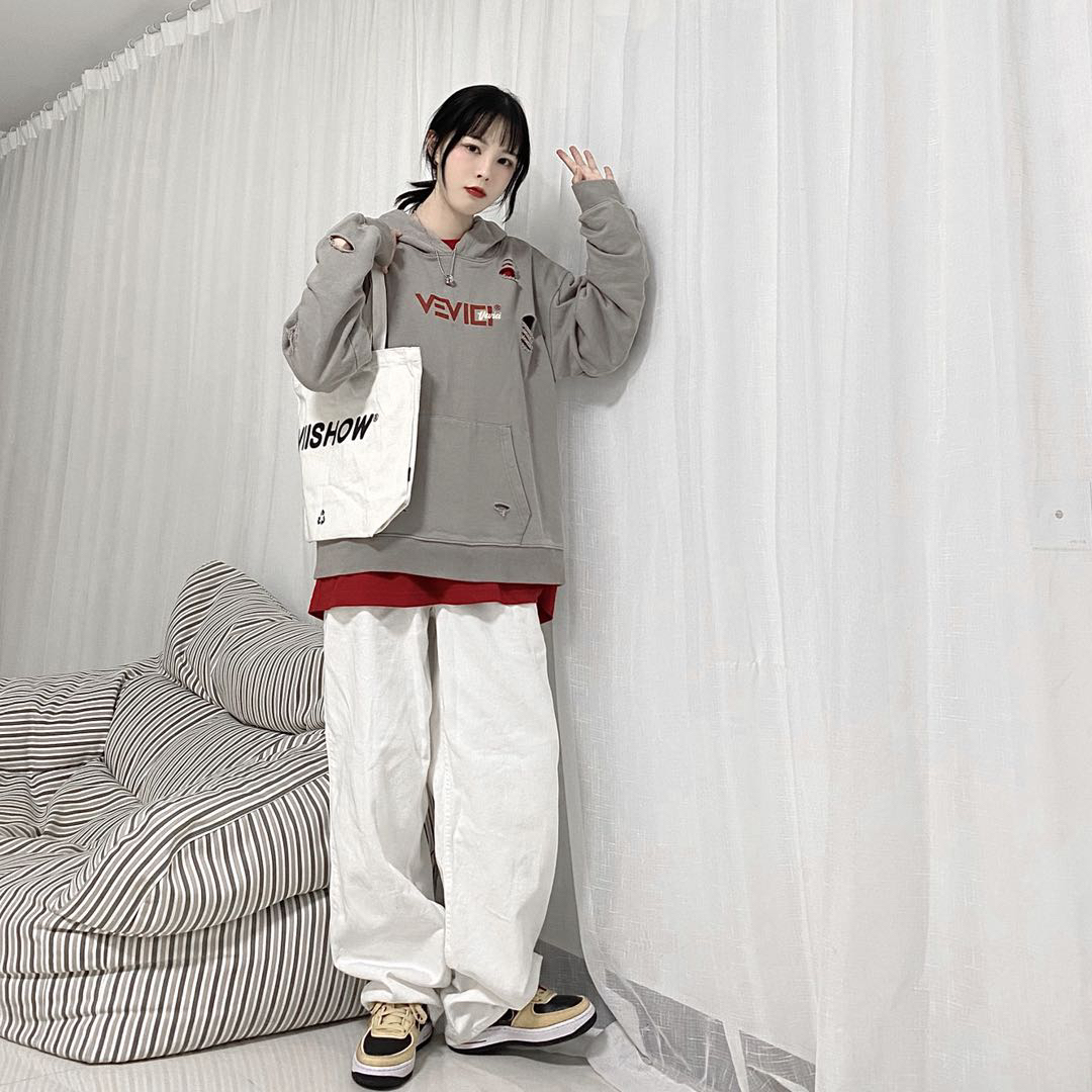 卫衣👔:VEVICI 裤子👖:UMICHOI 鞋子👟:nike 提包👜:VIISHOW 卫衣:灰色再搭配红色logo真的很好看 再融入破洞元素 显得非常的高级 裤子:非常喜欢的一个白裤子 裤长很长 是长腿女孩子的福音 鞋子:黑色搭配小麦色的af1太百搭了