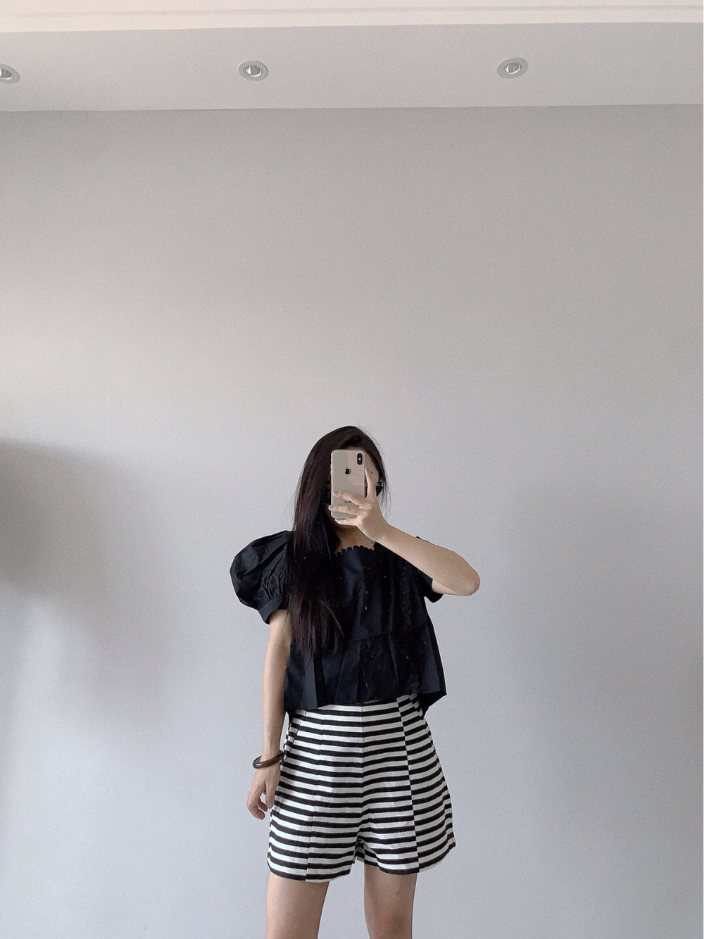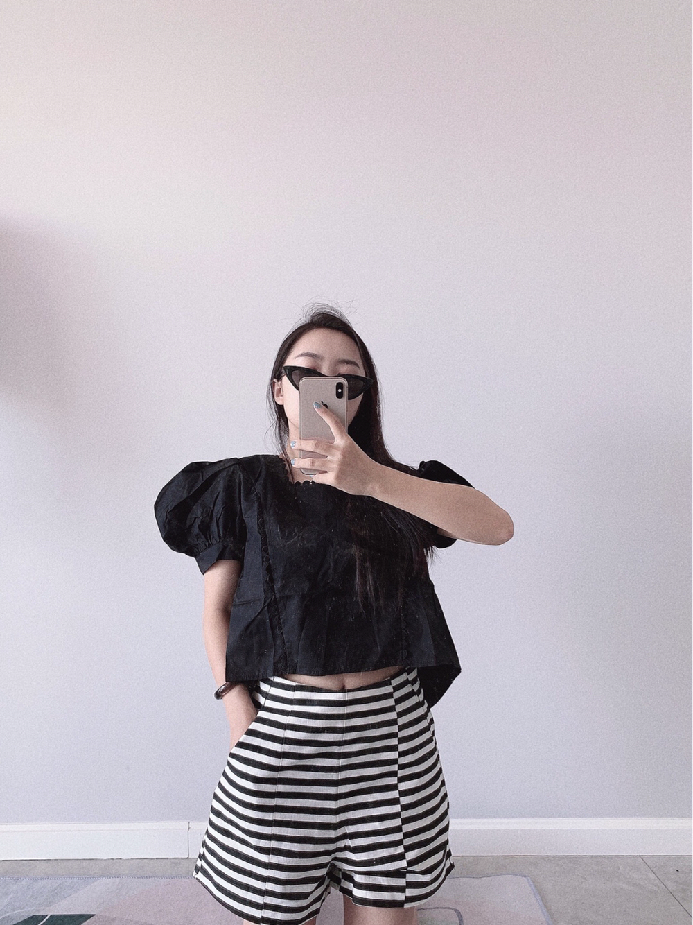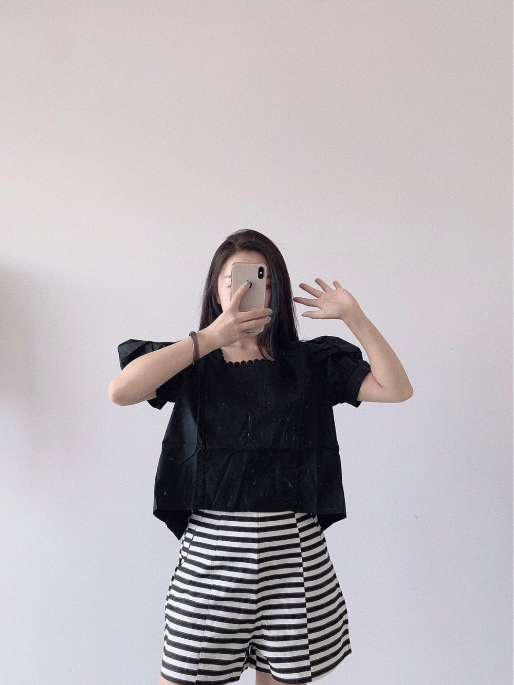 大家好 这里是乖崽 🧸 身高153 体重72 对镜拍又来啦 🎈 新入的套装 特别乖乖女的一套 我超爱泡泡袖的 因为自己肩窄 希望视觉上加宽🤣 上衣有小心机的哦 领口和衣身上都有同色花边的点缀 增添了层次感和设计感 配套的条纹短裤 高腰很适合小个子的 侧拉链的设计穿脱也方便 一套搭配好看又方便 也可以分开来穿 这就是我喜欢套装的原因 嘻嘻嘻嘻 🌟衣服:zwjzbm 🌟人字拖:步...