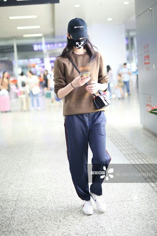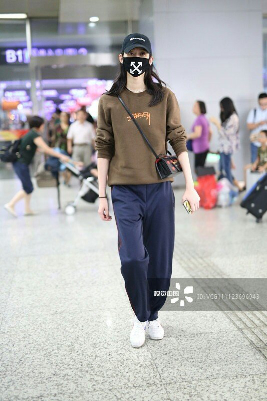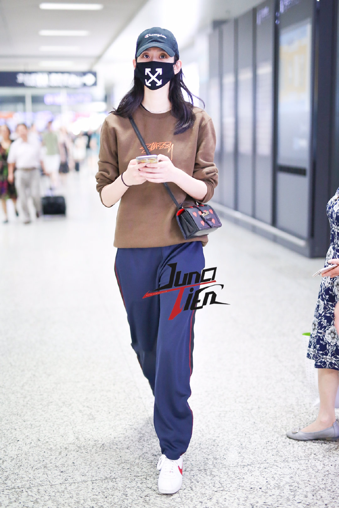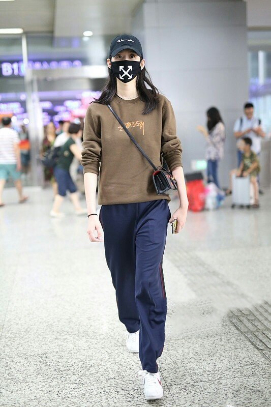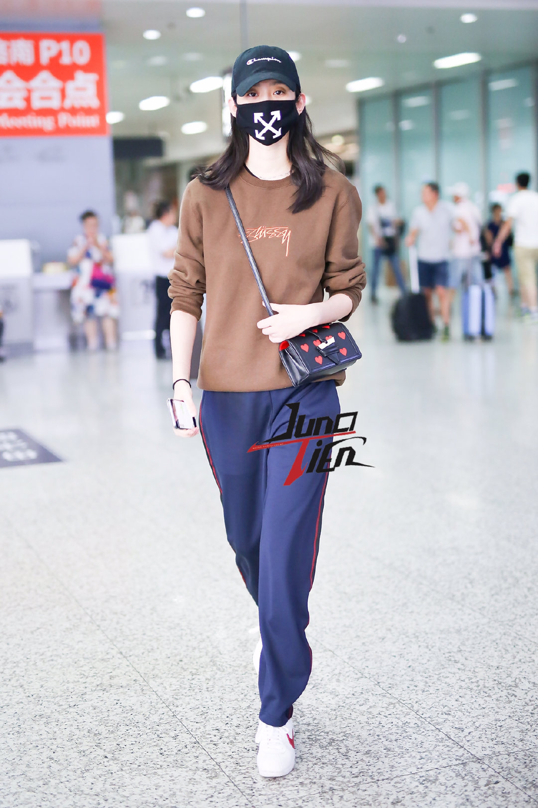 奚梦瑶2017年8月19日现身上海机场✈️,身穿Stussy棕色刺绣卫衣搭配深蓝色运动裤,配一双Nike运动鞋,休闲舒适又低调大方,满满的超模酷帅范风~ 商品名称:【 奚梦瑶同款】Stussy 草写刺绣LOGO 圆领卫衣 黑 Nike Court Royale 白蓝红