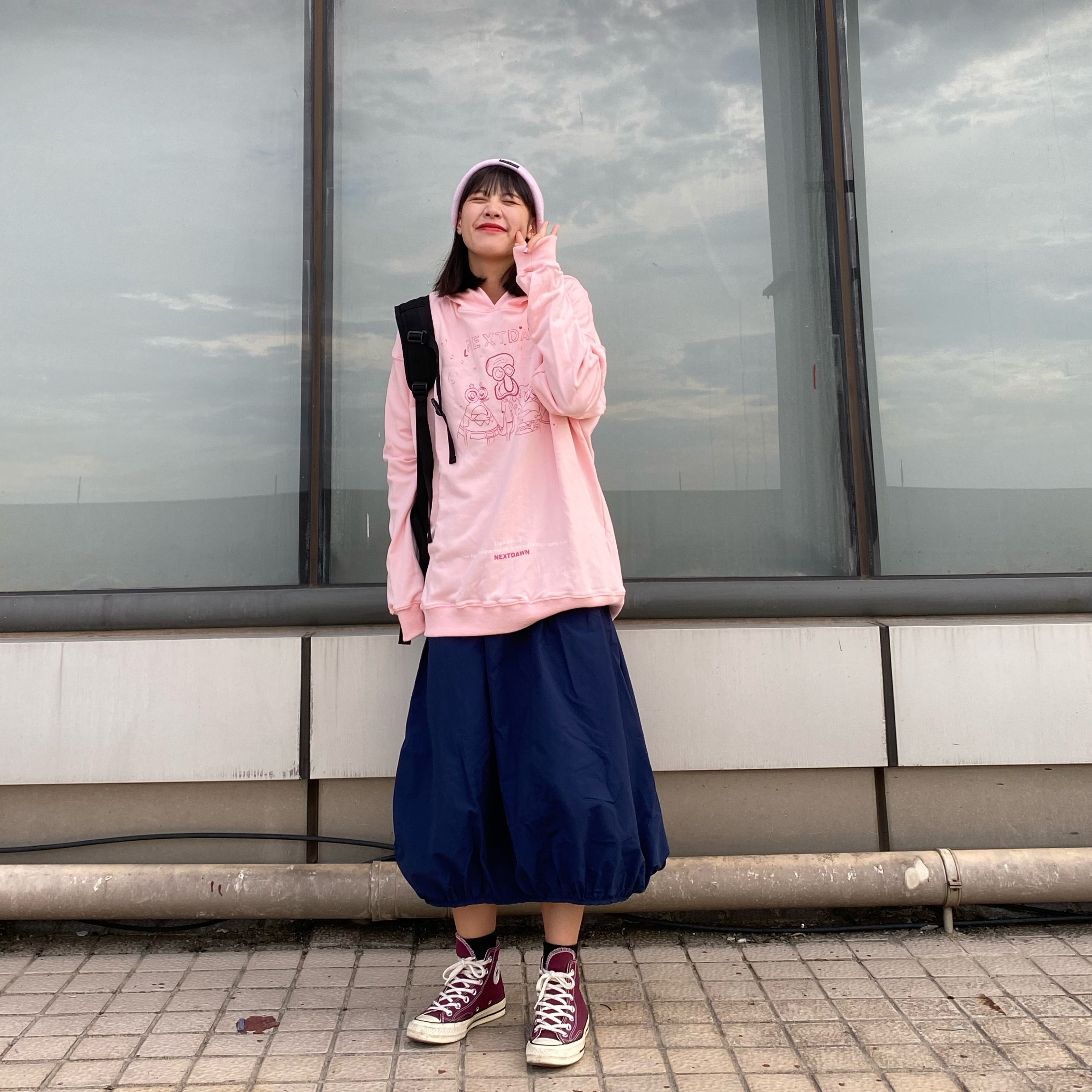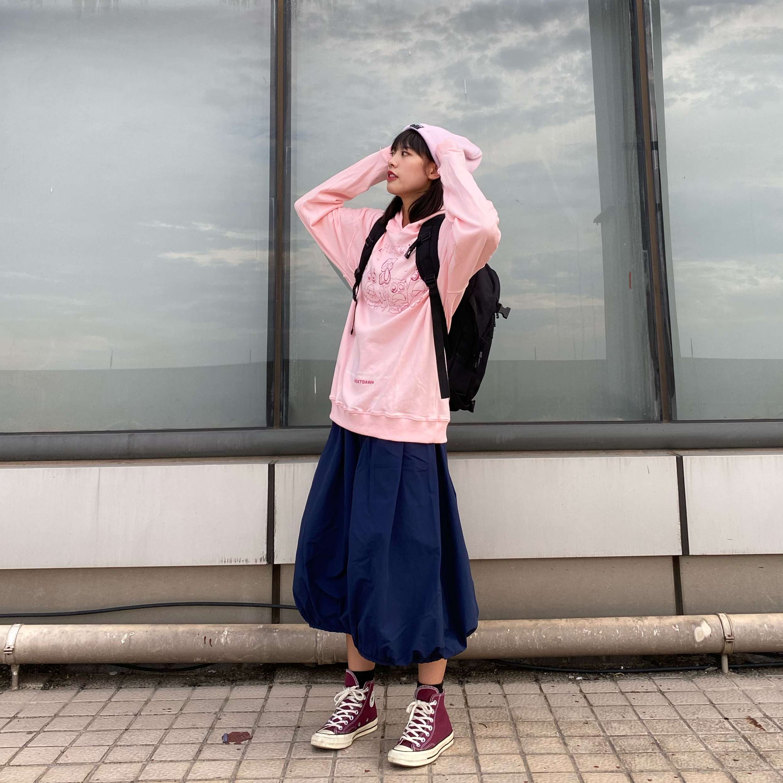 1. 粉色帽子超嫩 去年买的puma 2. 卫衣偏长 是海绵啵啵印花滴 3. 深色工装灯笼裙搭配 4. 红色系低调的匡威1970一双 5. 随便抓一个60块钱小书包 怎么说?也是简简单单嗷