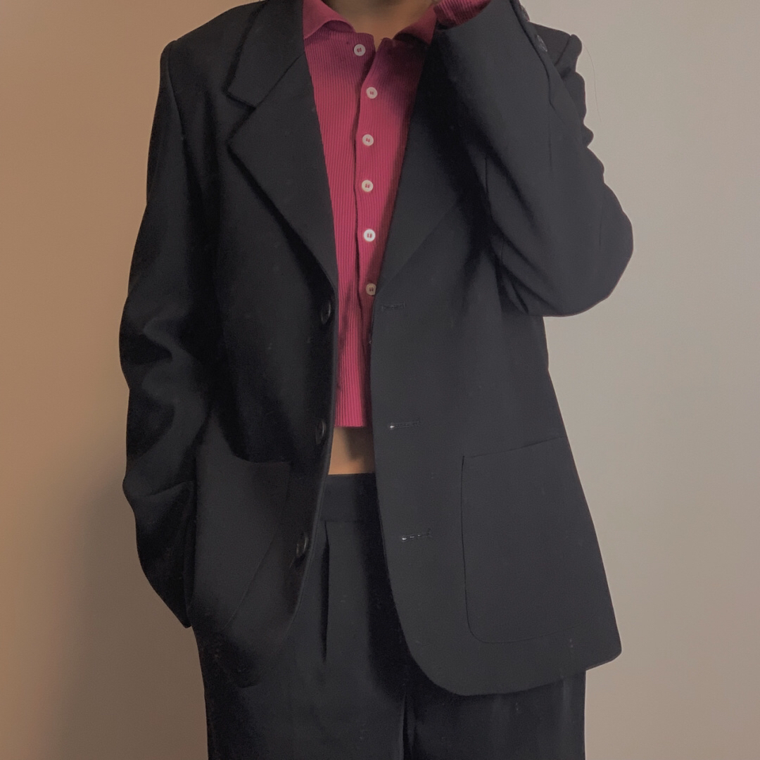 6️⃣玫红色针织长袖(BrandyMelville)➕黑色西装外套(FFFFOX)➕黑色西装裤 这个针织超级🉑玫红色也很特别 穿上西装的我,觉得自己很飒