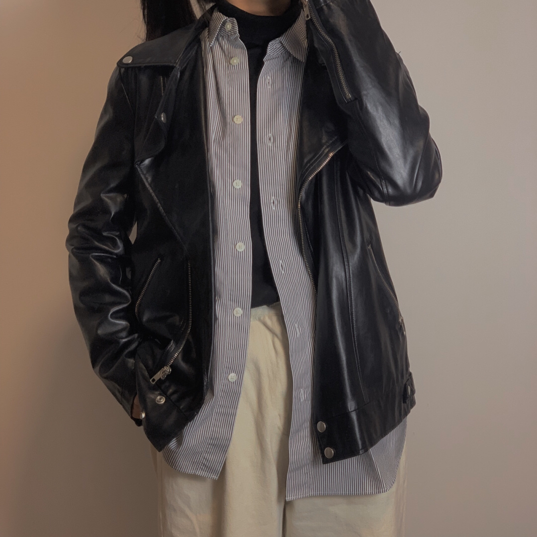 3️⃣黑色摇粒绒高领打底(优衣库UNIQLO)➕条纹长袖衬衫(优衣库421516)➕黑色皮衣➕白色牛仔裤 皮衣一穿,谁也不爱,就是这么帅气 4️⃣红色高领毛衣➕白色休闲阔腿裤(神游家定制) 我爱红色❤️这身怎么样?哦不OK??