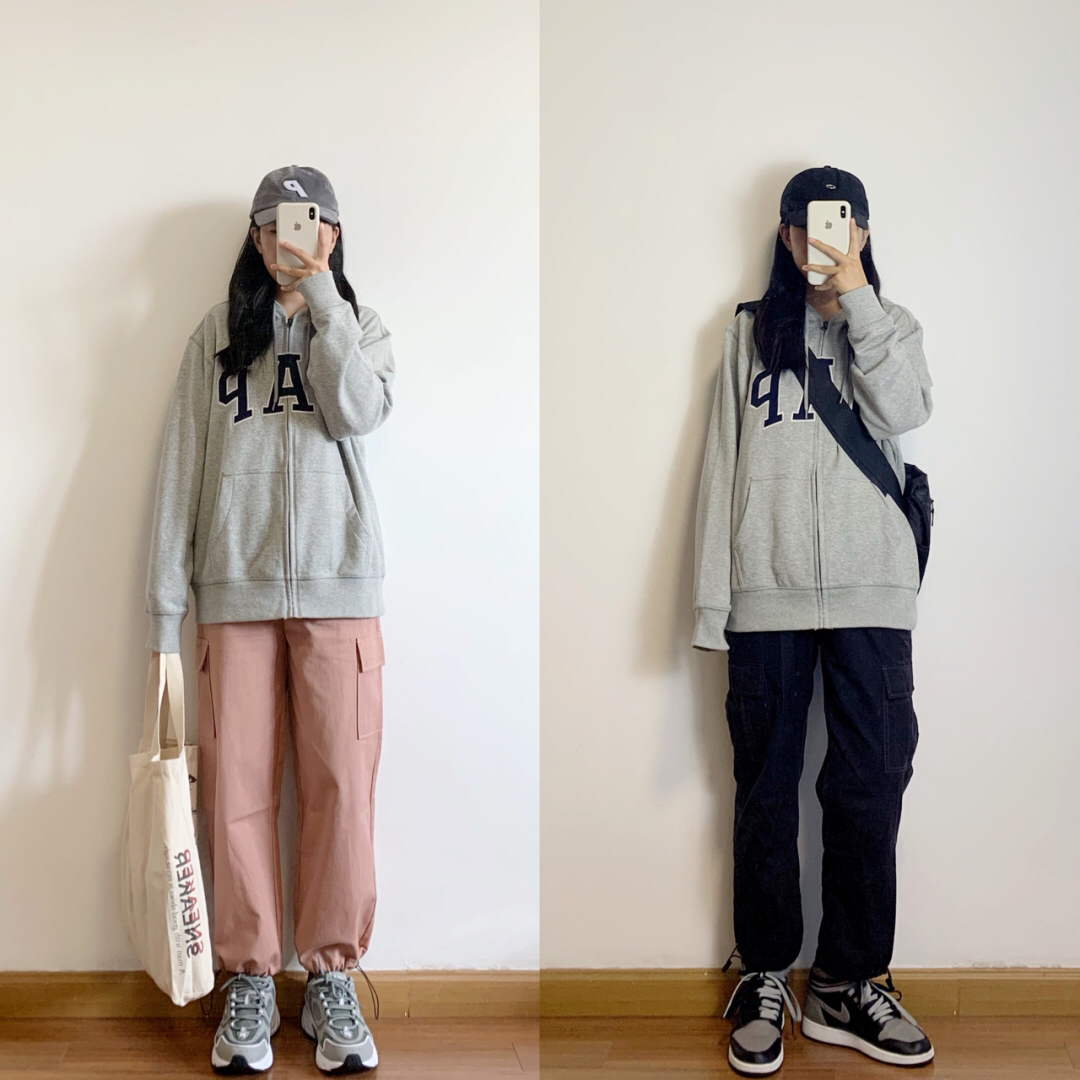 毛呢格子羊羔毛棉衣➕棕色翻边直筒裤➕黑武士运动鞋(亚瑟士)/高腰显瘦半身裙➕粗跟小皮鞋(同1️⃣) P4️⃣ 灰色字母卫衣开衫(Gap 490384)➕粉色工装裤➕白色洞洞鞋(littlegood)➕多口袋黑色工装束脚裤(BLUELAND线上)➕AJ1影子灰