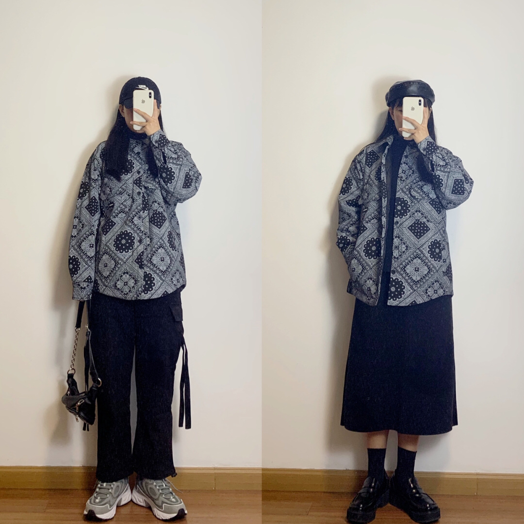 腰果花夹棉外套(UMSSUSP)➕黑色日系工装裤(同上)➕灰色运动鞋(FILA斐乐)/黑色直筒半身裙➕黑色百搭小皮鞋