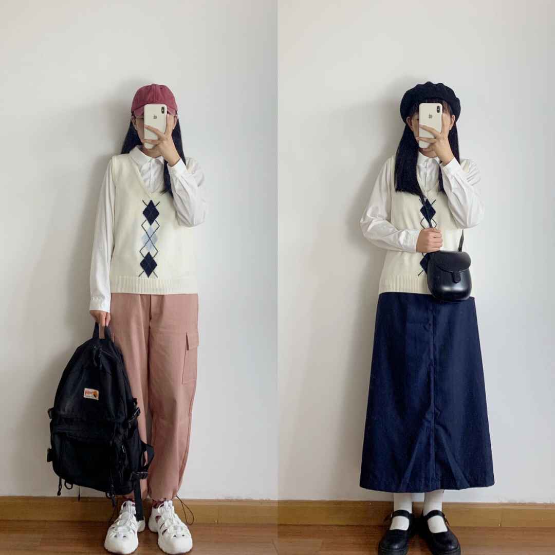 白色长袖衬衫(没烦恼很幸福)➕菱格针织背心➕粉色束脚裤➕白色运动鞋/藏蓝色半身裙(oui oui market)➕黑色学院风小皮鞋