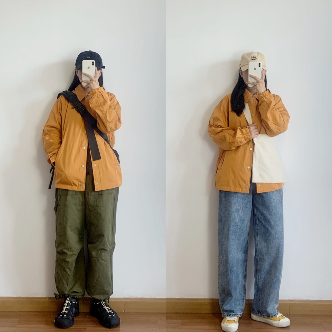 中黄色教练夹克(WASSUP)➕军绿色工装束脚裤(SEEKSIMPLE)➕高帮袜子鞋/深蓝直筒阔腿牛仔裤(YcccAli)➕黄色低帮帆布鞋
