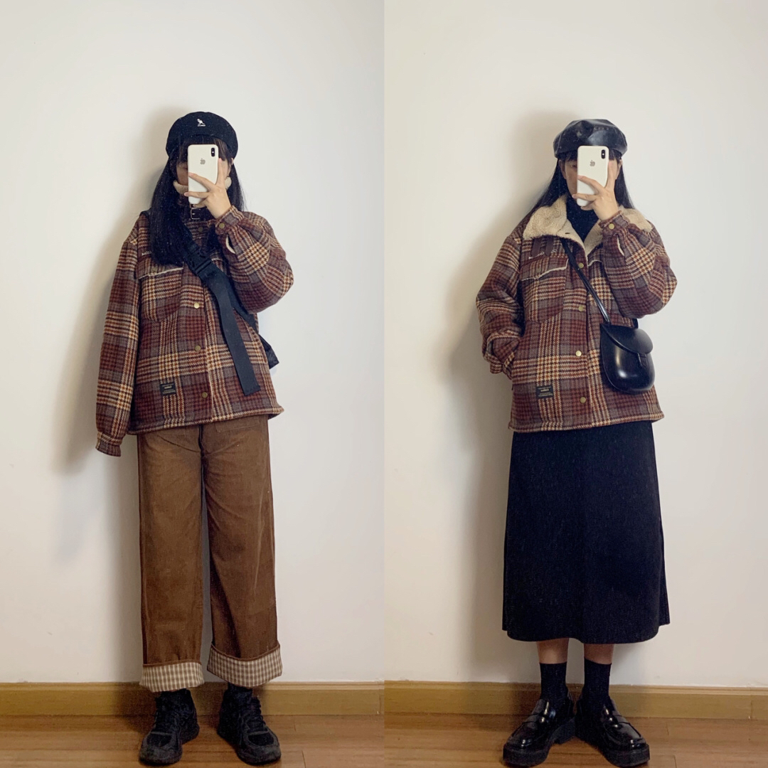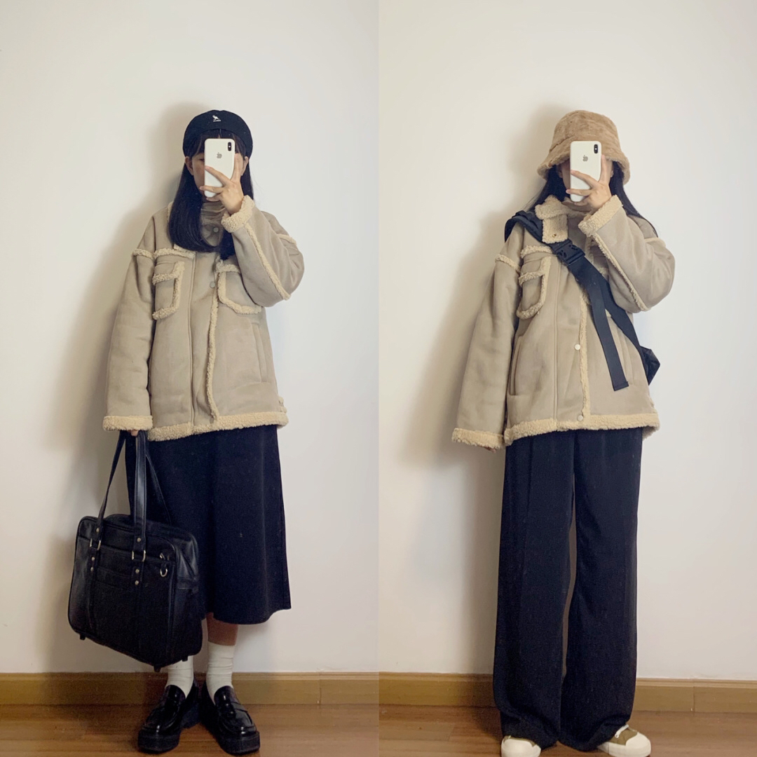 麂皮绒羊羔毛外套(UMSSUSP)➕黑色毛呢半身裙(同上)➕黑色英伦风松糕鞋/黑色西装长裤➕深米色帆布鞋(无印良品)