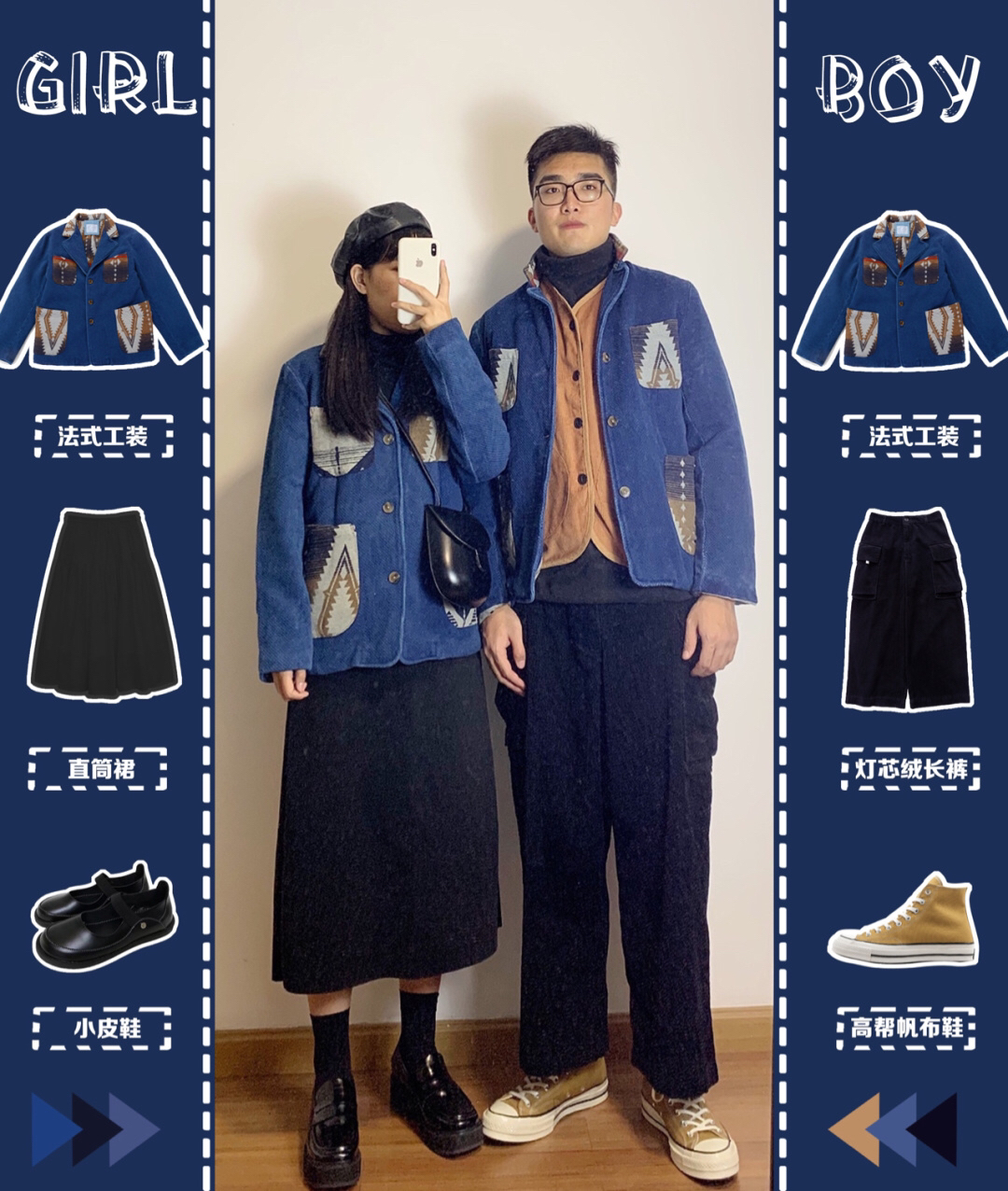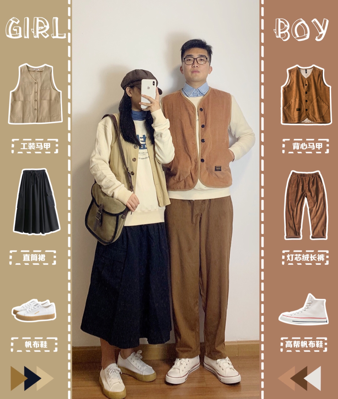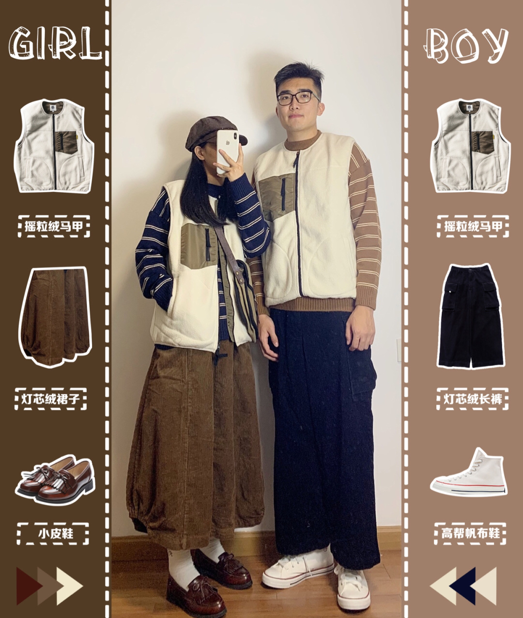 如果你是海风我是盐🧂情侣套装都给我穿起来🥰卫衣就很好搭配了叠穿堆堆领打底,加一个马甲,再来一条百搭的黑色半身裙;他也心有灵犀的和我一样选择了外穿马甲,裤子是马甲同色系灯芯绒长裤