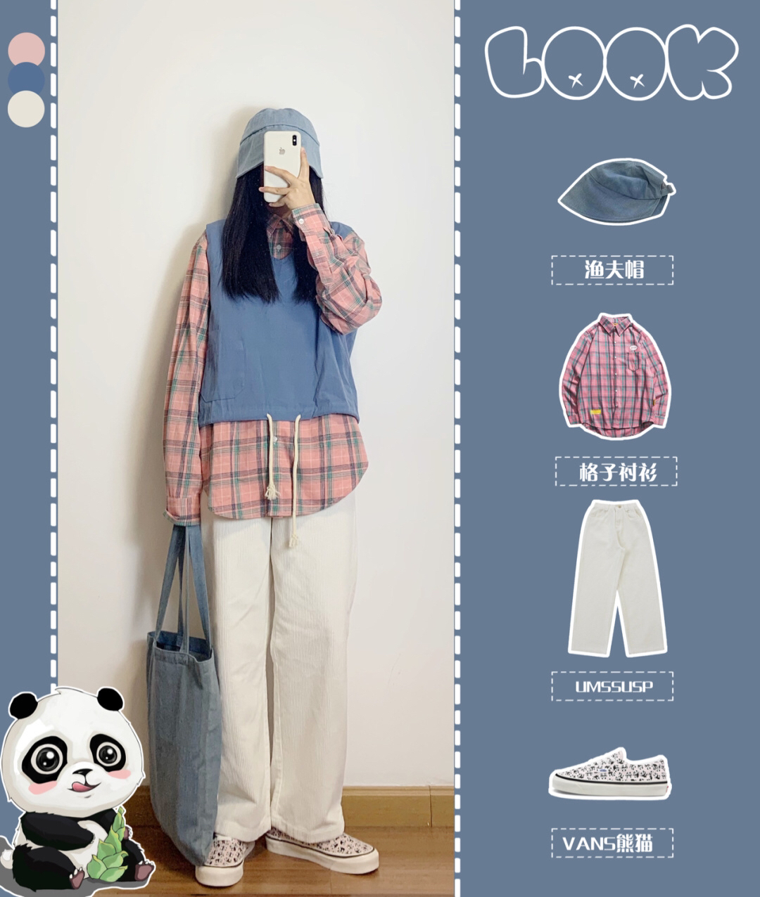 2️⃣粉色格子衬衫➕蓝色工装马甲➕灯芯绒长裤 🧸格子衬衫我的爱,正好和vans熊猫的粉相呼应,搭配个蓝色马甲,帽子选的也是蓝色💙
