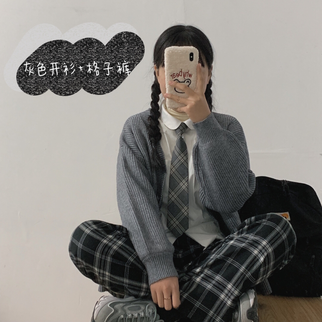 圆领衬衫、麻灰色开衫:没烦恼很幸福