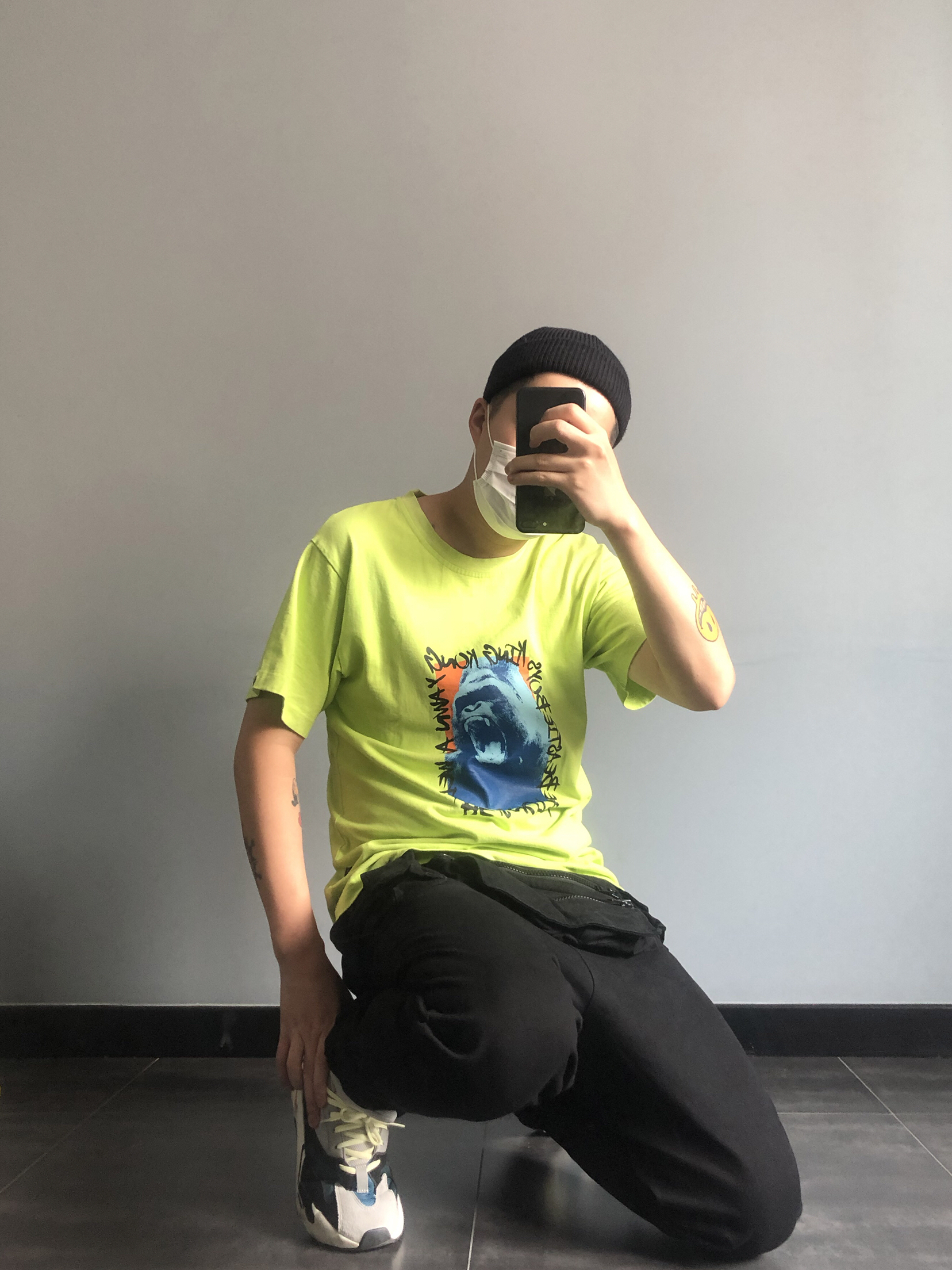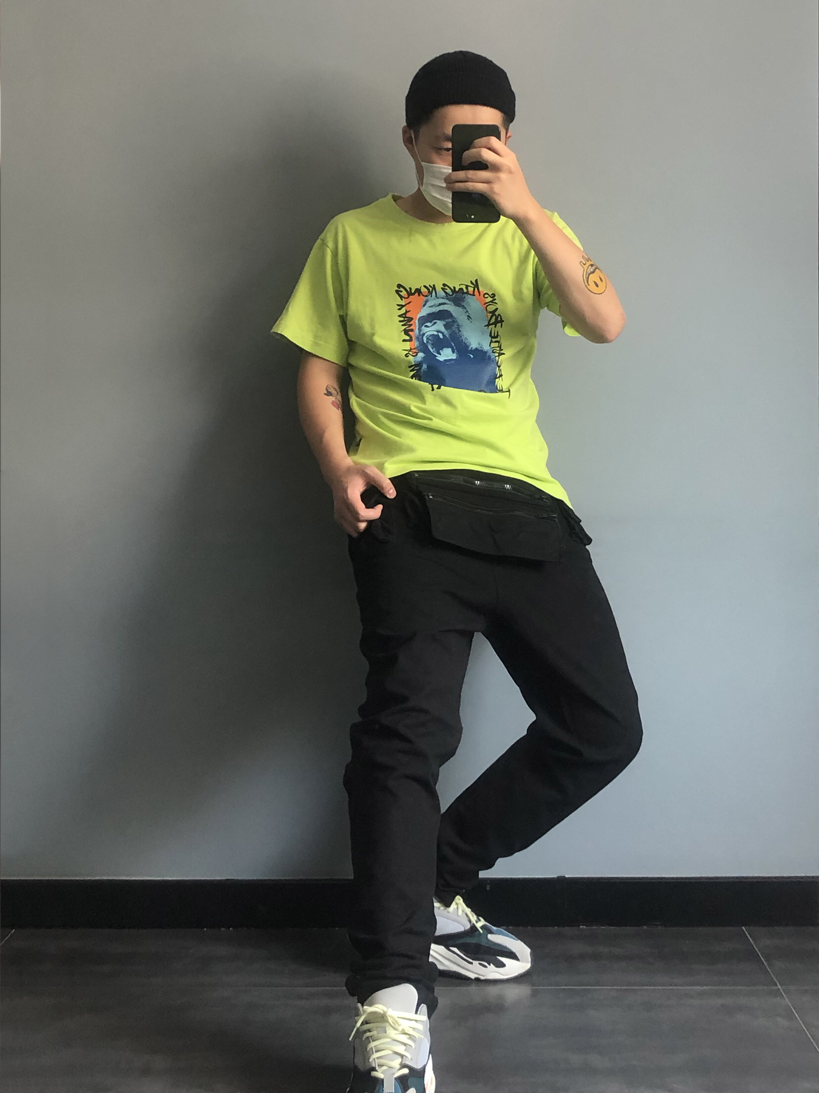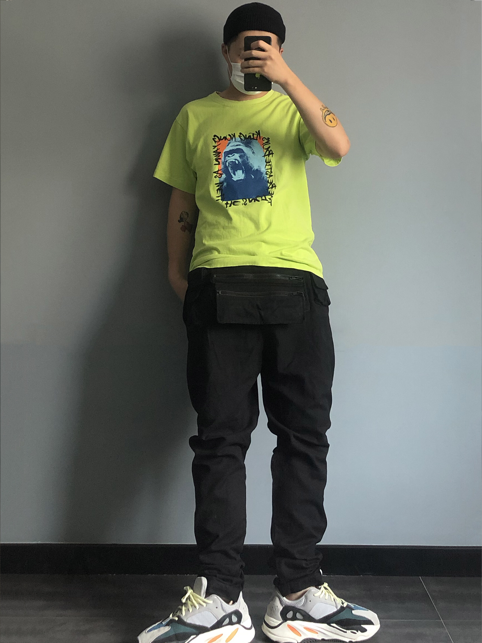 五分钟出门穿搭 害 都是些去年款了 亮绿色的衣服 简易的印花 (🍑whoosis) 和椰子来一个小衔接 裤子来一条FFF的战术口袋裤 裤子反穿 妹子翻翻 多口袋式让整体更显层次 再配一个小瓜皮 轻轻松松出门嗨 掌握心得 啥也不说 🐛就对了