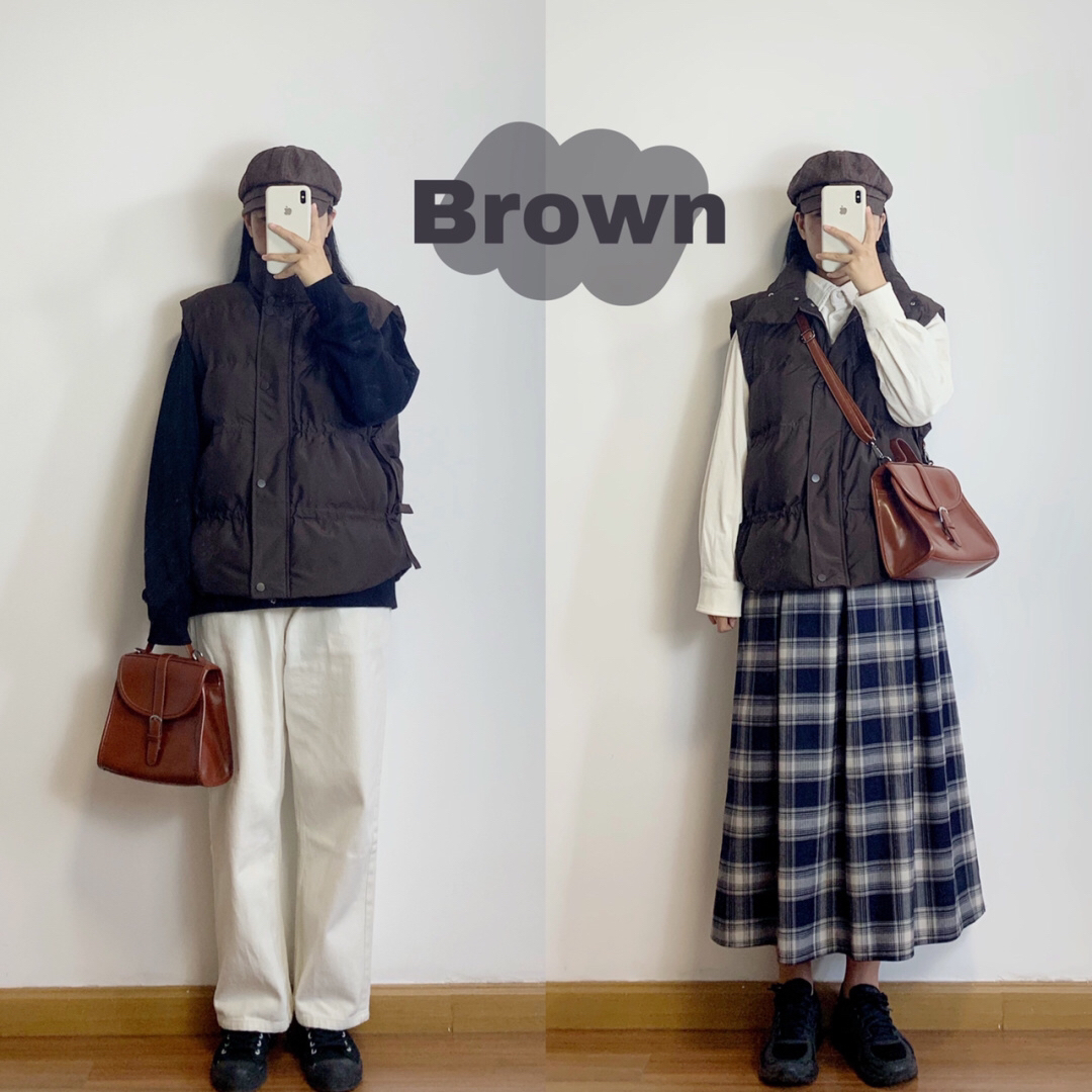 咖色马甲背心外套(AMLUS STUDIO)➕黑色泡泡袖圆领套头卫衣(太平鸟)➕米白色休闲卷边裤(神游家定制)/米白色灯芯绒衬衫(西遇12191654)➕复古格子半身裙(好玩和有趣)