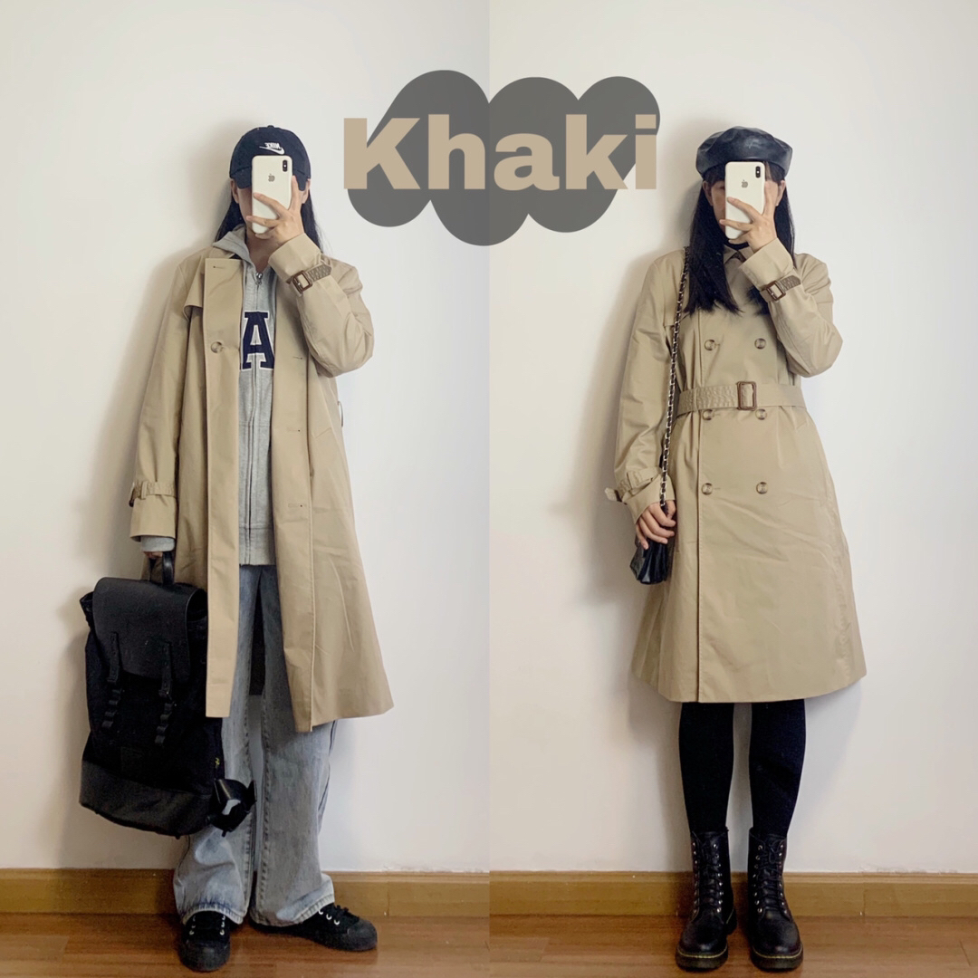 卡其色风衣外套(UNIQLO优衣库409858)➕麻灰色连帽卫衣开衫(Gap490384)➕浅蓝直筒卷边阔腿牛仔裤(SerioLudere)/黑色连脚打底袜(小红书黄小姐家)