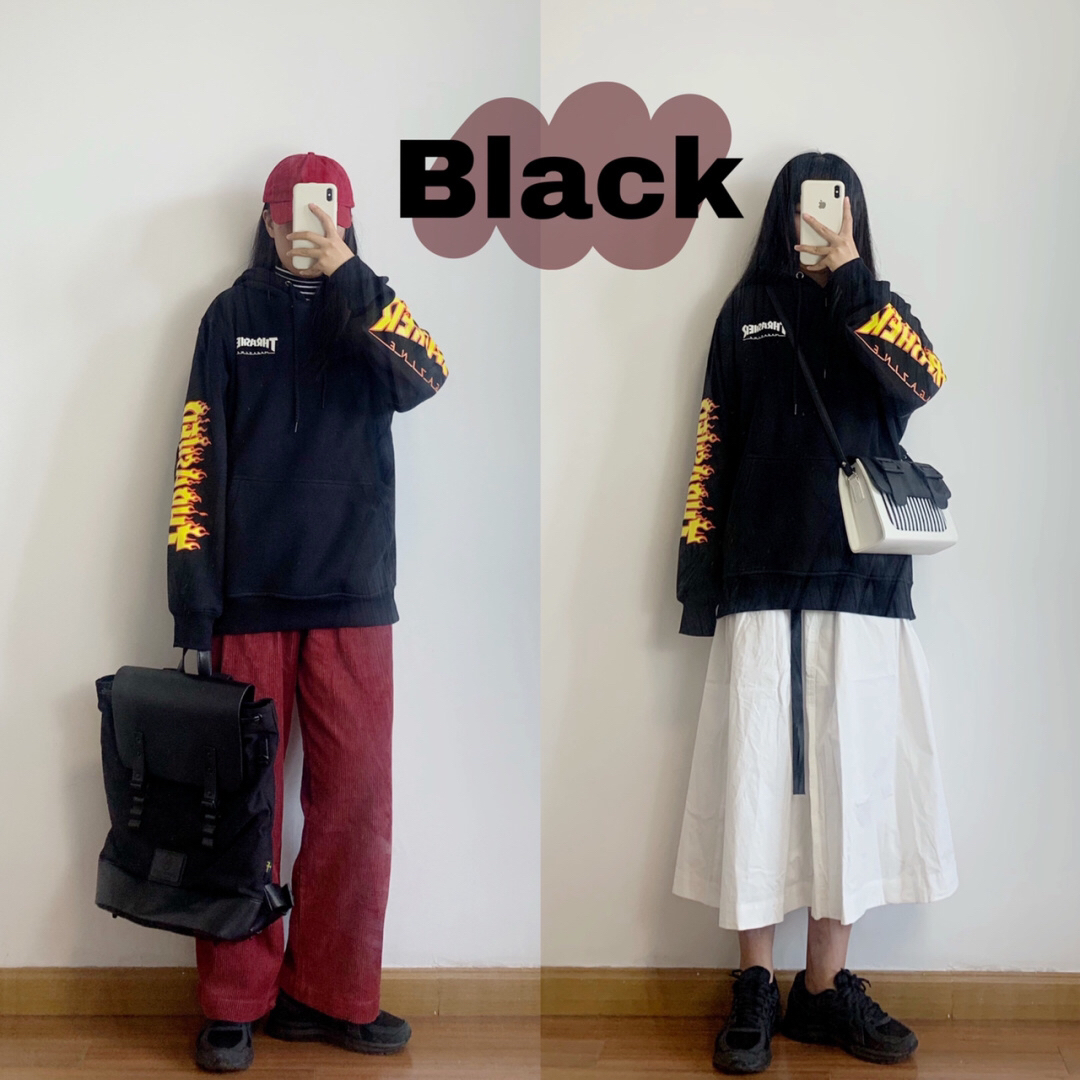 黑色Thrasher手臂火焰连帽卫衣(购自 @夏欧巴skr 买的L码,是加绒的,所以特地买大一码)➕酒红色直筒加厚灯芯绒阔腿裤(卤卤lulu)/白色百搭半身伞裙(Indigo Blue沉入深蓝)