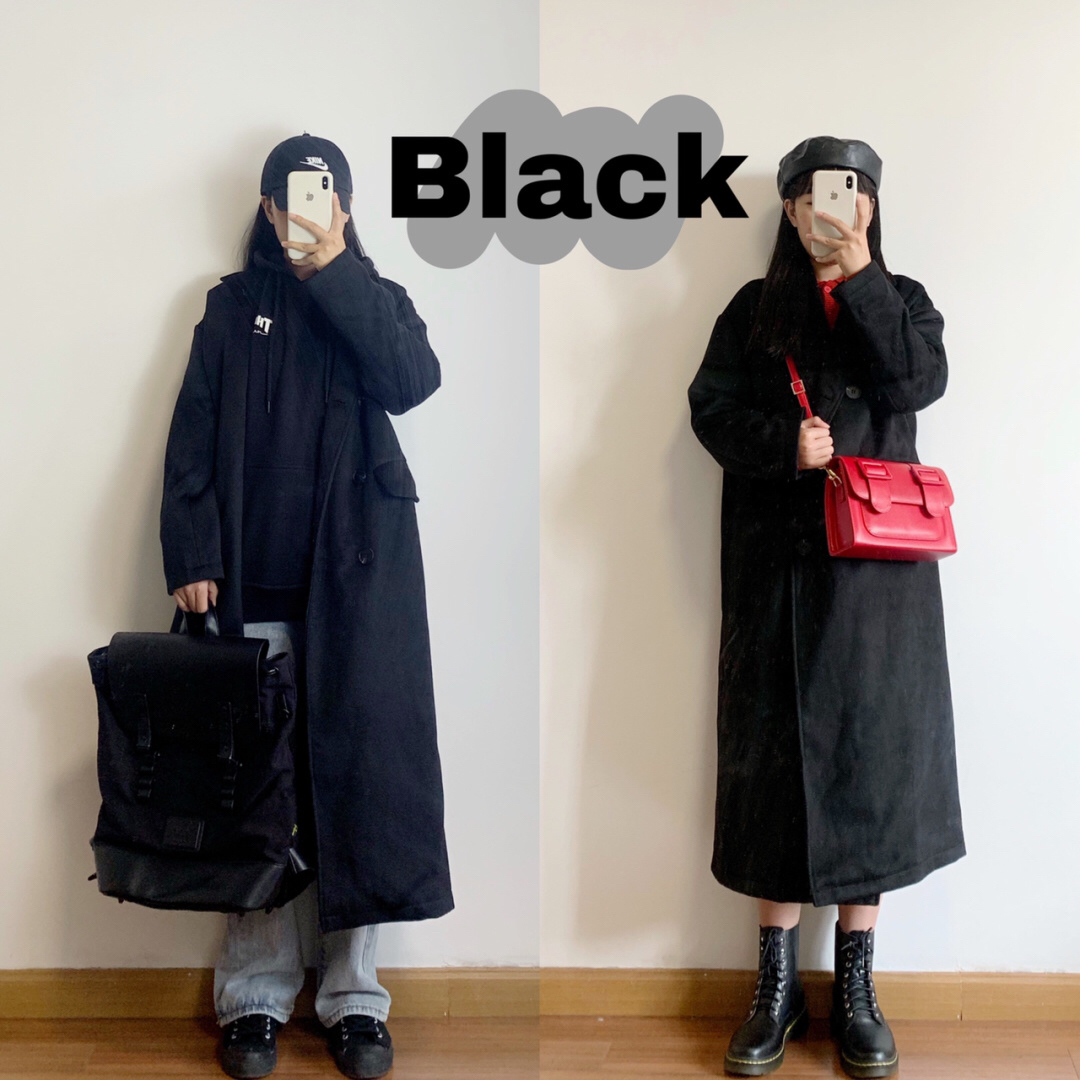 黑色长款双排扣呢子外套(bella museum)➕蓝色显瘦牛仔裤(同P1)➕红色娃娃领针织小开衫(SUNNYDAND)
