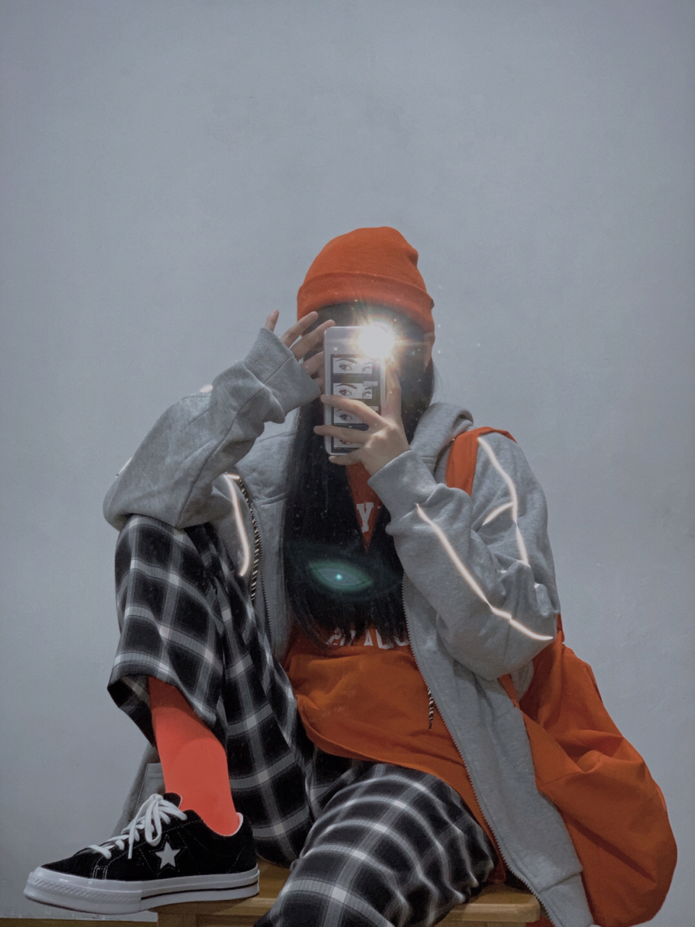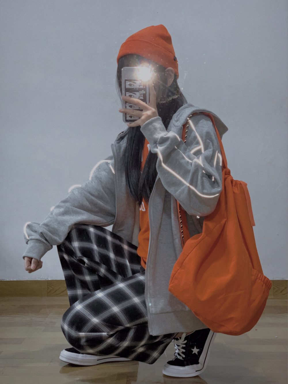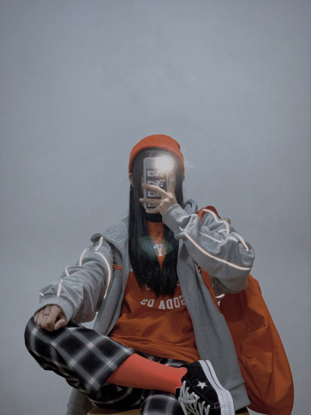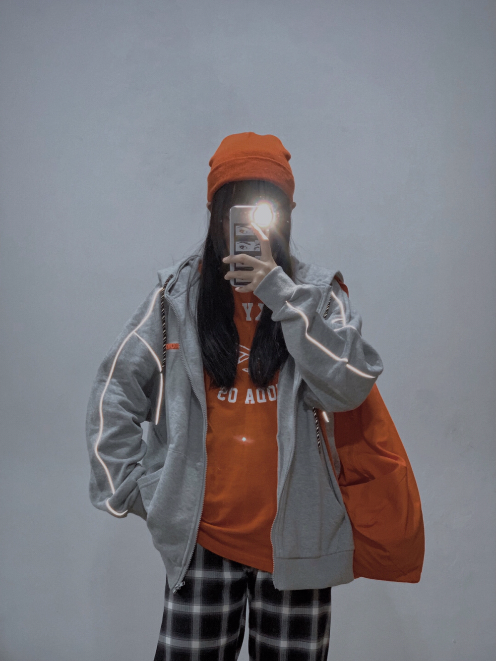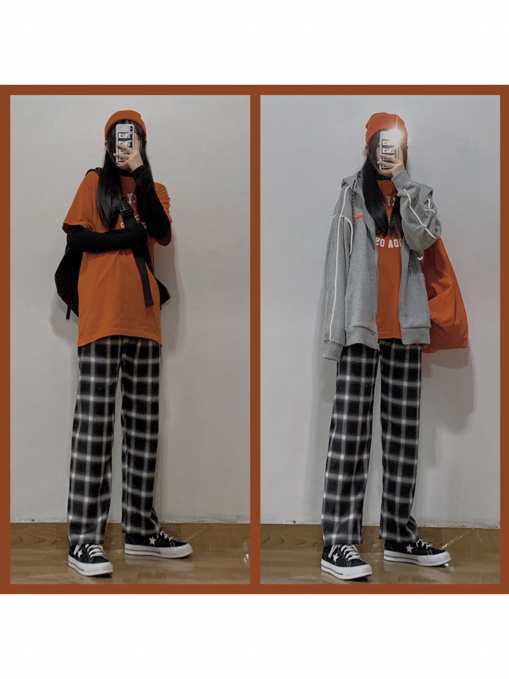 👧🏻身高:164cm 体重:110斤 腰围:68cm 大腿围:54cm 臀围:92cm 小腿围:34cm 小个子女生也可以超酷的😎 灰色卫衣怎么穿🤔酷盖教你帅气叠穿法则 灰橘撞色搭配,绝对让你成为人群中最亮的那个崽 看似简单实则却加了反光条的灰卫衣,未免也太炫酷了吧。而且版型宽宽松松的,基础又百搭!!! 内搭橘色长袖打底,和胸前的字母元素相呼应 下身搭配一条黑色格子长裤,简直不要太好...