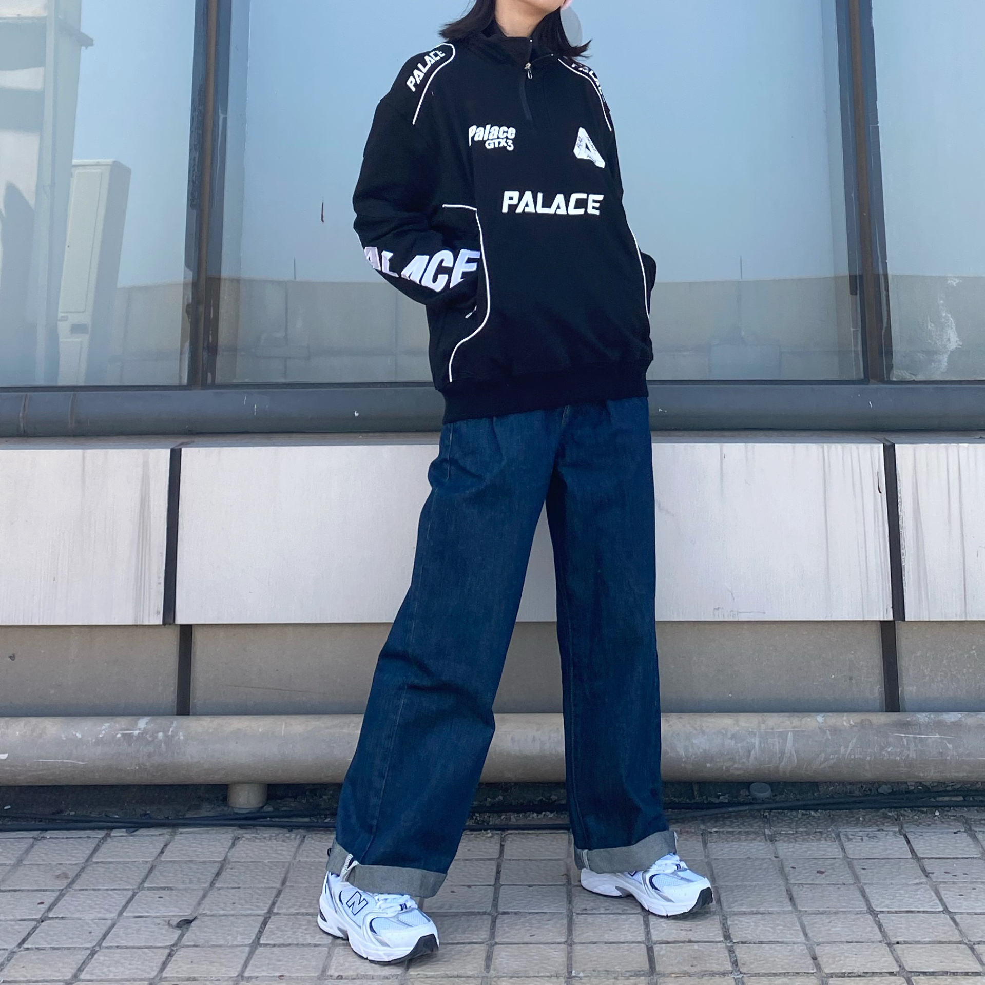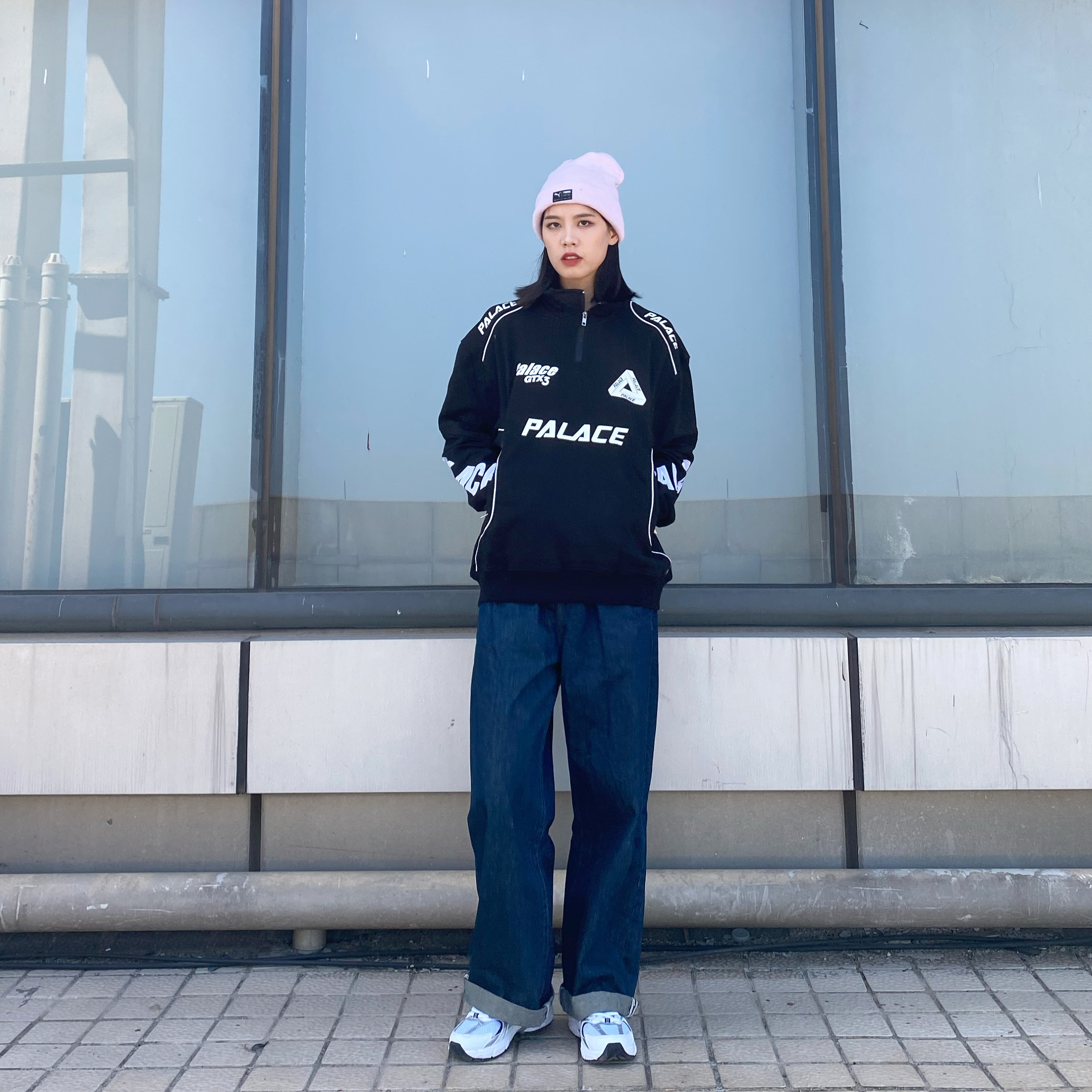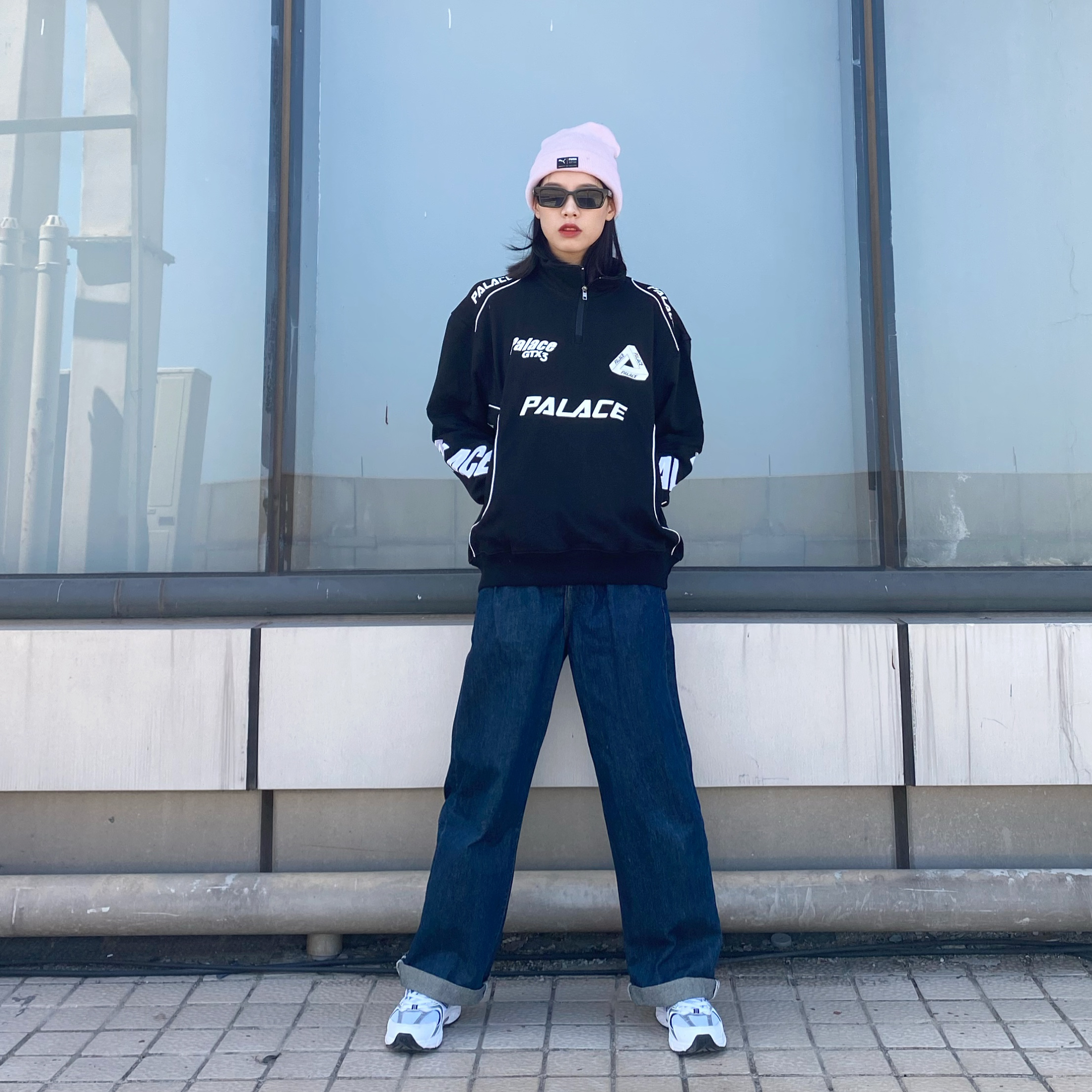 这上衣我寻思也挺正常的 怎么到我这跟开赛车服似的 1. 上衣:还是蛮显瘦的 可能我买的不够大吧刚好的大小不够嘻哈(palacelife旗舰 2. 裤子就这一条 没有链接 下架了 3. 鞋子:确实是跟风买的 百搭没话说但脚感一般般(new balance 530 4. 帽子:粉色很亮眼 嫩!(puma实体店