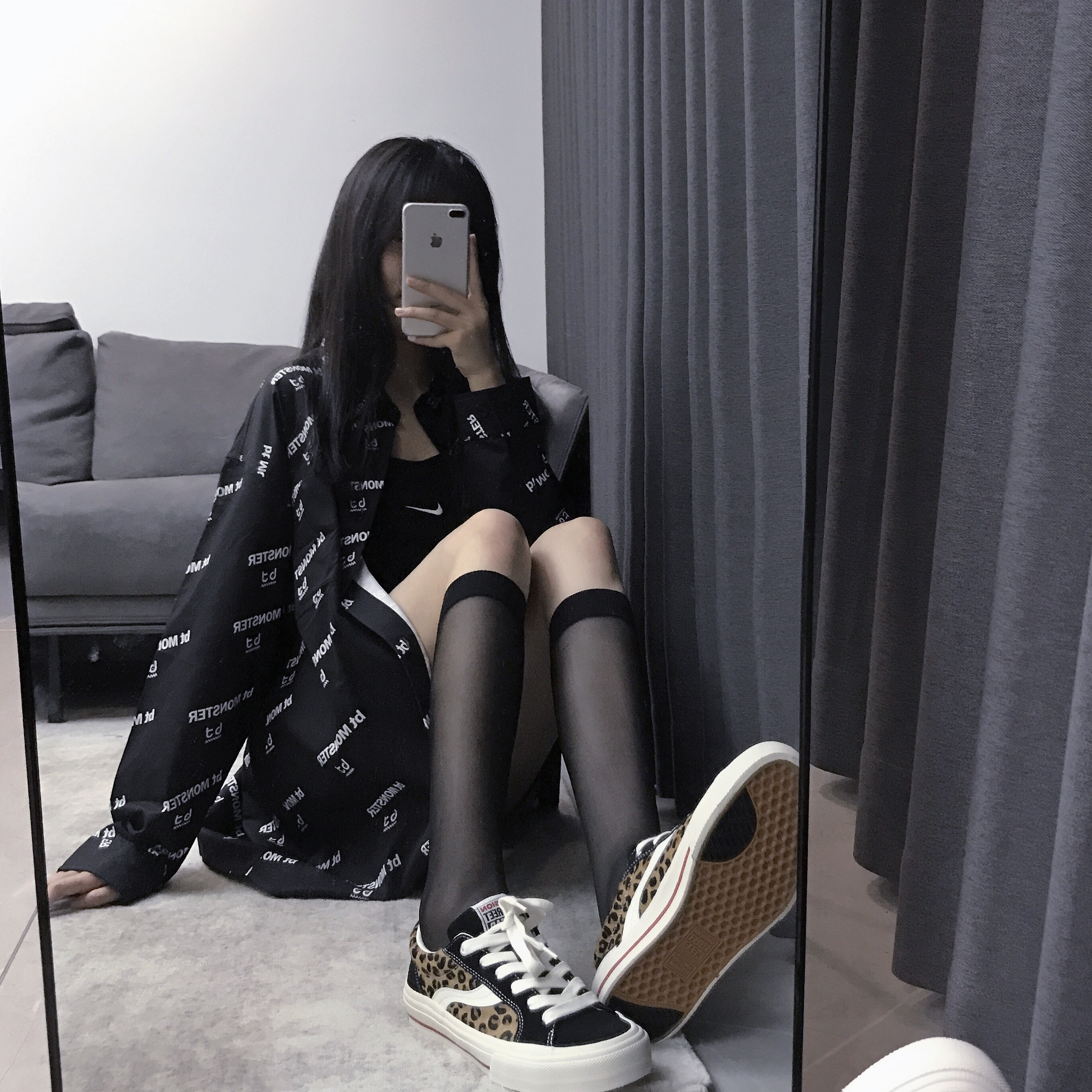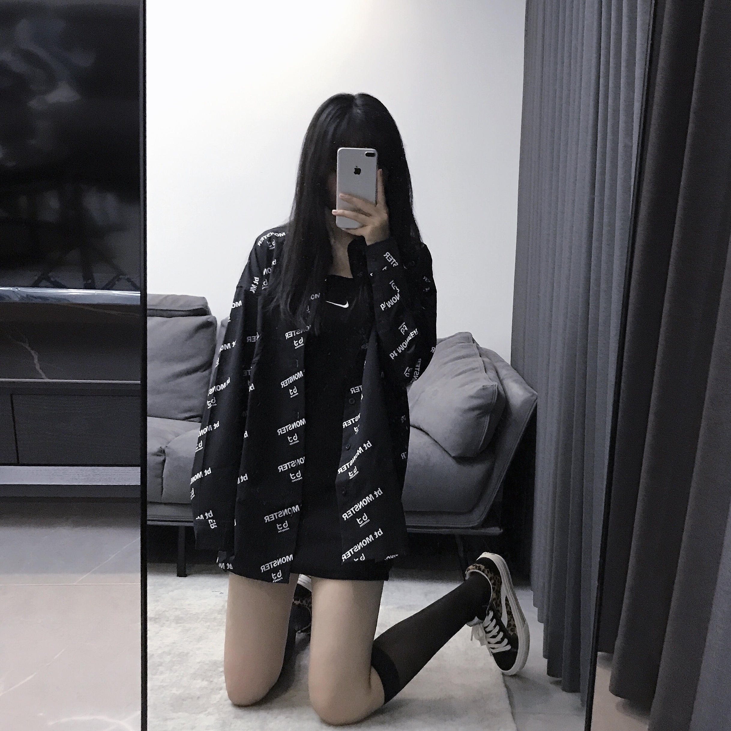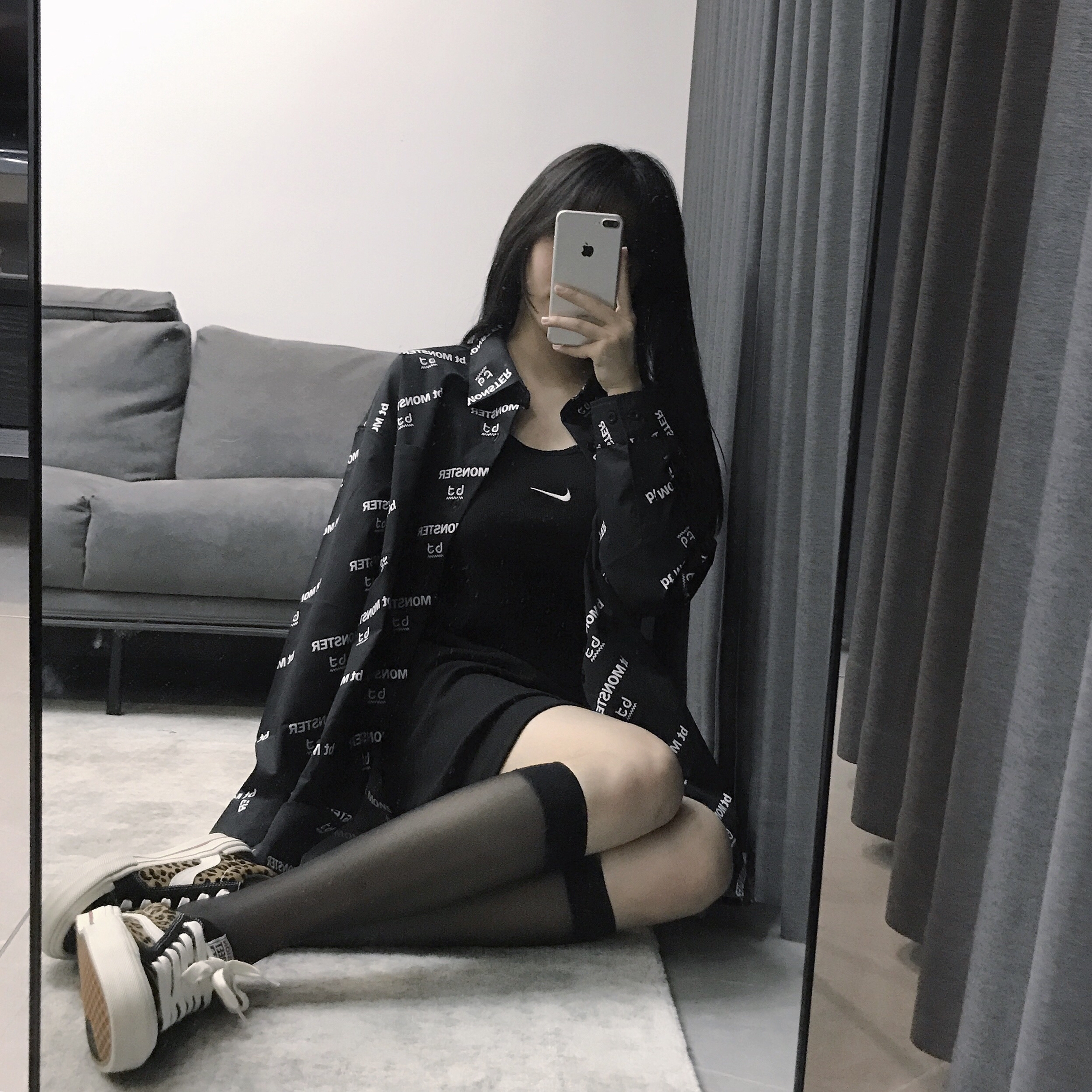 👔:bt 👗:nike 👟:VisionStreetWear 谁说穿裙子就不能酷~ 酷酷的黑色系穿搭 一条简单的吊带裙配上一件满印小logo的黑色衬衫 简约又帅气 搭配衬衫很适合有点肉肉的女孩子 显瘦遮肉满分!感谢VSW~这双板鞋的脚感真的无敌 可以说是穿过最舒服的帆布鞋了 独特的品牌设计搭配上豹纹图案 谁穿谁帅