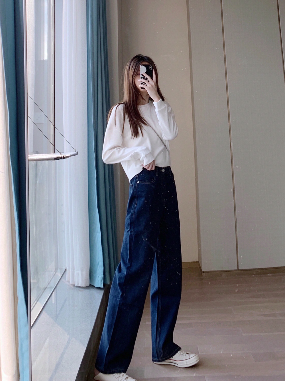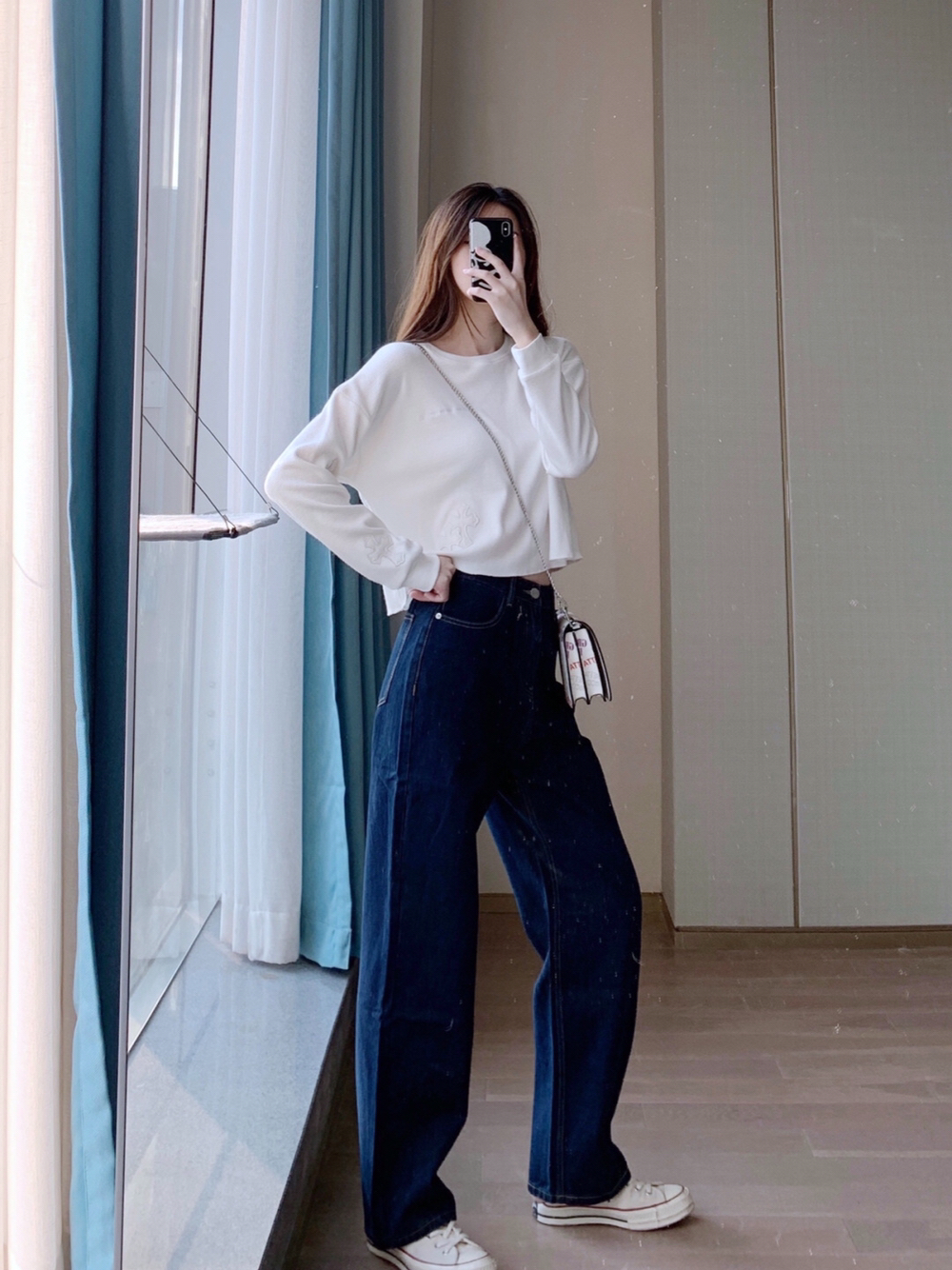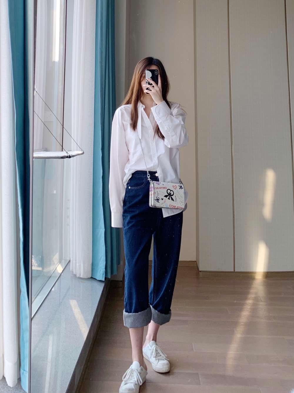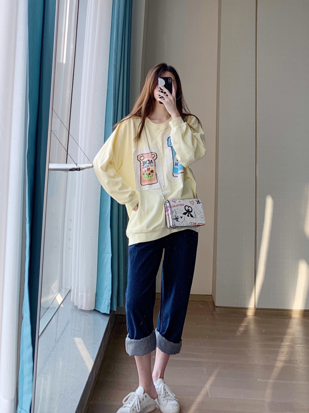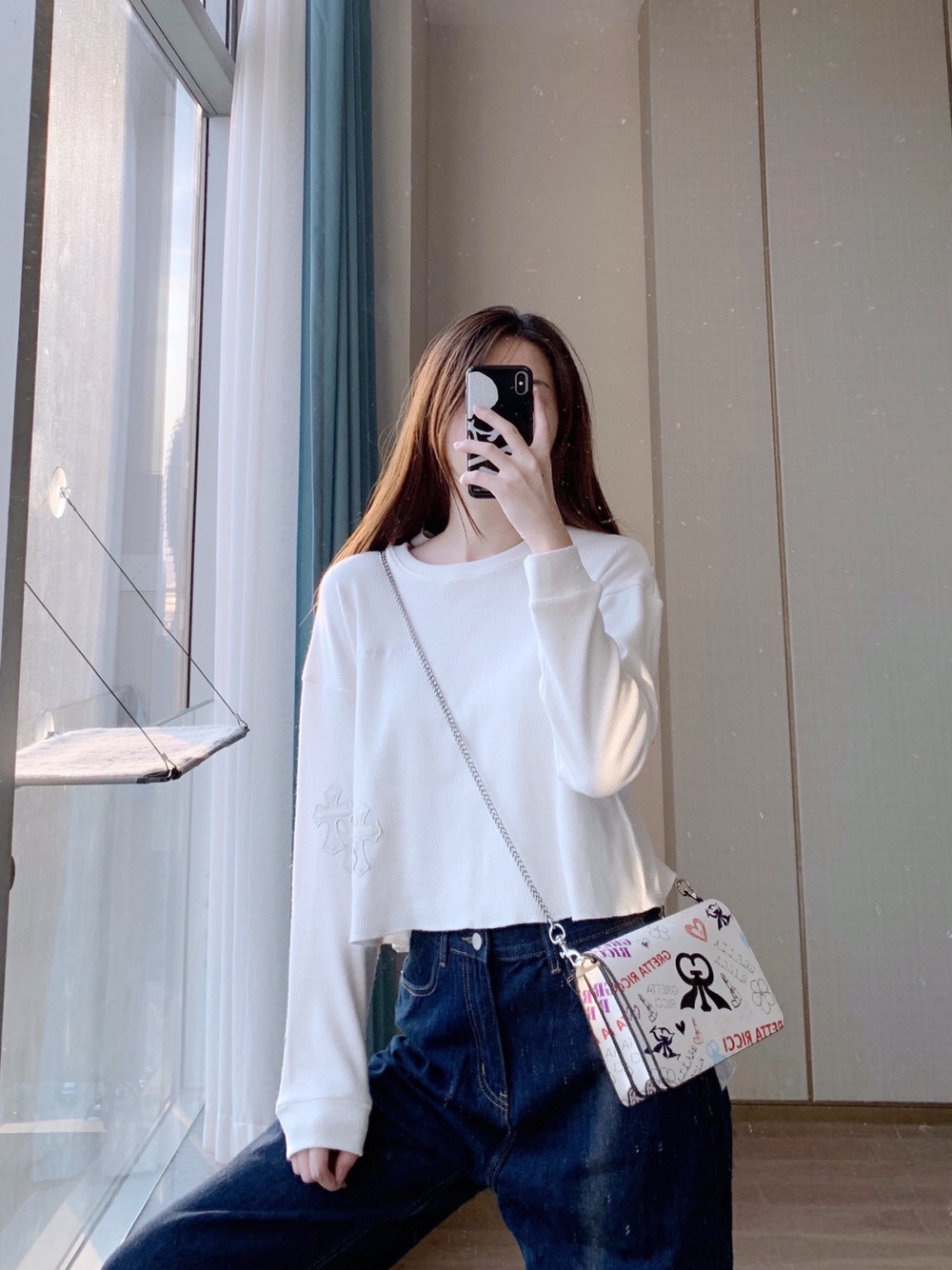 一条阔腿牛仔裤真的可以顶两条 因为裤边一卷就变成一条新的不一样的裤子了 短上衣配长裤,腿直接长到没边 卷边后可以配宽松上衣,超显嫩! 配了个涂鸦风的链条包~ 这种休闲的风格 就需要一个少女感的链条包来配哇! 链条比较显年轻,涂鸦风格很显少女🤩 ғʀᴏᴍ 纯小耗.