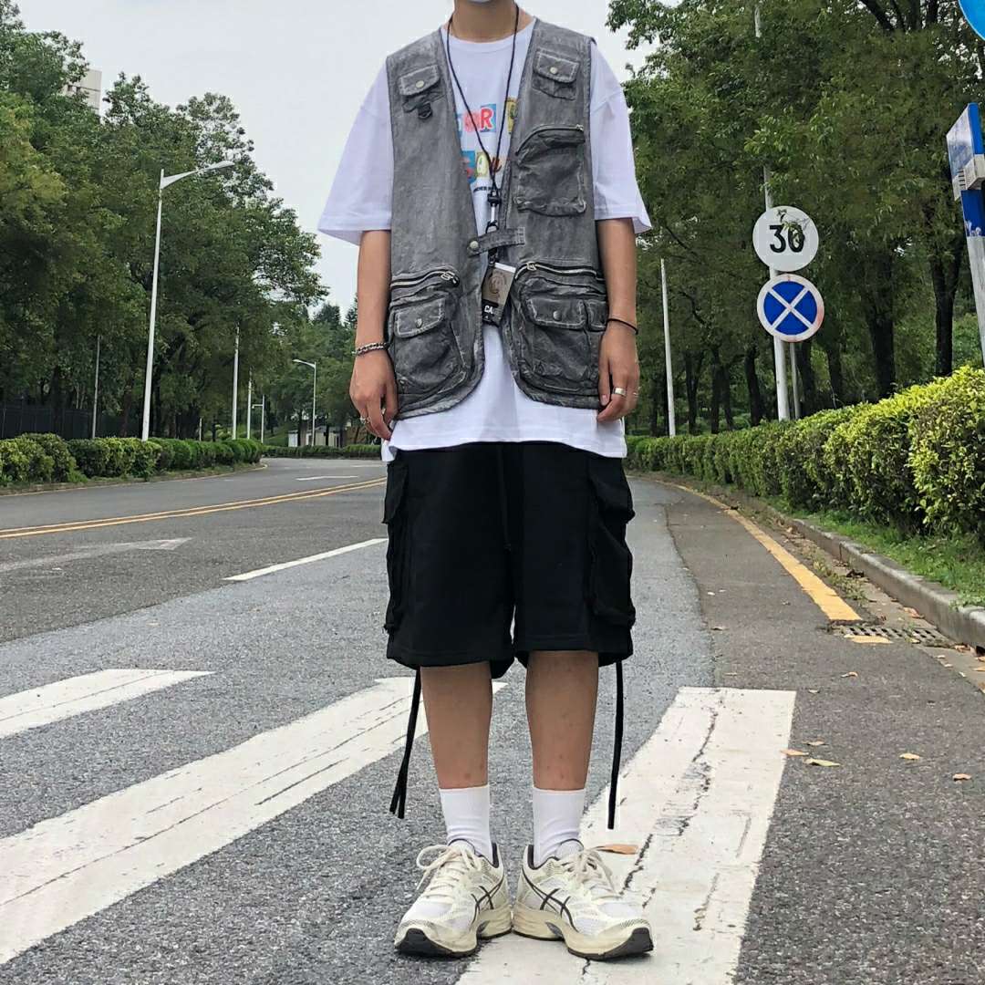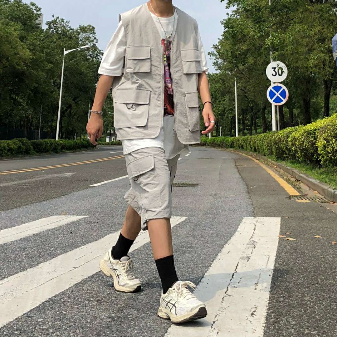 第3️⃣套:整体一套浅色系穿搭 裤子和马甲为同款同色 均是机能工装风格 内搭白色t恤与白色鞋子呼应 黑色袜子突出层次 整体颜色和谐 看上去舒服干净 脱掉马甲 白色t恤与裤子鞋子依旧成搭配状态 一举两得