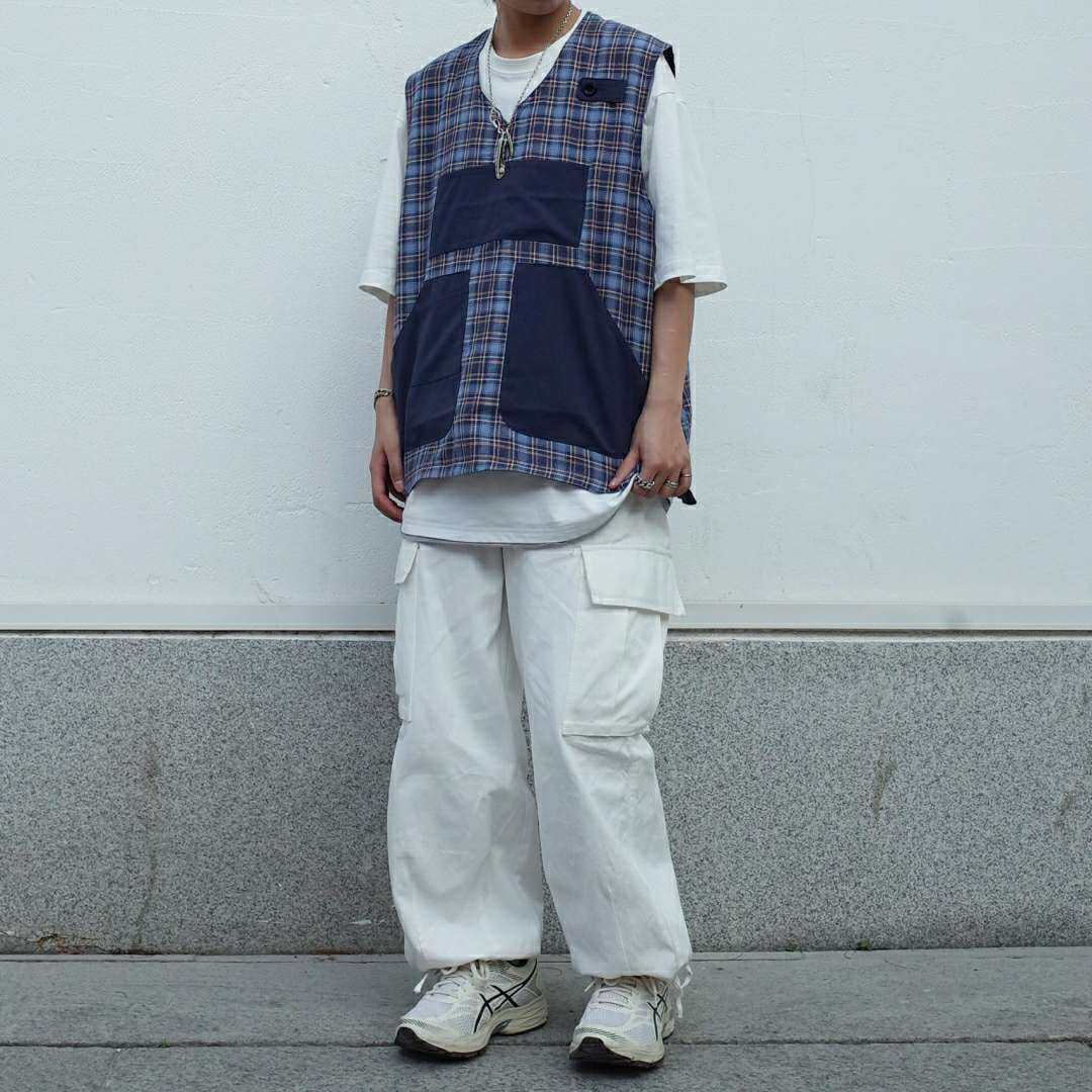 第4️⃣套:全身以白色为主色调 裤子鞋子短袖全部选择了白色 外搭一件蓝色格子马甲令整体不那么单调 蓝色和白色的组合让人觉得干净又清爽 脱掉马甲 一身白色其实也可以很好看 不信你试试