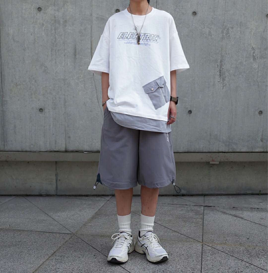 第6️⃣套:浅色系灰白穿搭 上衣是一件白色拼接灰色下摆的假两件 让你单穿t恤的同时也拥有层次叠穿感并且不那么热 裤子是一条灰色的城市机能风短裤 面料是速干的 非常适合夏天 鞋子袜子依旧是白色标配