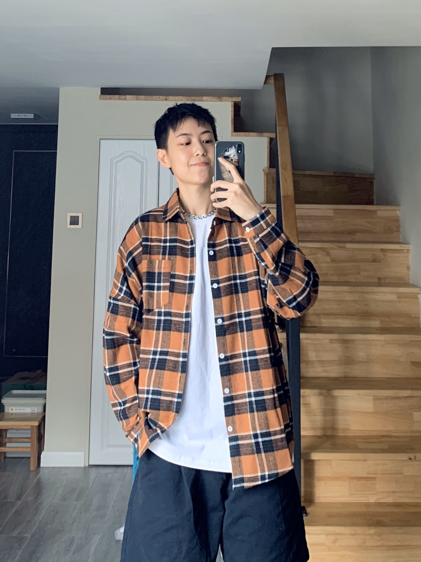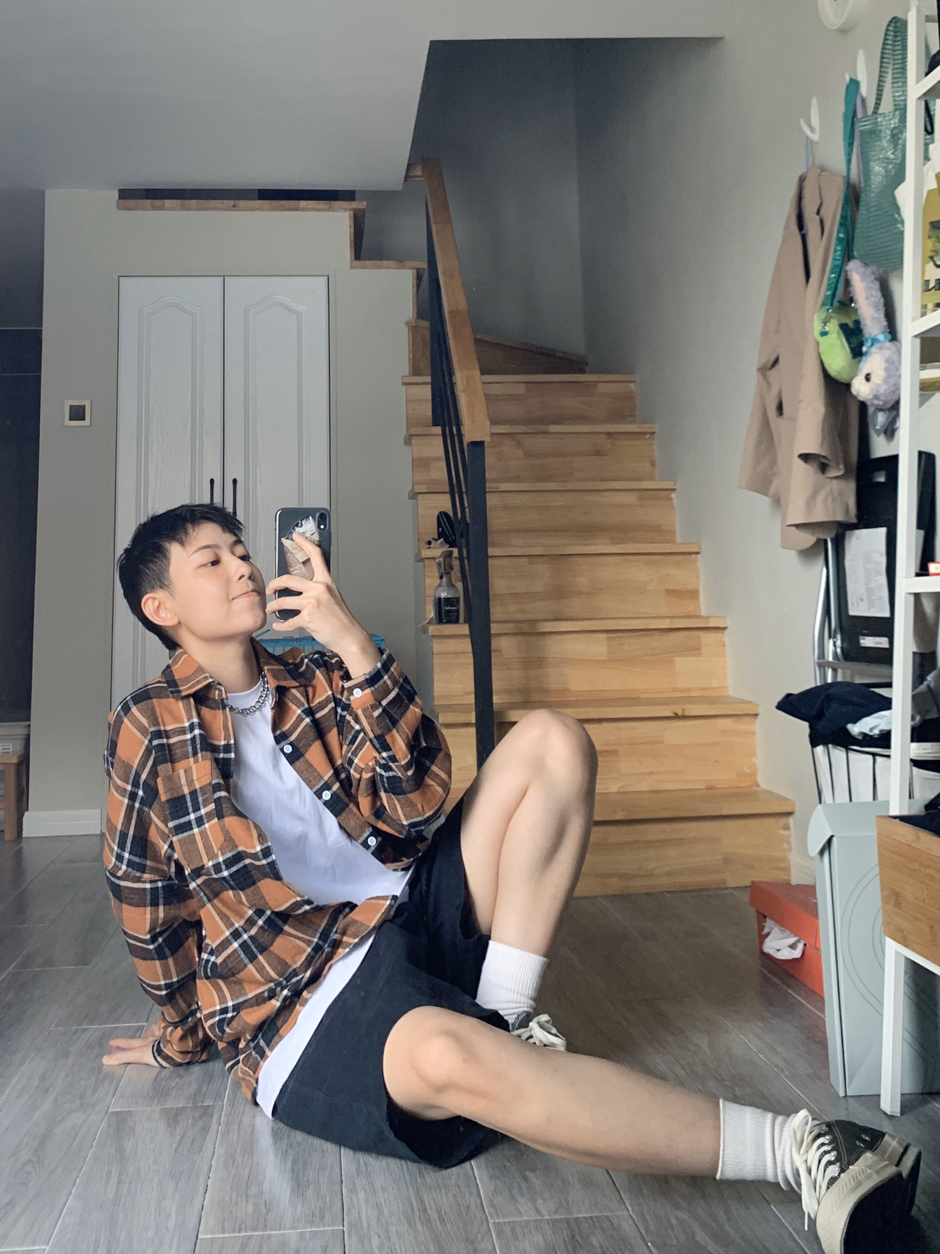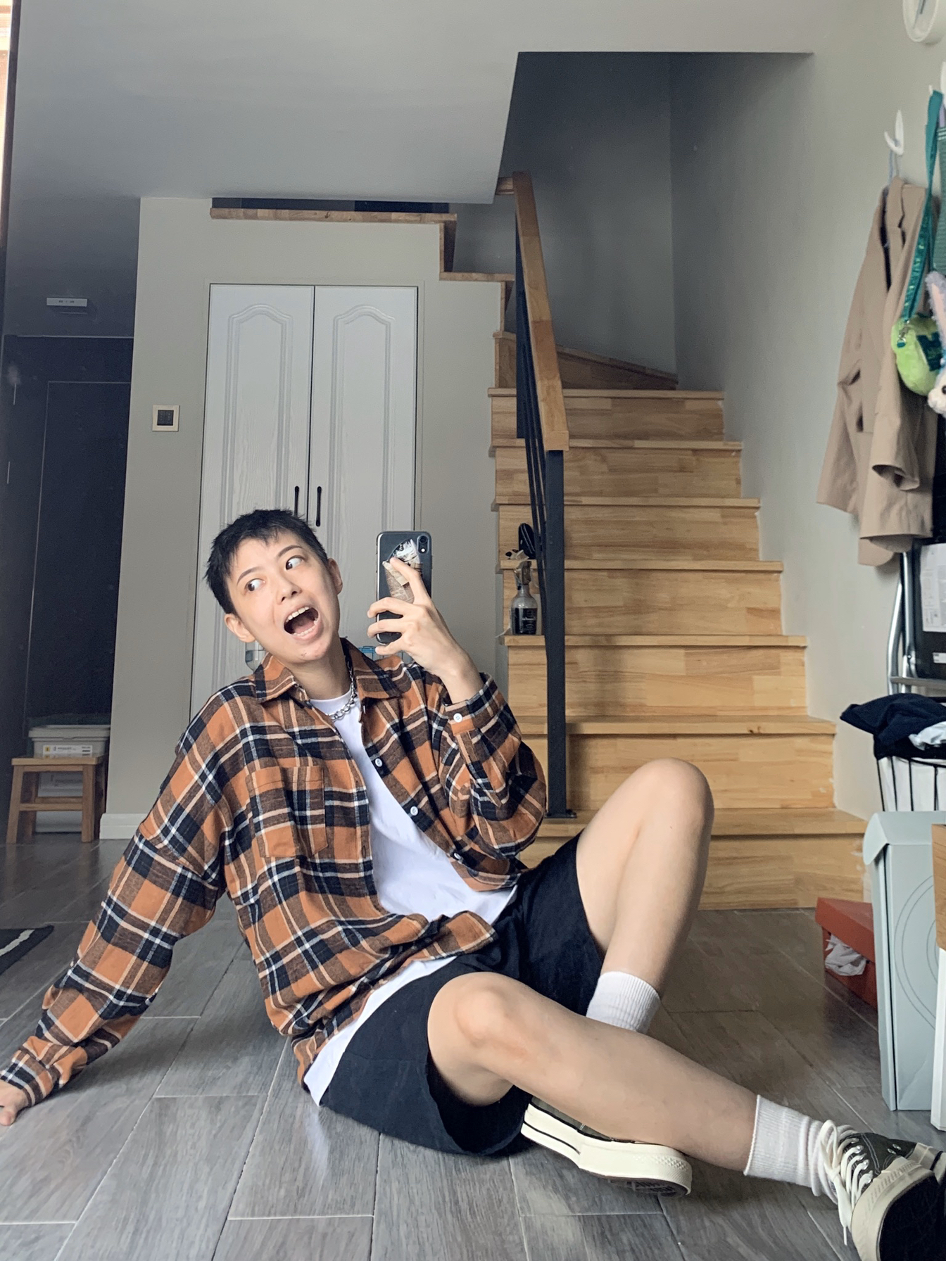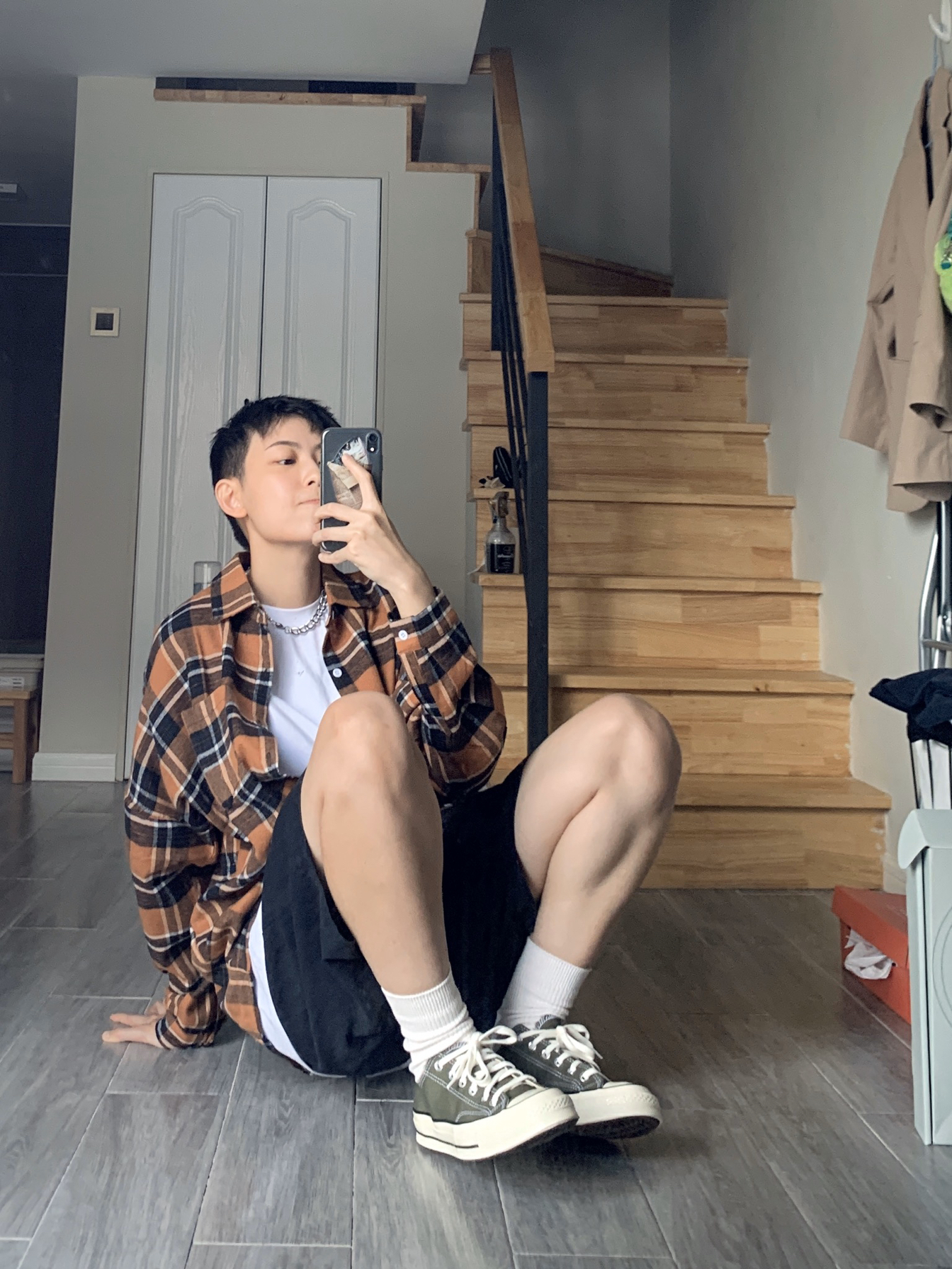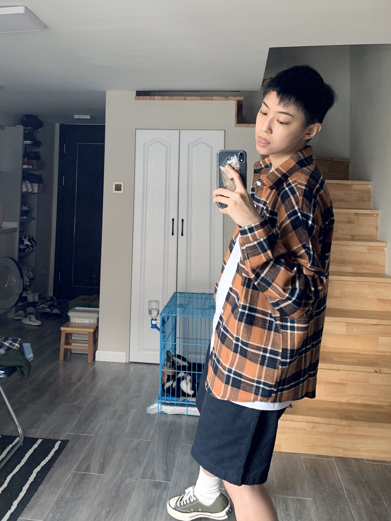 🎃 hi 这里小贾,身高168体重51。 - 今天是我最爱的上长下短搭配,夏天穿太热,早秋来穿就很合适。薄款磨毛衬衫软软的,上身不闷还很好rua,低饱和暖橘色,黑黄皮穿也显白。格纹一直被戏称是程序猿专属,今天要为它平反一下😆 - 🏷️ 衬衫➕打底T➕短裤:CCD 自由商店(M) 🏷️ 袜子:Uniqlo 🏷️ 鞋子:Converse 162060C - 小个子男生穿搭|早秋穿搭|暖男搭配|休闲简约...