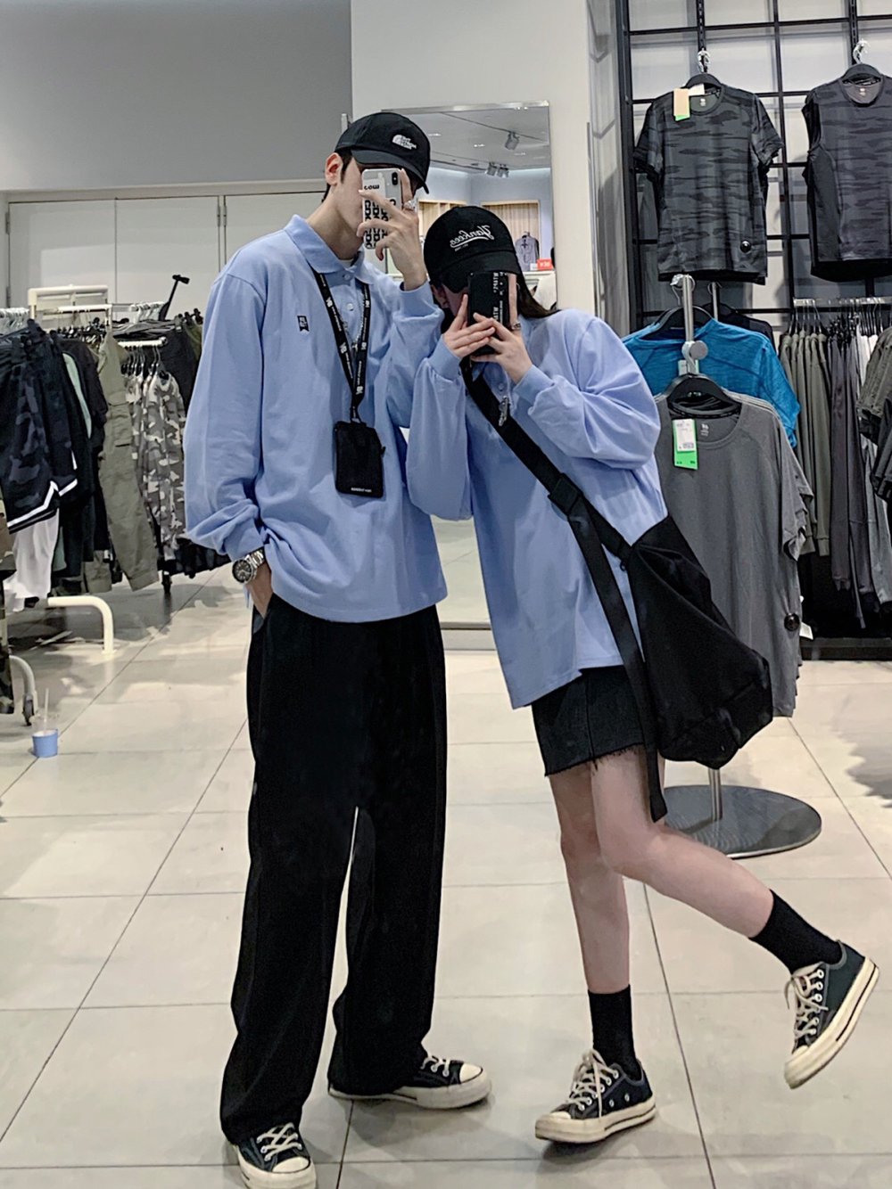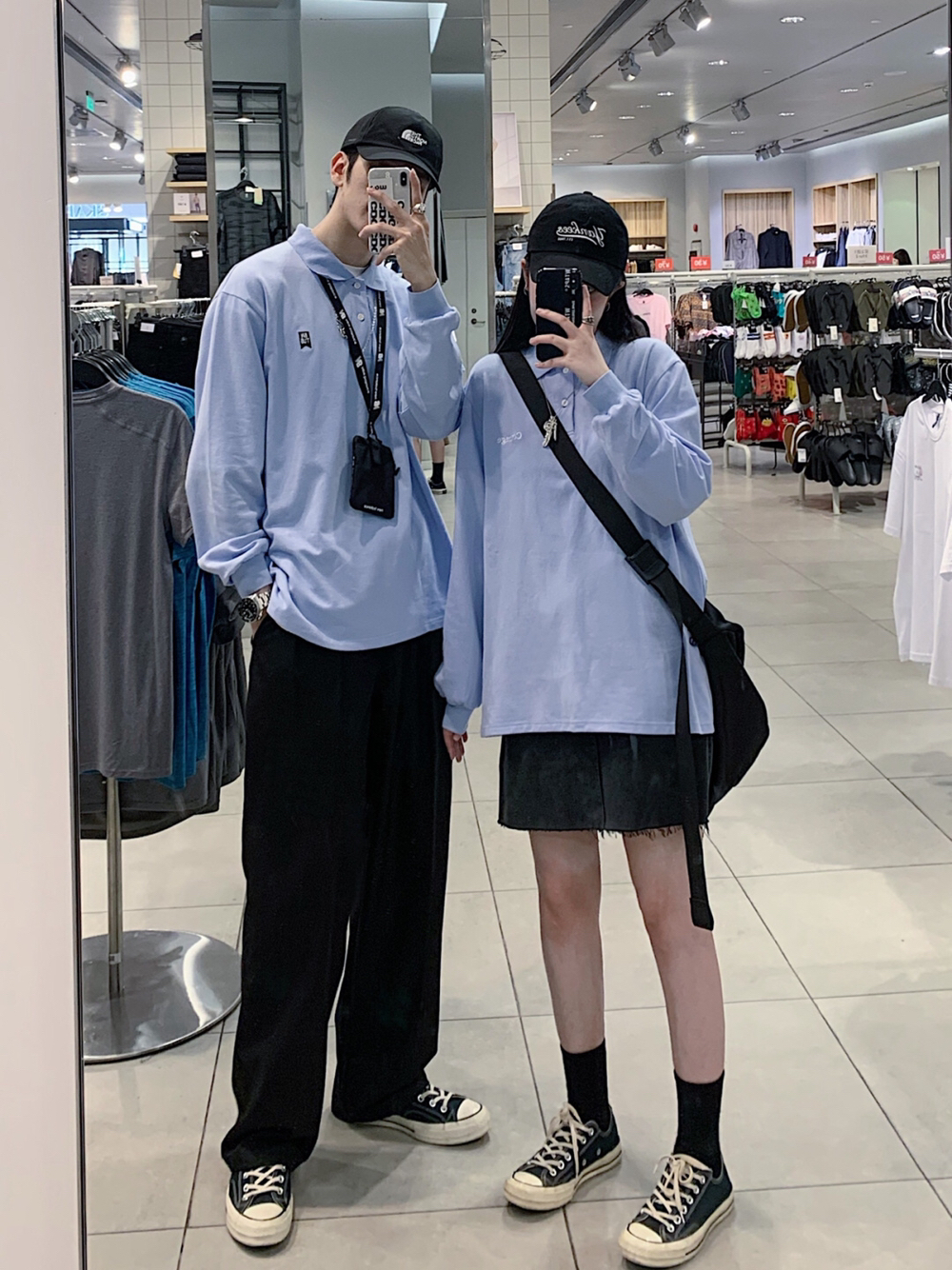 今日份情侣穿搭分享: 👦:上衣是蓝色长袖PoloT恤 版型宽松 下半身搭配黑色西裤长裤👖和黑白色converse 1970s #匡威 Converse[品牌]# - 👧🏻:上半身是蓝色Polo长袖T恤,下半身搭配深灰色小短裙 显高显瘦 鞋子也是搭配黑白色converse 1970s经典款 #匡威 Converse[品牌]# #匡威 Converse[品牌]# - 👫两人都是穿着比较简单的黑色和蓝色...
